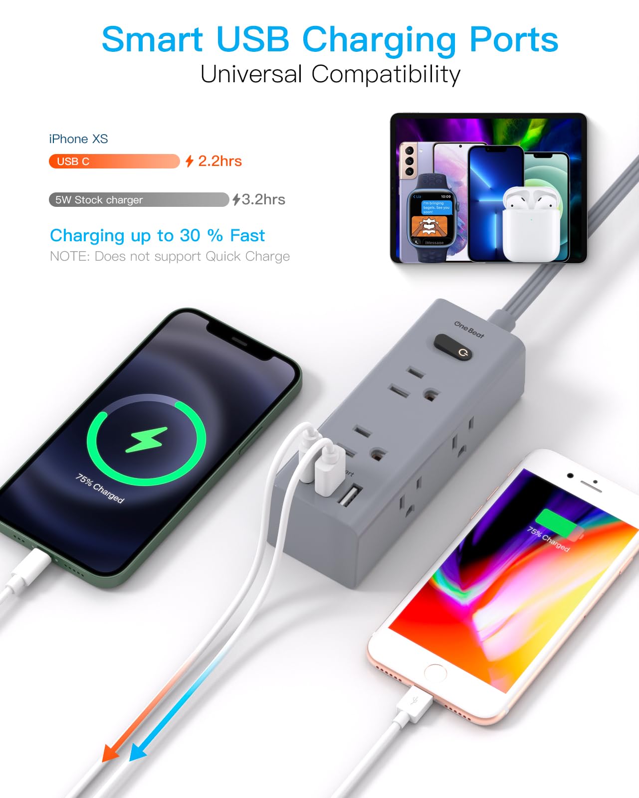 【9-in-1 Extension Cord with Multiple Outlets】Flat power strip could turn 1 sockets into 6 AC outlets 2 USB-A and 1 USB-C, which could charge up to 9 devices at the same time. The USB C port can charge up to 5V/3A. 2 USB-A ports can charge up to 5V/2.4A Max, all USB Ports Output is 5V/4.5A, compatible with your cellphone, laptop, tablet, earphone or cameras without a variety of converters.