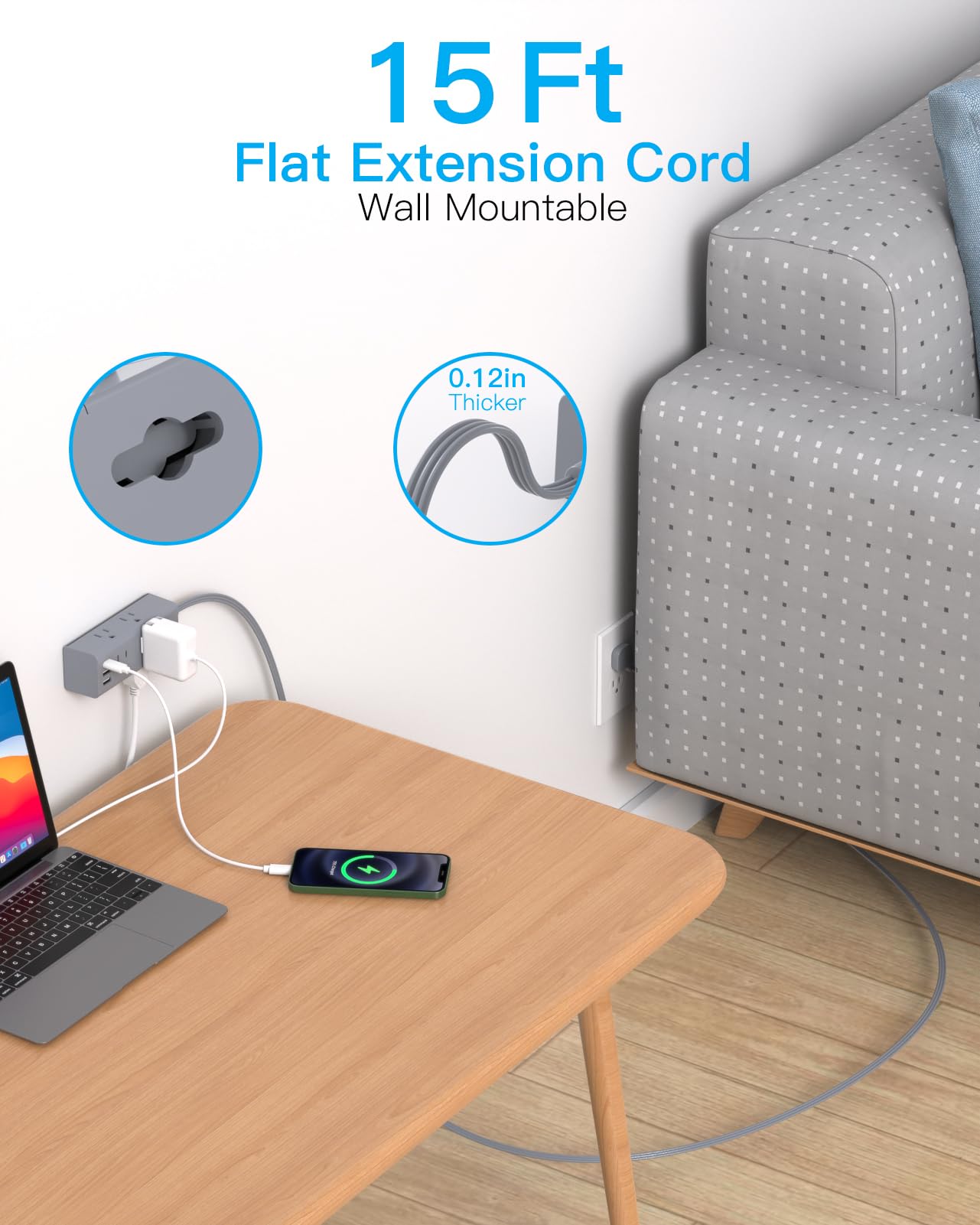 【Ultra Flat Plug Power Strip & 15 Ft Flat Extension Cord】With only 0.35 inch ultra thin plug and 45 degree right angle design, One Beat low profile flat wall plug is mush slimmer than traditional plugs, can close to the wall easily and hide in the back of furniture, bed or refrigerator, no waste for outlet and space. 15 ft extension cord with only 3mm thicker which is made of pure copper, which has better current carrying capacity (15A). Note: The 15FT cable includes the length of the flat plug and a small portion of the cable is buried inside the product body.