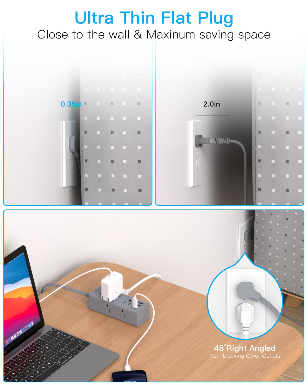 【Flat Wall Adapter & Desktop Power Strip with USB Ports】 The two mounting holes on back allows this power strip to be securely installed in various applications, save your space and make your desktop organized.