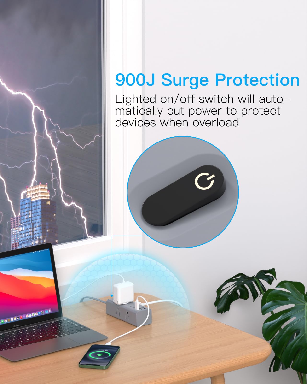 【Surge Protector Power Strip】The electric strip has a 900-Joule energy rating providing a reliable power extension cord to protect your devices and appliances: TV, printers, computer. It secures your electronic devices from overload, short circuit, power spikes, lightning strikes, or fluctuations. (The "SURGE PROTECTED" soft indicator light on to show your devices are protected).