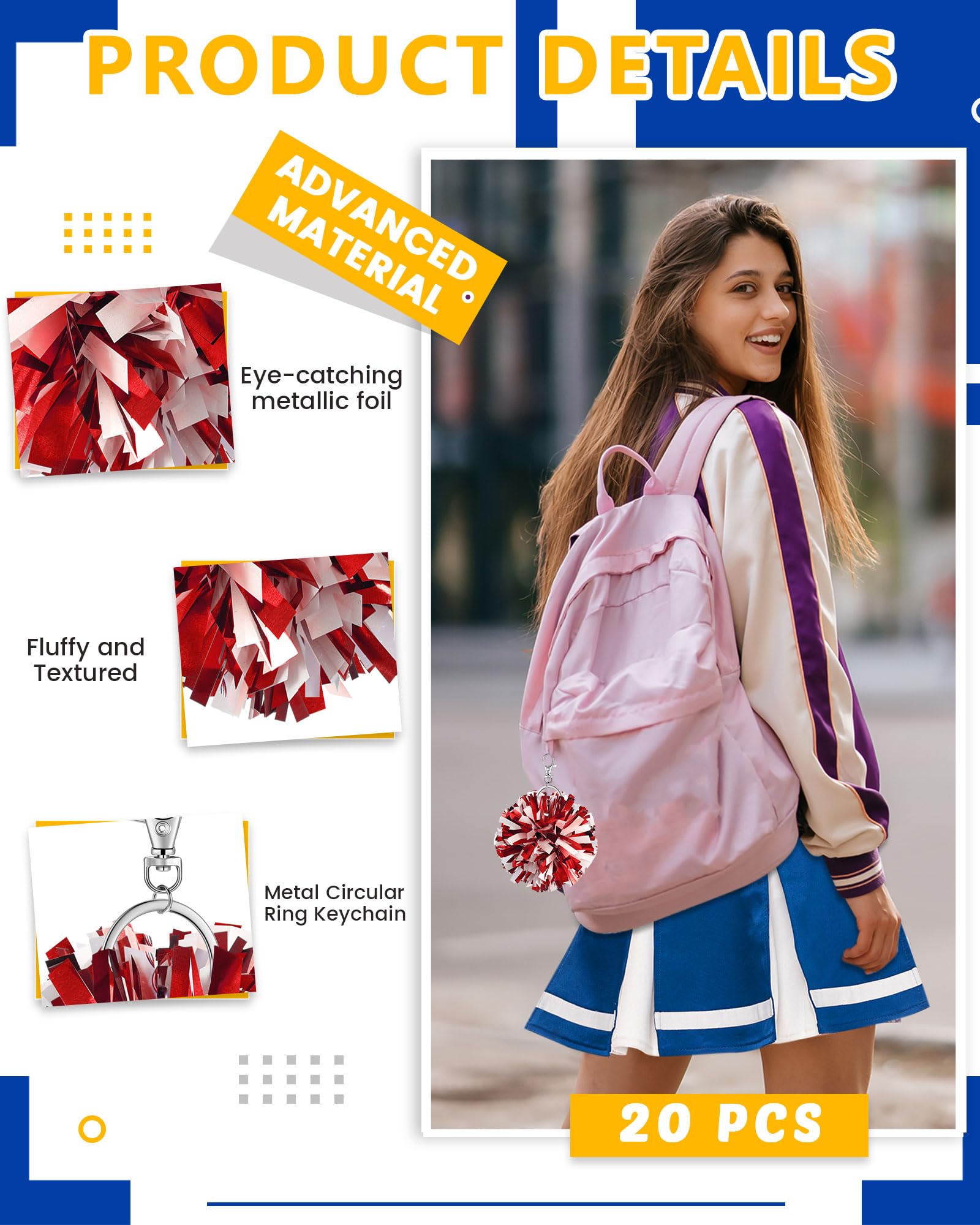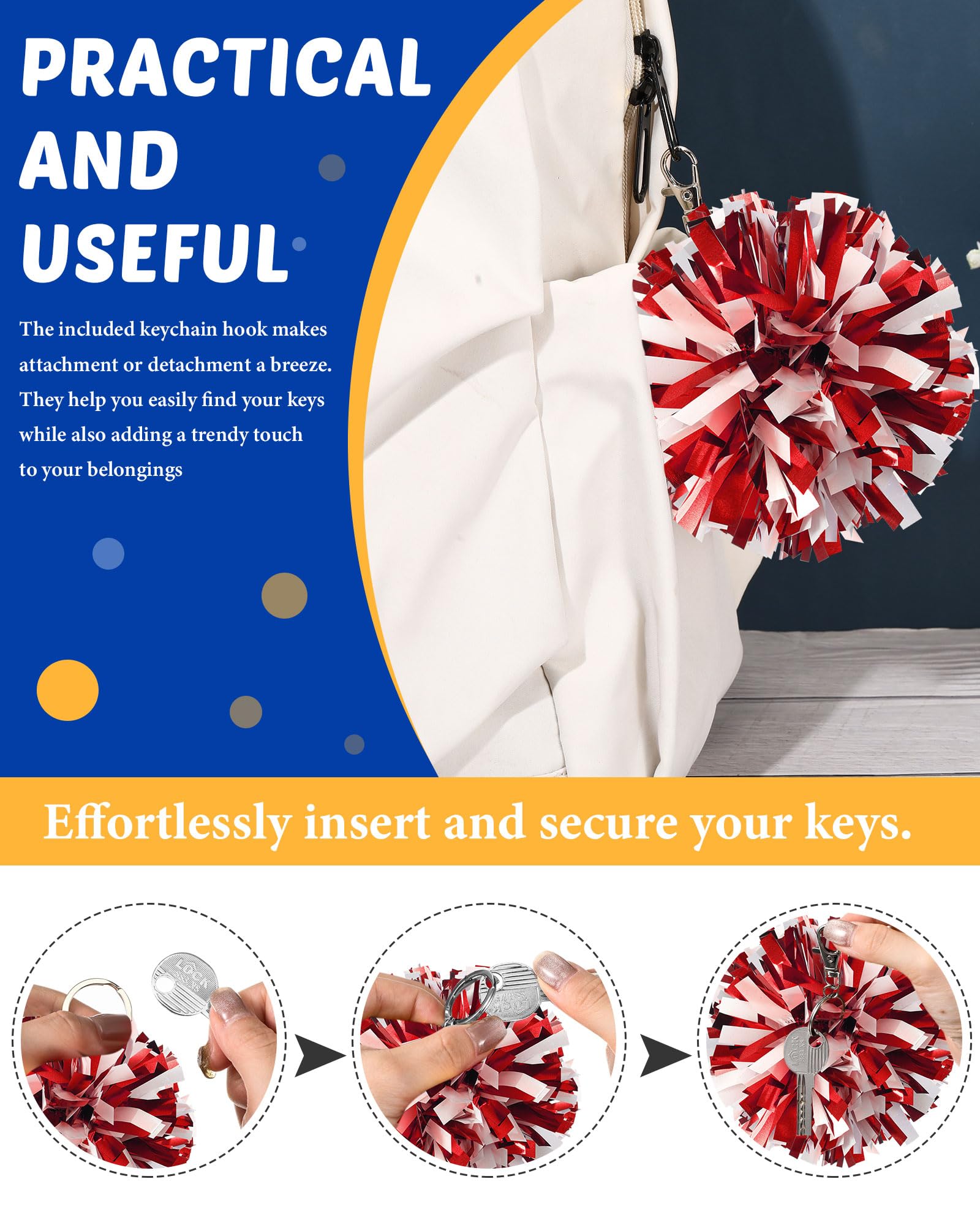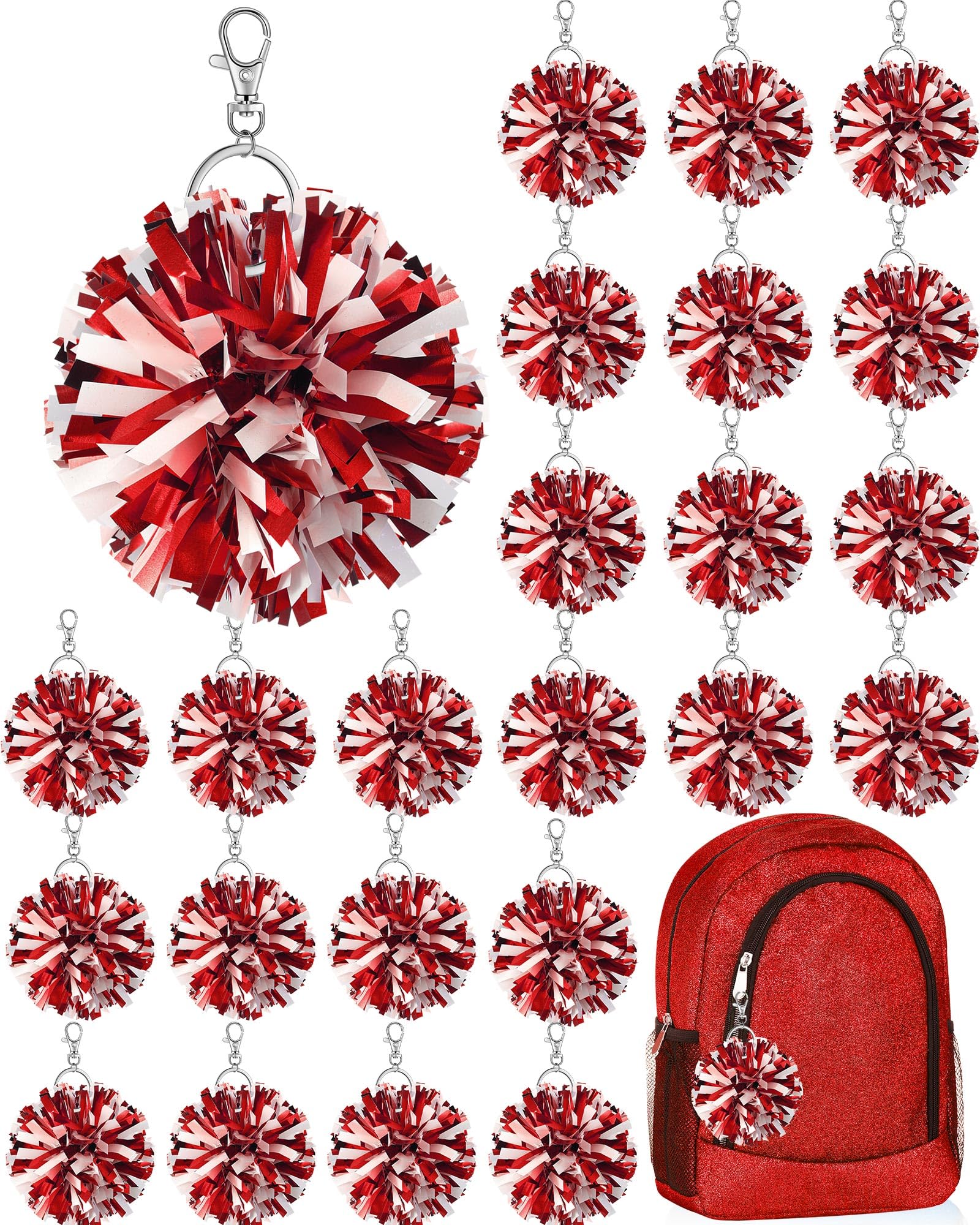 Sturdy Material and Vibrant Colors: these pom pom keychains are made of quality plastic and metal for durability, and feature nonfading, shimmering red and white foil; They catch the eye, boost cheerleading spirit, and show your strong support for the team