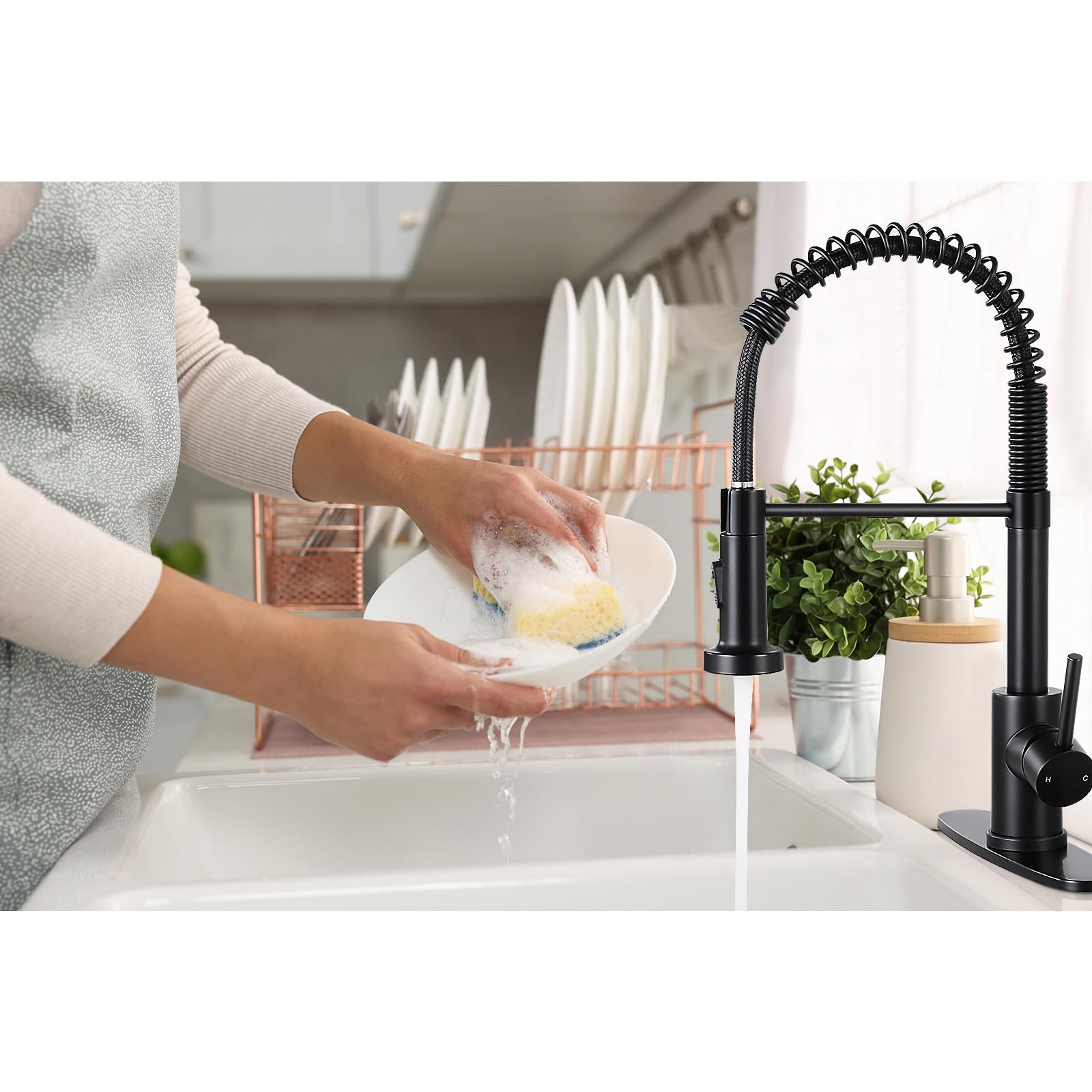 Modern Versatile Dual Ends: High Arc Spring Design Kitchen Commercial Faucet, with the pull-down dual action spray head, allows for your choice of aerated flow or powerful spray for all your needs, suitable for home kitchen sink farmhouse RV vessel basin. Coming in an array of colors that match any aesthetic for home decor and using with DJS kitchen faucet. Dual water dispensers for multiple choices.