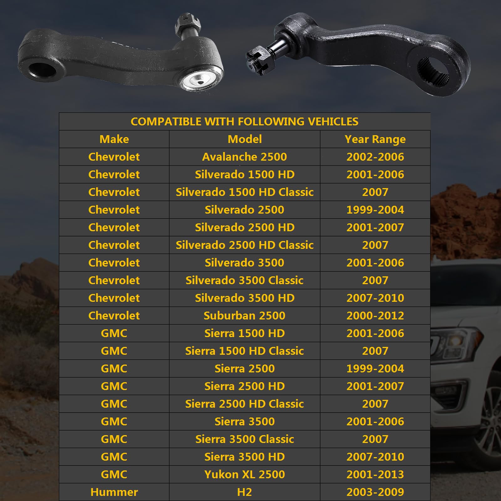 Pitman idler arm fit for Chevrolet Avalanche 2500 2002-2006, Silverado 1500 HD 2001-2006, Silverado 1500 HD Classic/Silverado 3500 Classic 2007, Silverado 2500 1999-2004, Silverado 2500 HD 2001-2007, Silverado 3500 2001-2006, Suburban 2500 2000-2012, also fit for GMC Sierra 1500 HD 2001-2006, Sierra 1500 HD Classic/Sierra 2500 HD Classic 2007, Sierra 2500 1999-2004, Sierra 3500 2001-2006, Sierra 3500 Classic 2007, Sierra 3500 hd 2007-2010, Yukon XL 2500 2001-2013, fit for Hummber H2 2003-2009.