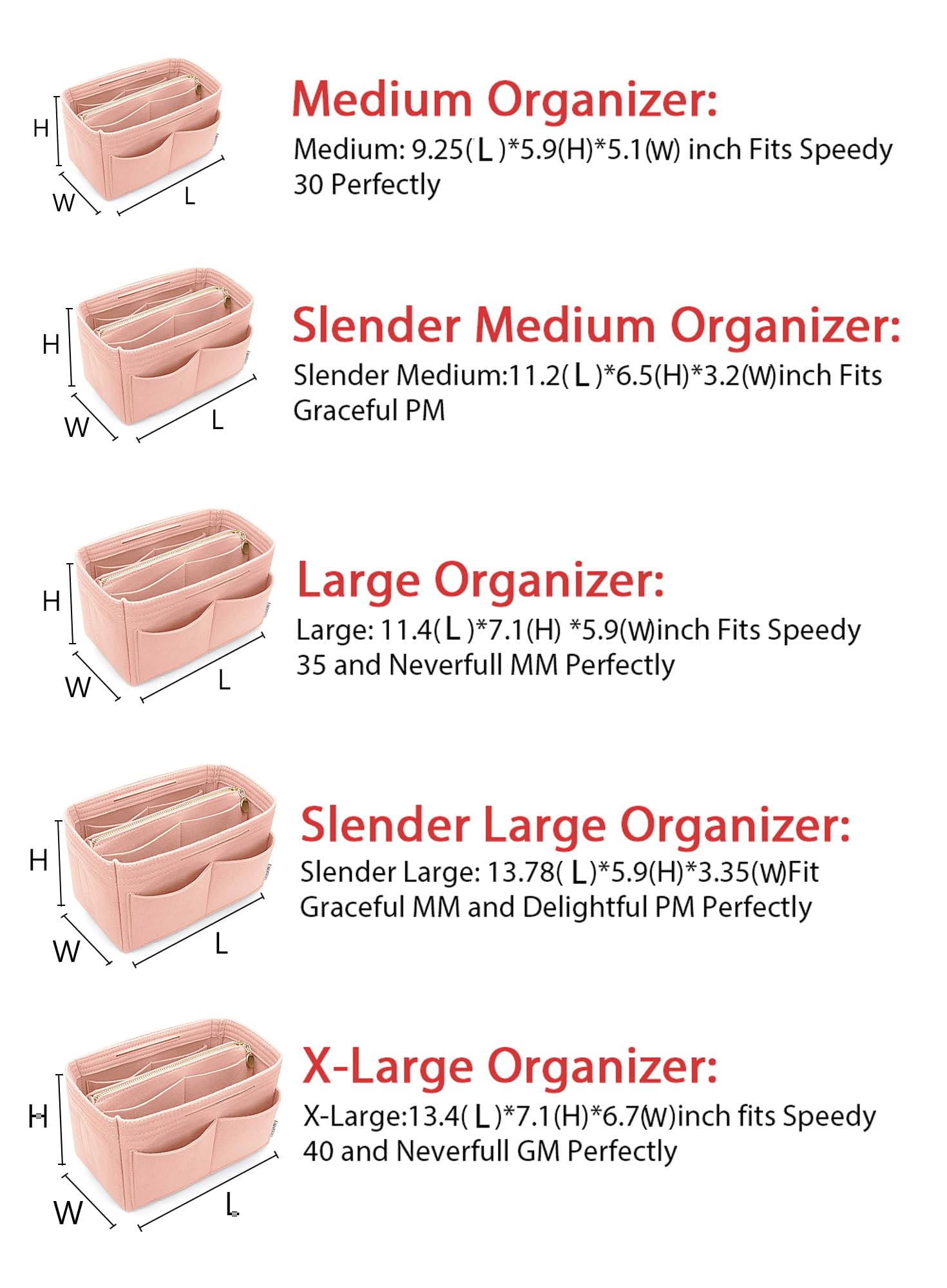 SIZE OF BAG ORGANIZER: Medium: 9.25(L)*5.9(H)*5.1(W) inch Fits Speedy 30 Perfectly. Slender Medium: 11.2(L)*6.5(H)*3.2(W)inch Fits Graceful PM. Large: 11.4(L)*7.1(H) *5.9(W)inch Fits Speedy 35 and Neverfull MM Perfectly. Slender Large: 13.78(L)*5.9(H)*3.35(W)Fit Graceful MM and Delightful PM Perfectly. X-Large:13.4(L)*7.1(H)*6.7(W)inch fits Speedy 40 and Neverfull GM Perfectly. Portable and Compact Purse Perfectly For any Brand.L*H*W means (Length*Height*Width)