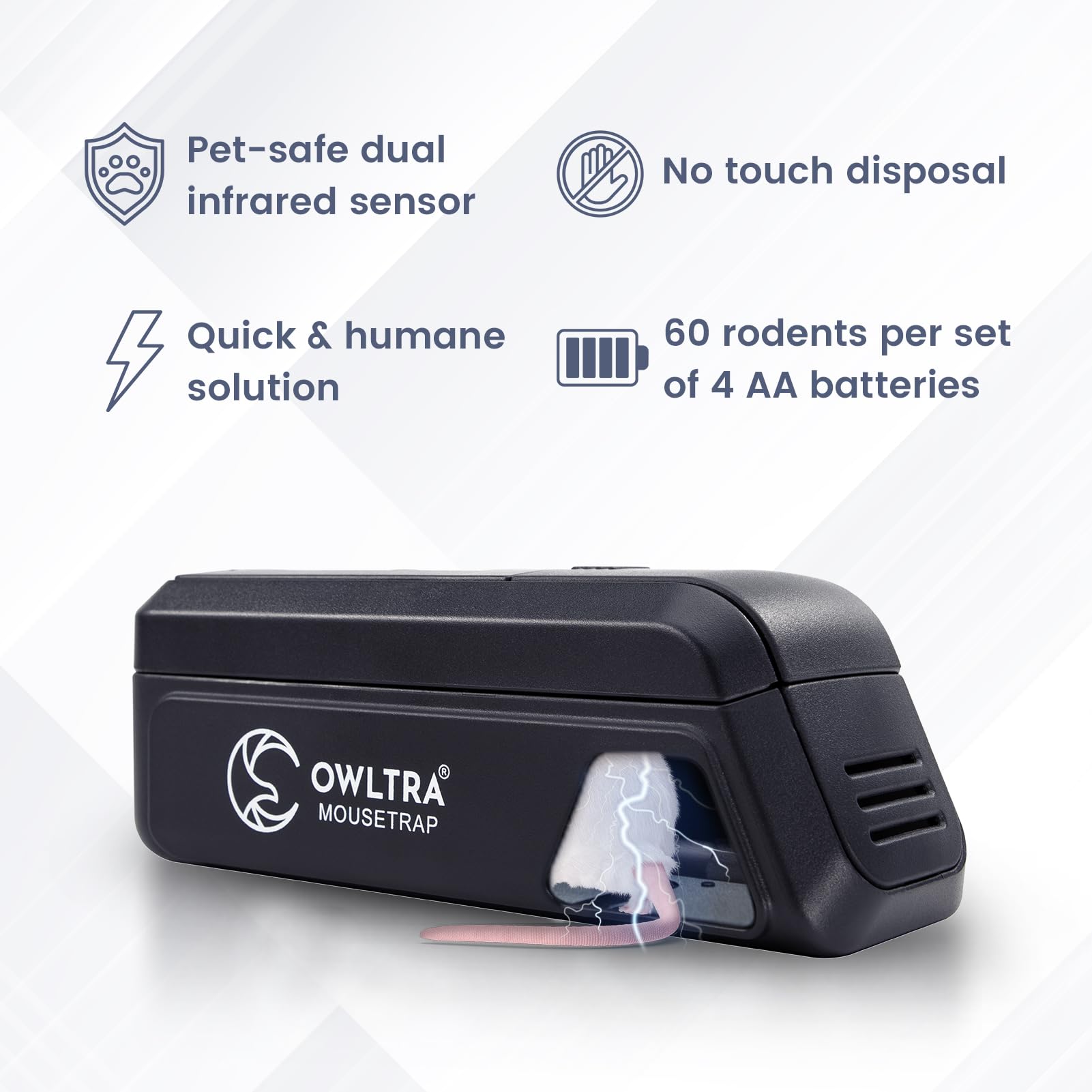 The Humane Solution: Owltra is the humane solution for getting rid of rodents. A set of 4AA batteries exterminate 60 rats; Infrared sensor & no escape design keep rodent in place and generate 6,000 to 9,000 high voltage shock for quick elimination.