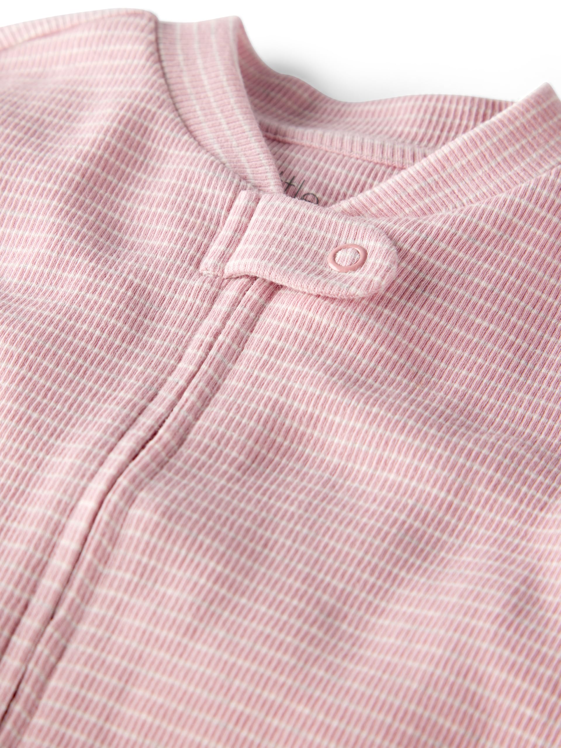 Super soft organic ribbed binding. Built-in footies, no grippers.