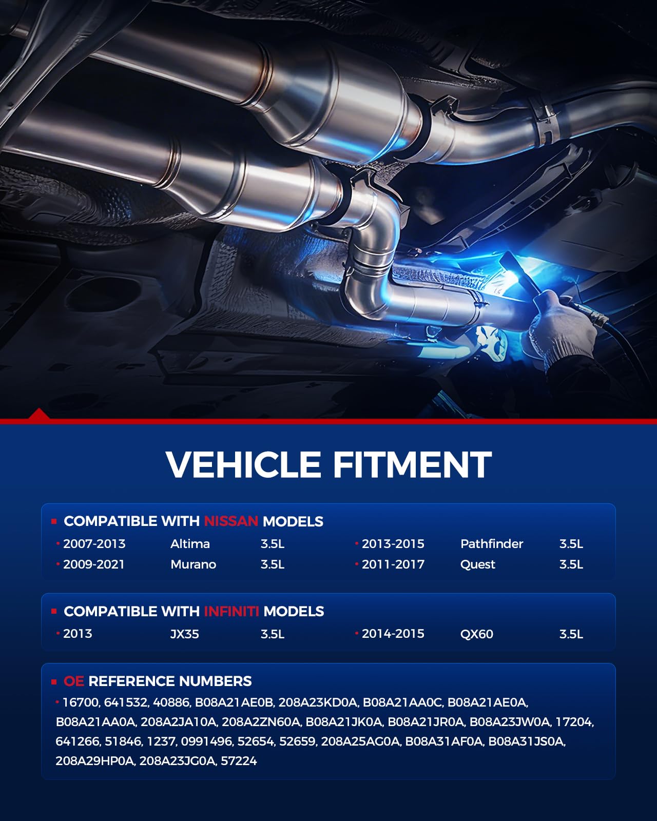 Vehicle Fitment: KAX Direct-Fit Catalytic Converter Compatible with Nissan, INFINITI Murano 3.5L 2009-2021, Pathfinder 3.5L 2013-2015, Altima 3.5L 2007-2013, QX60 3.5L 2014-2015, Quest 3.5L 2011-2017, JX35 3.5L 2013
