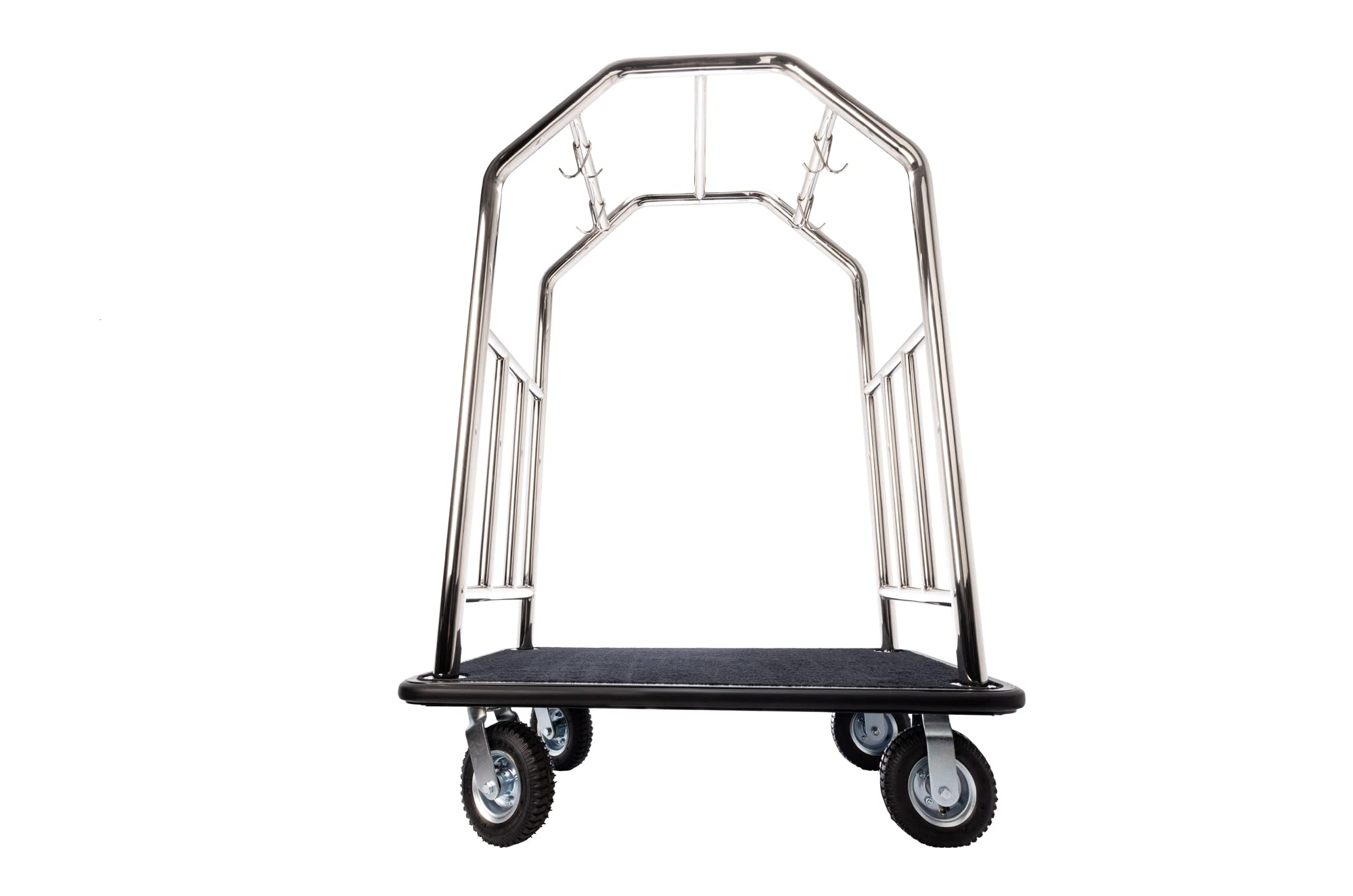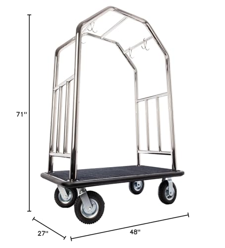 PERFECT FOR HOTEL, RESORTS, AND LARGE EVENTS: This stainless steel bellman cart is a great choice for hotels, valet services, and resorts. The welded steel frame ensures durability, while the roller wheels and carpeted deck offer smooth handling. Designed for travel and event use, it accommodates compact and heavy luggage, making it a must-have for any high-traffic setting.