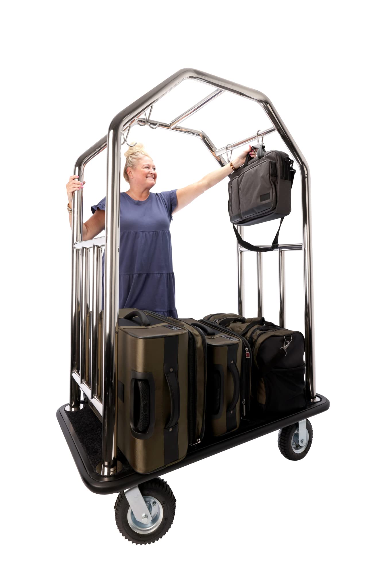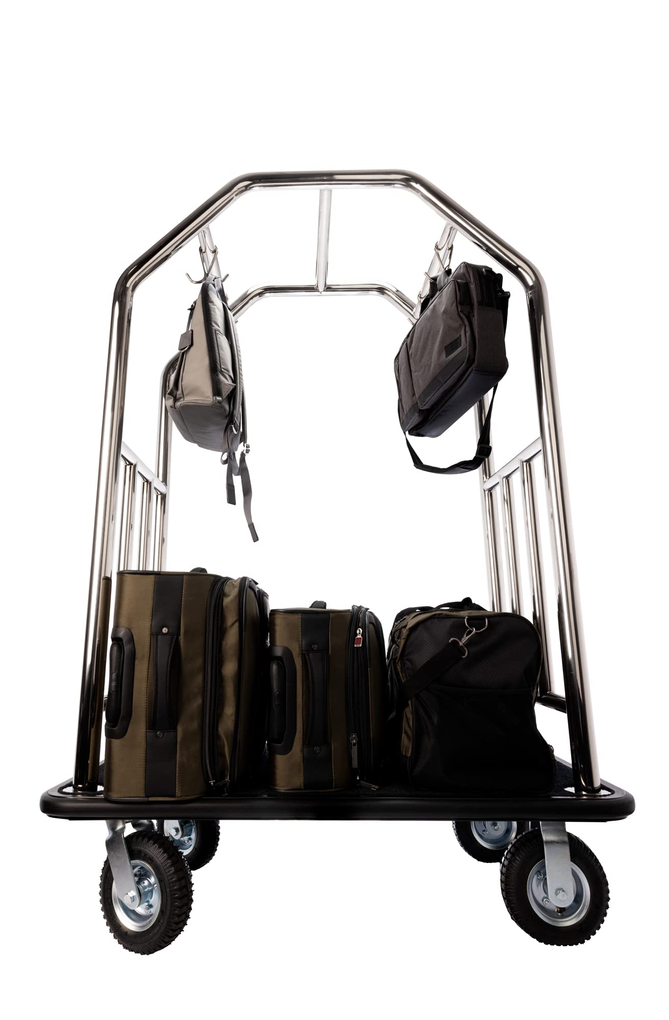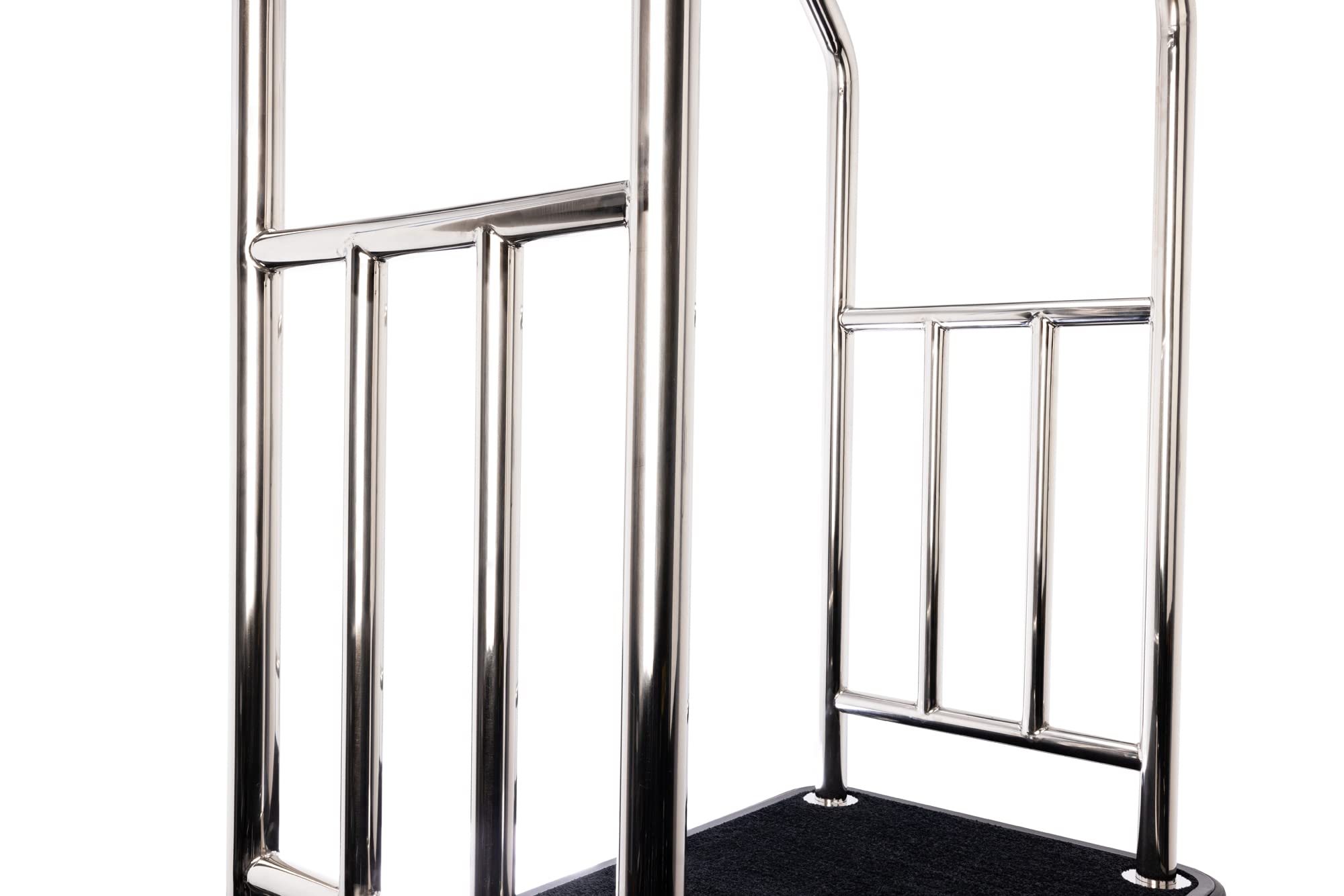 HEAVY-DUTY WELDED STEEL FRAME: This bellman cart features a stainless steel welded frame, built for durability in hotels, resorts, and large events. The heavy-duty design supports high-capacity loads while maintaining a sleek, professional look. Ideal for moving luggage and supplies efficiently, its sturdy frame ensures long-lasting reliability in busy environments.