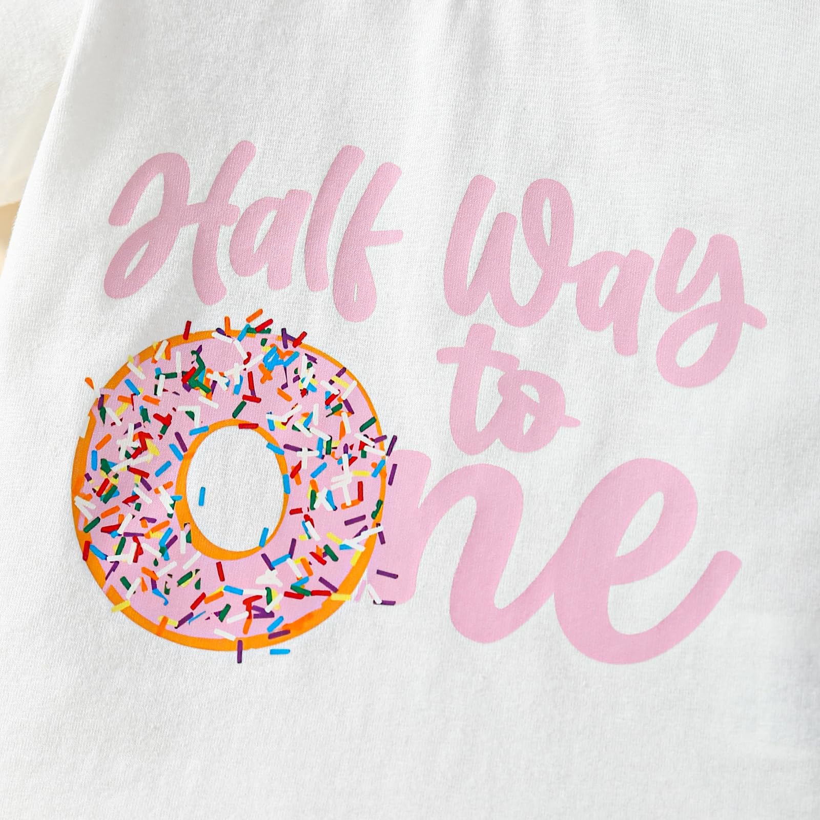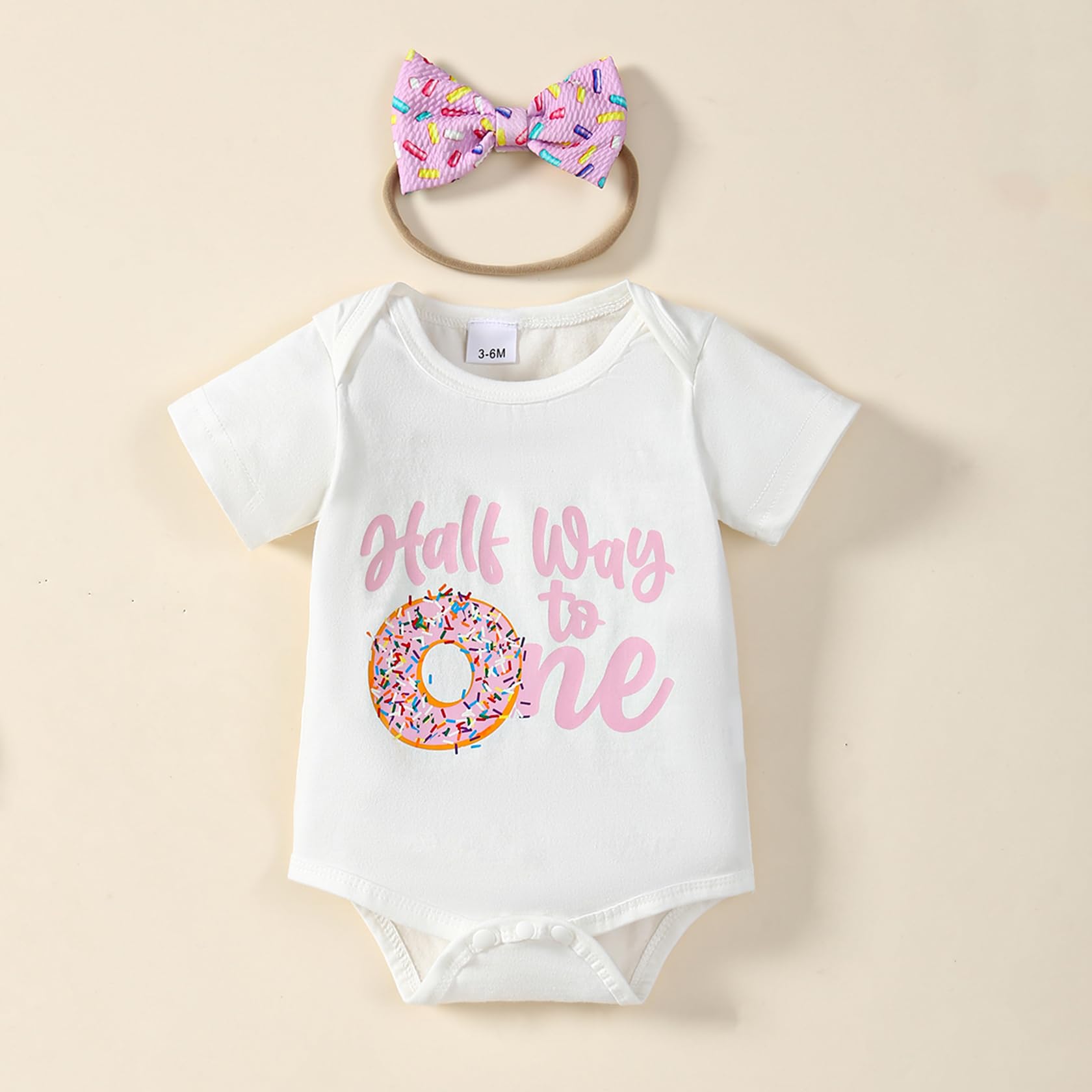 Design: stylish Half Way to One, with cute donut shorts, fun Half Way Around the Sun, with Sun print shorts. Best Gift for Darling's first birthday!