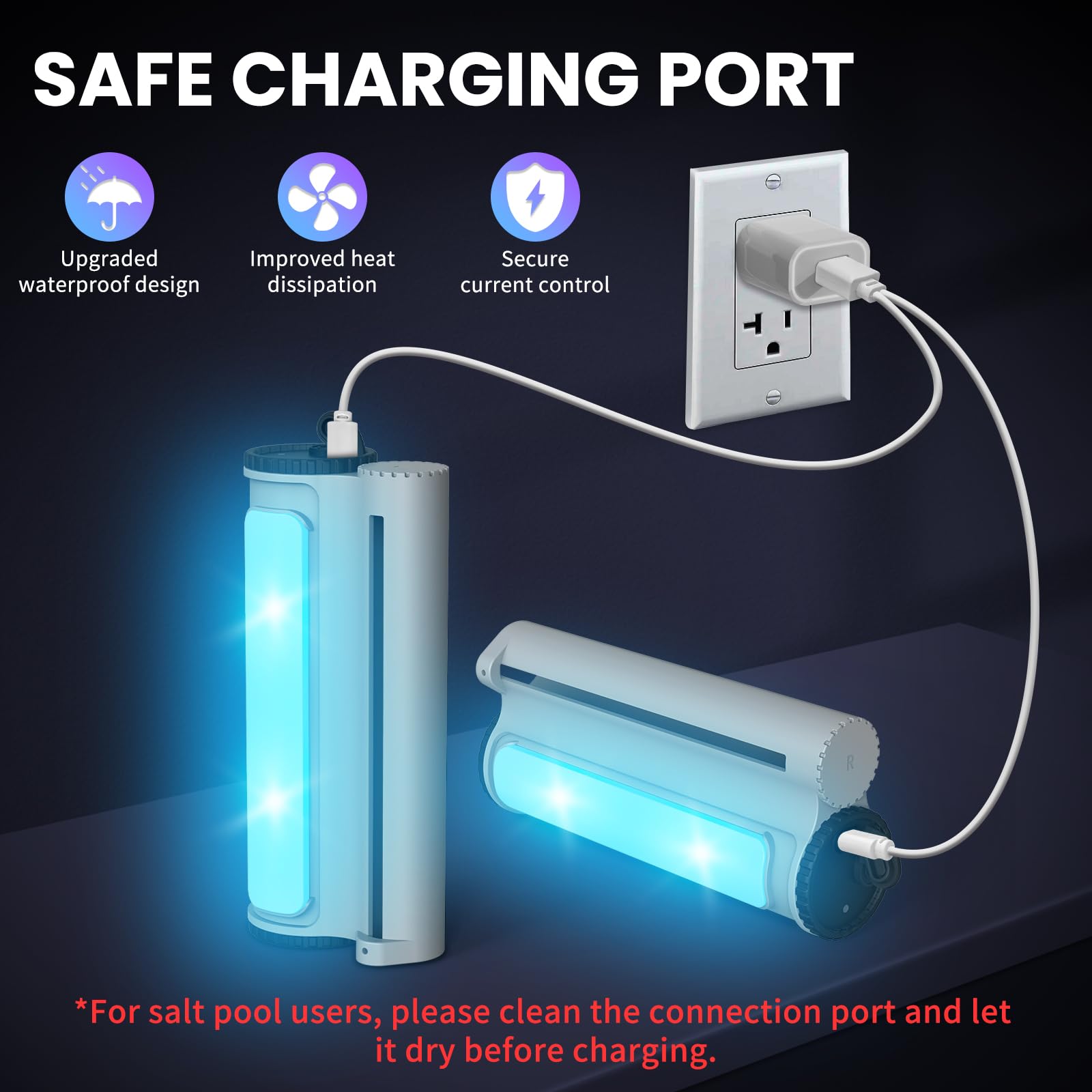 🔋COST-EFFICIENT & OPTIMAL LIGHTING PERFORMANCE - KLLEYNA pool fountain lights designed with low energy consumption, each charge for the 5200mAh battery uses only 0.012 kWh, meaning 1 kWh of electricity can fully charge two light heads up to 10 times. This energy-efficient operation maintains optimal illumination performance while conserving resources
