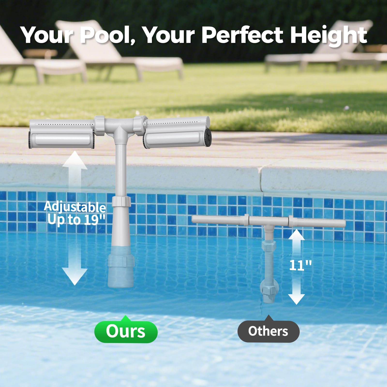👑UNIQUE DESIGN - Telescopic pipe design to adjust fountain height from 15 to 22 inch, not like others the highest at 15 inch only or need to add and extra part. The adjustable pipe design allows your to set the favorite height for your pool. Keep the fountain heads always remain above the water, rather than submerged in the water