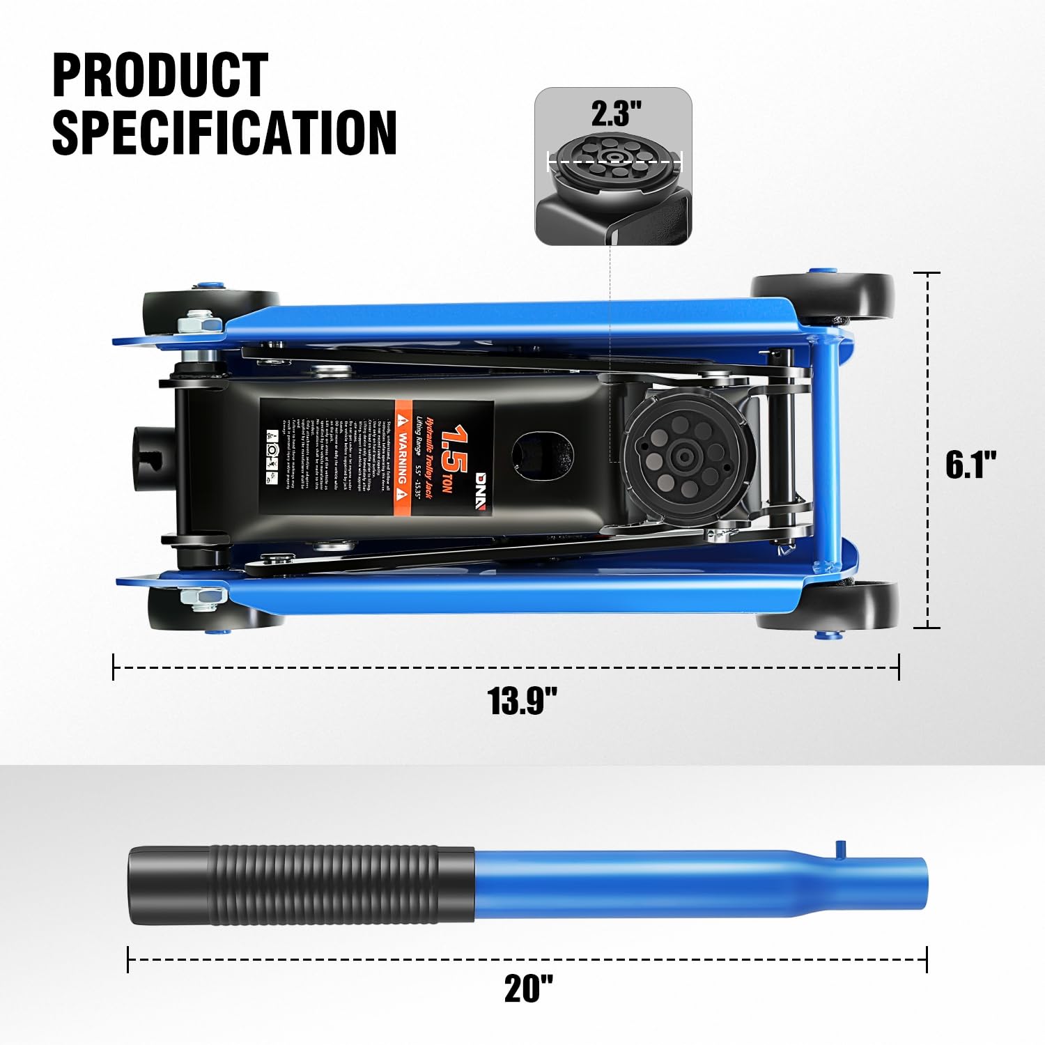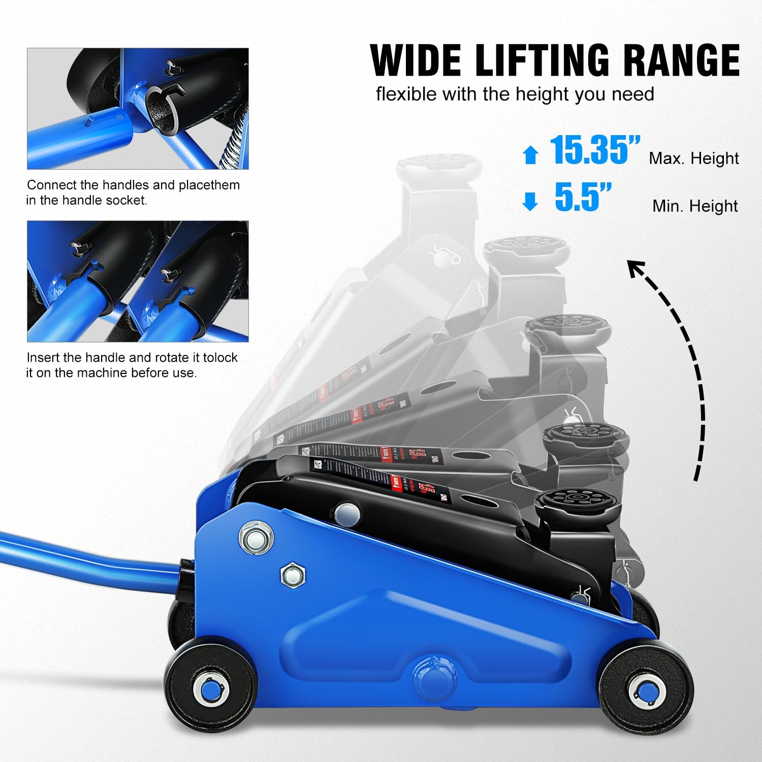 SPEEDY LIFT GARAGE JACK - This Hydraulic Floor Jack features a 1.5 ton (3,000 lb) capacity with a min lifting height of 5.5" and a max height of 15.35". Piston pump allows you to easily lift the jack up to desired height. It is great for garage service and heavy-duty industrial use.