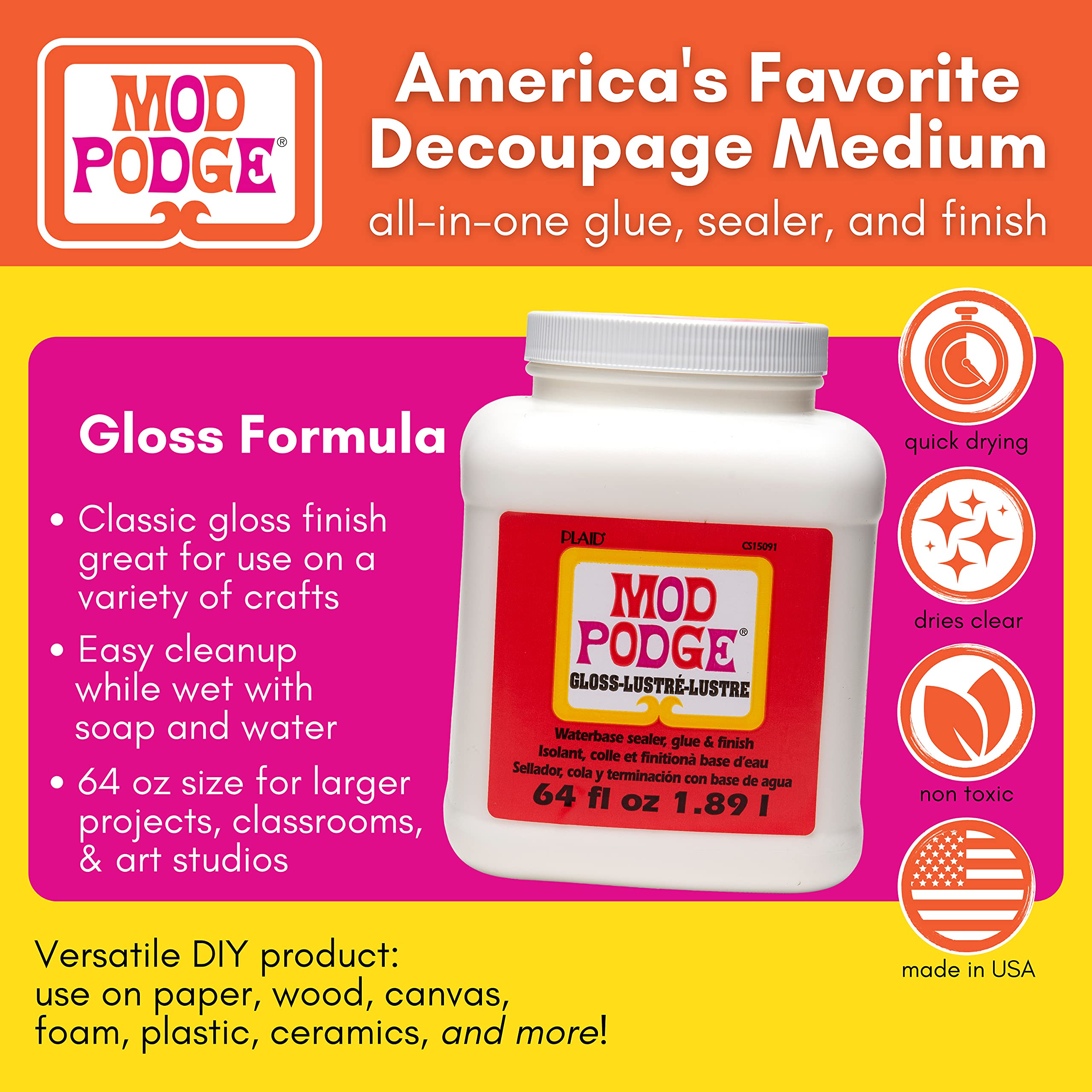 For over 50 years Mod Podge has been America's favorite glue, sealer, and finish. Mod Podge Gloss is quick-drying and dries clear, leaving a smooth, glossy finish. Preserve the beauty of your decoupage paper projects and more with this multi-purpose, all-in-one sealant, glue, and finish. Use this decoupage glue to create decoupage tissue paper projects as well as projects using wood, fabric, plastic, and canvas! This handy decoupage glue comes in a variety of finishes such as gloss, matte, glitter, satin, outdoor, dishwasher safe, and many other unique formulas for every project. Let your creativity come alive with the limitless possibilities of Mod Podge Gloss.