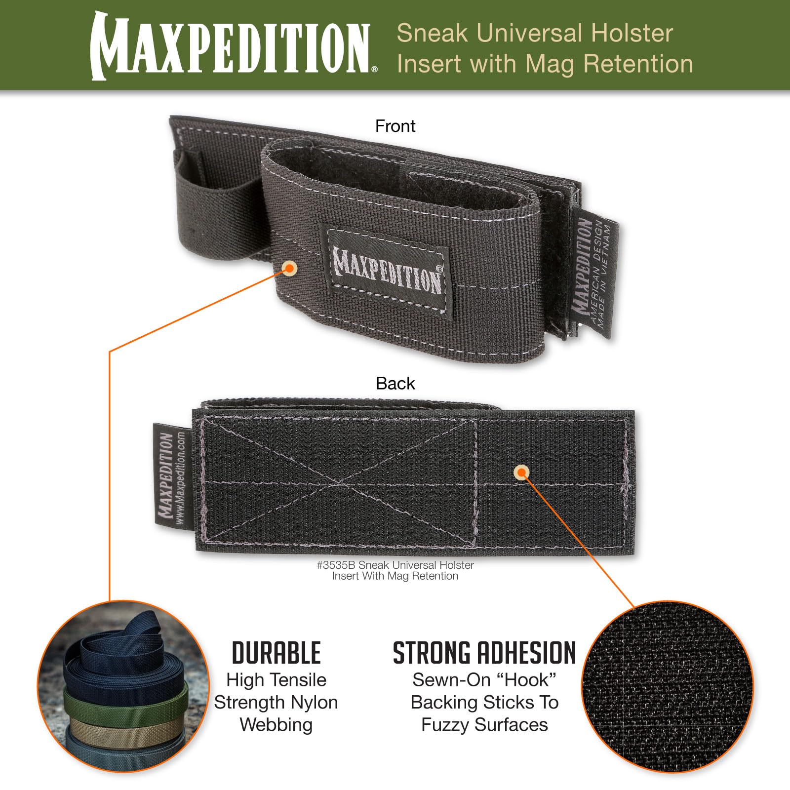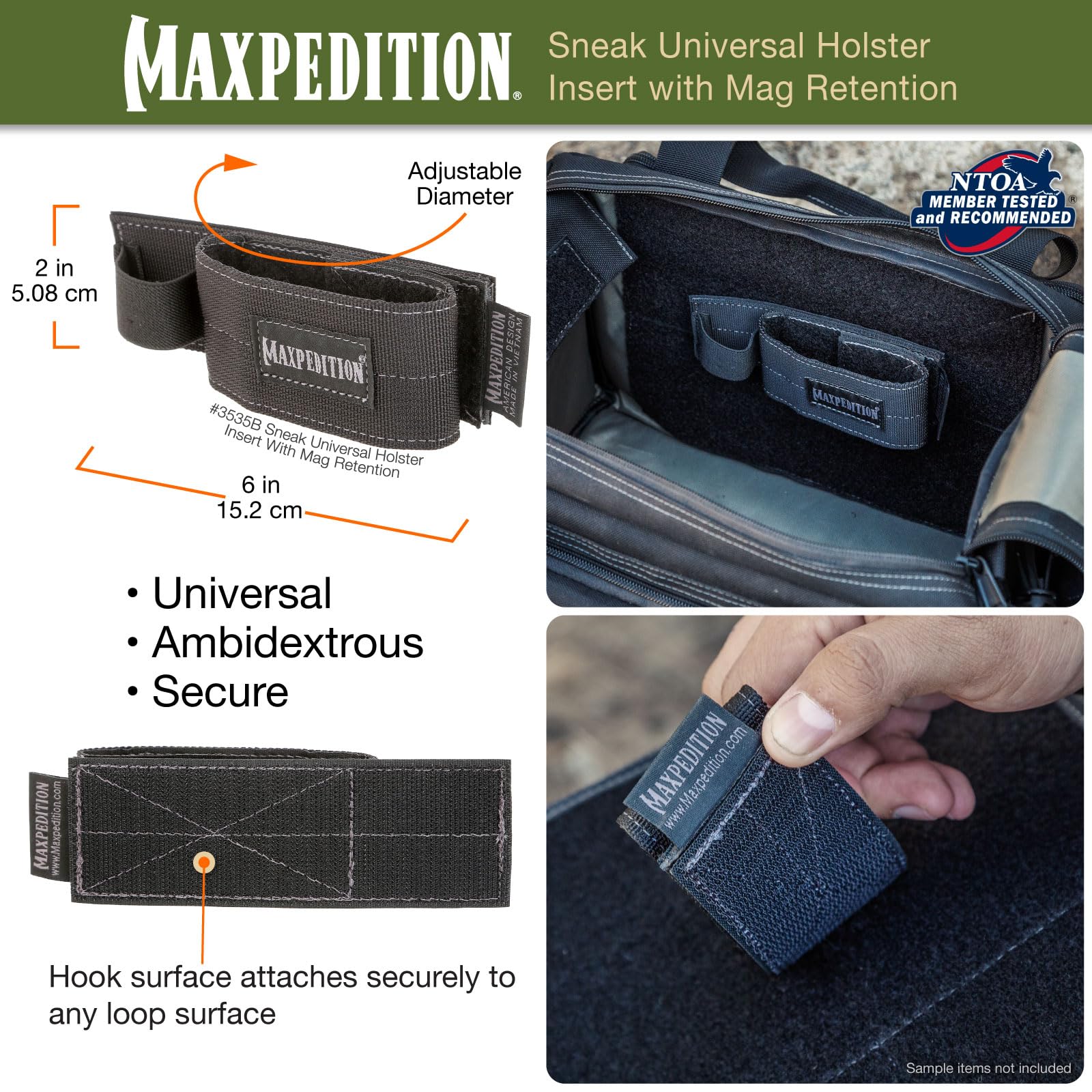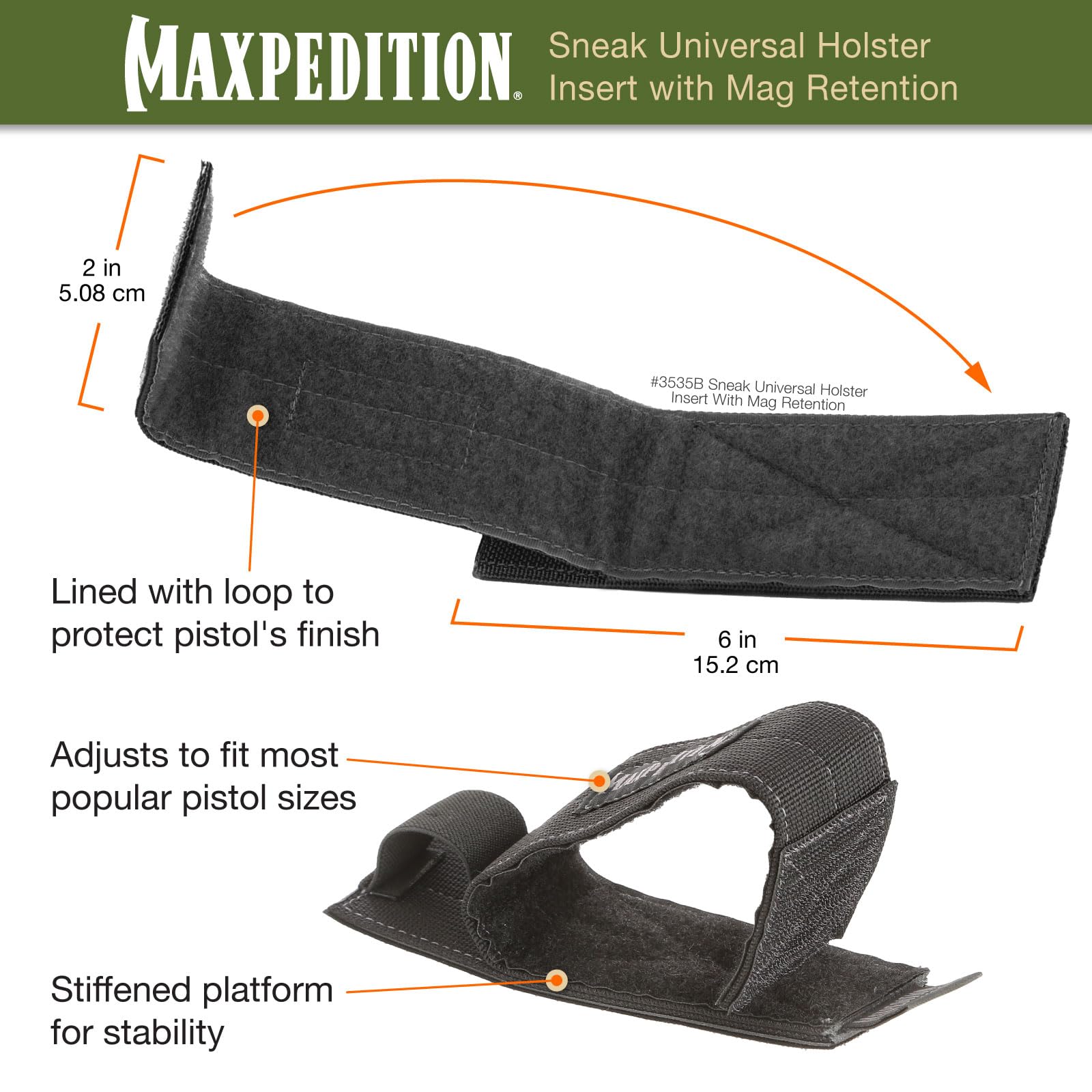 Product Details Adjustable to most popular pistol sizes, the Sneak Universal Holster Insert with mag Retention has a loop interior to protect your pistol from scratching and an elastic grip for an extra magazine. All backed by a stiffened spine with hook finish for a stable connection that allows for an easy draw. Product Feature Overall size: 6 in (L) x 2 in (H) wide x 2 in (W) Adjusts to fit most popular pistol sizes Non-directional attachment for versatility Stiffened spine for added stability Loop interior protects pistol finish Can hold other items such as tools, laptop power supply, etc.