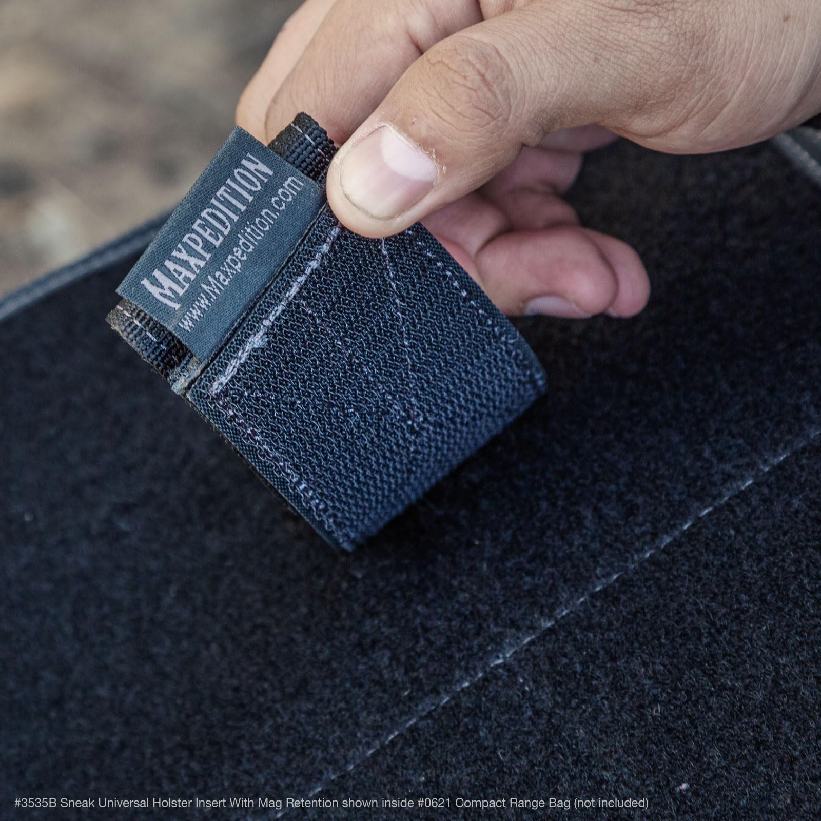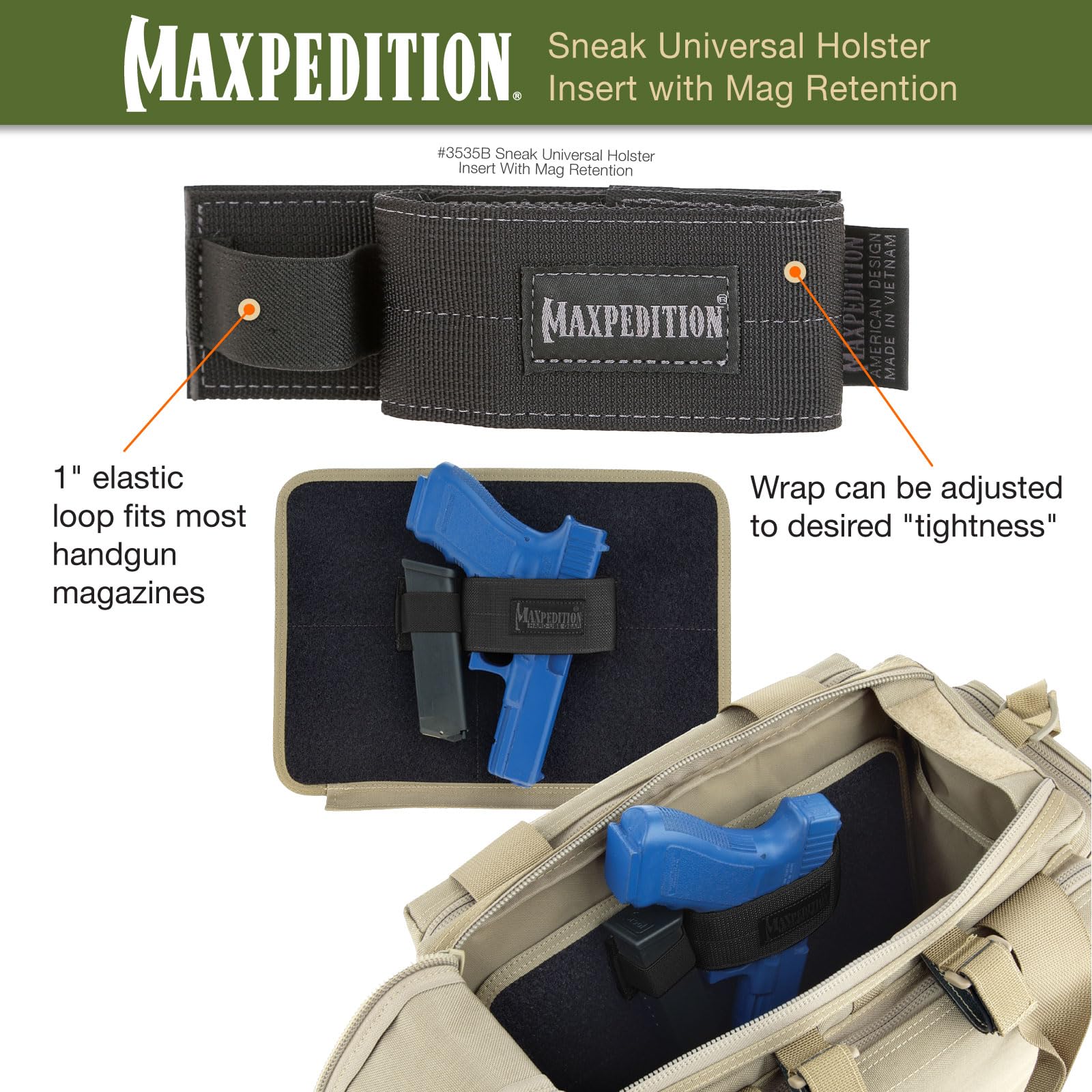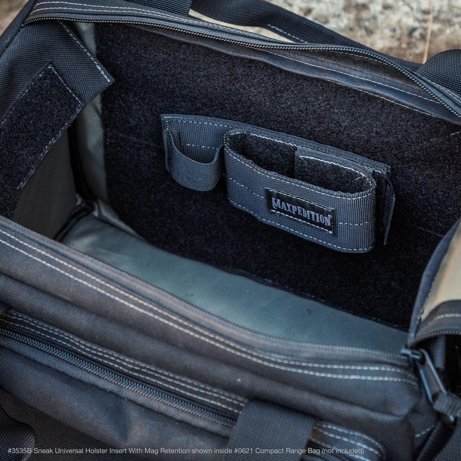 Product Details Adjustable to most popular pistol sizes, the Sneak Universal Holster Insert with mag Retention has a loop interior to protect your pistol from scratching and an elastic grip for an extra magazine. All backed by a stiffened spine with hook finish for a stable connection that allows for an easy draw. Product Feature Overall size: 6 in (L) x 2 in (H) wide x 2 in (W) Adjusts to fit most popular pistol sizes Non-directional attachment for versatility Stiffened spine for added stability Loop interior protects pistol finish Can hold other items such as tools, laptop power supply, etc.
