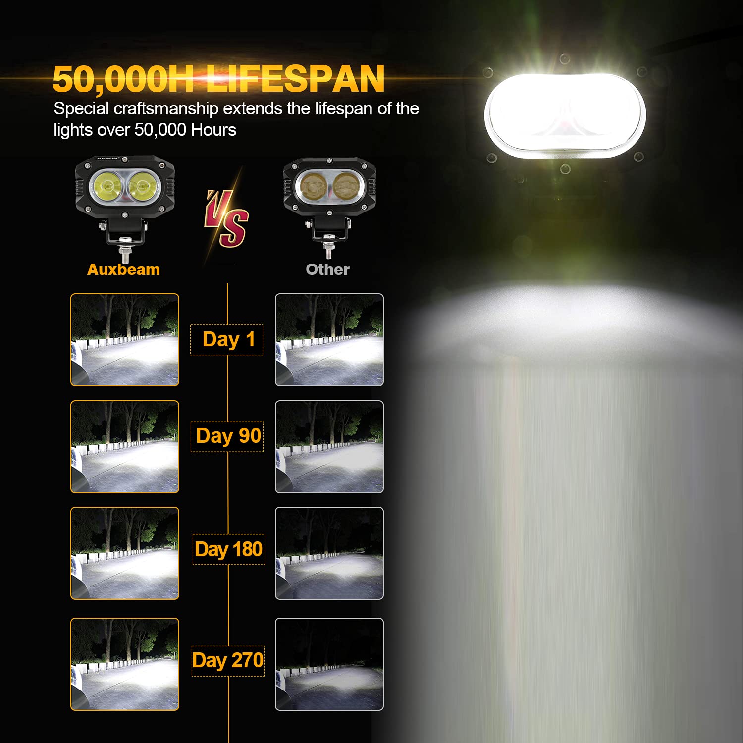 Excellent Efficient Cooling for Long Lifespan. Made of thickened full aluminum housing heat sinks, maximizes surface area for efficient cooling, well enhance long lifespan up to 50,000 hours. The sturdy U shape stainless mounting brackets can be adjusted 180 degree to change the light direction according to your needs