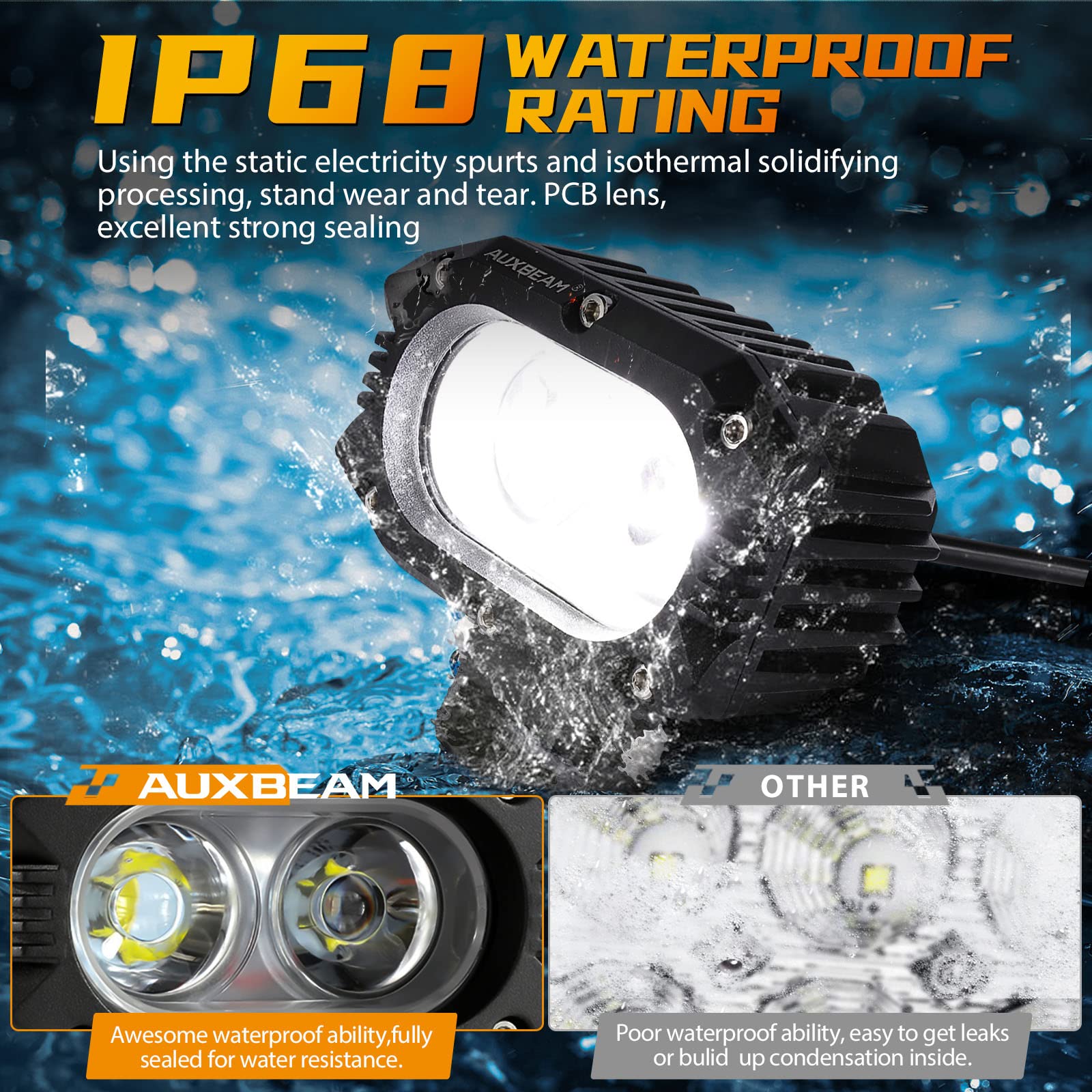 IP68 Waterproof for High Performance. LED driving light has IP68 waterproof rate, protective housing and sturdy brackets. More effectively prevents rain, fog, moisture or dust to get inside the bar and ruin it, great performance of waterproof, dustproof and shockproof