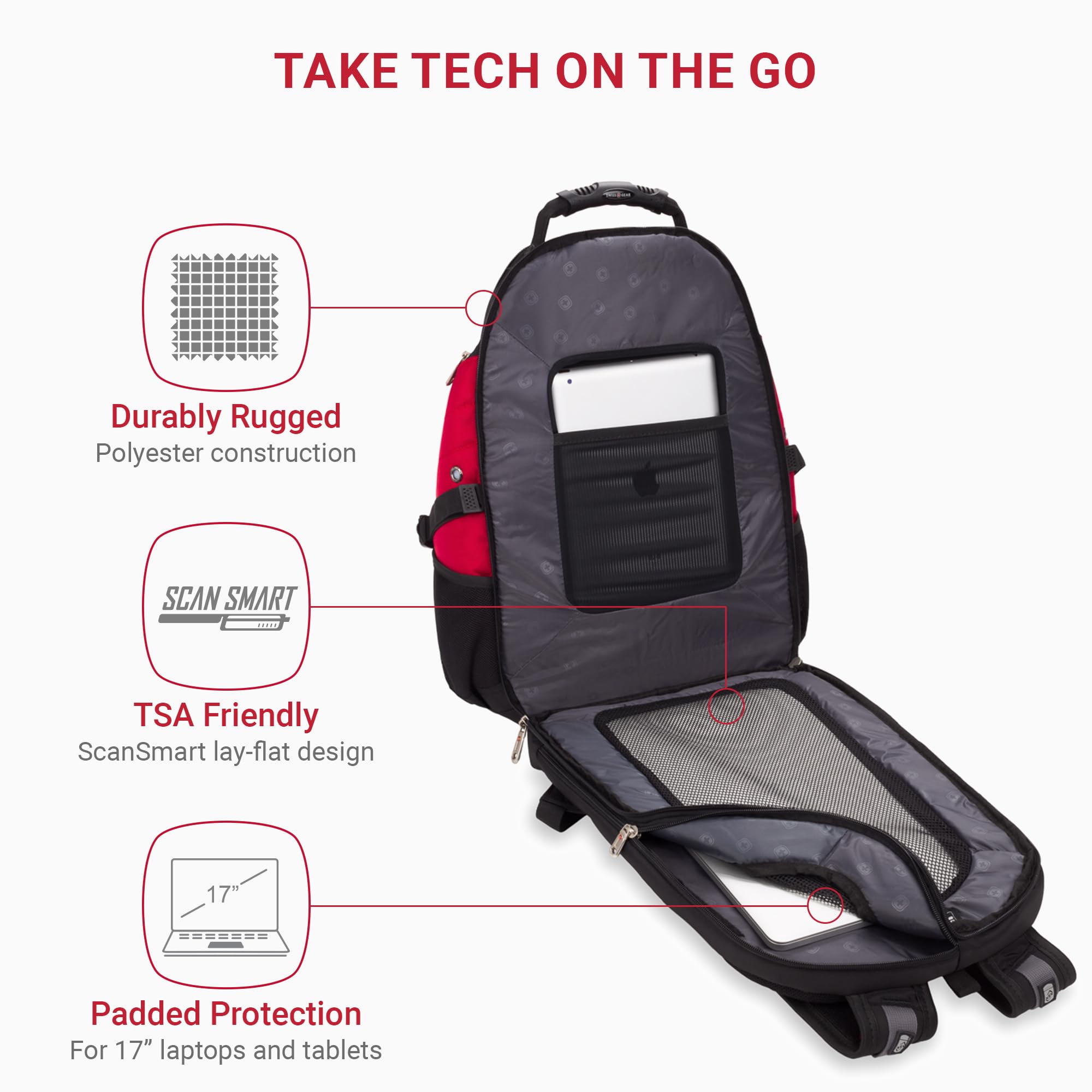 Description The SWISSGEAR 1900 ScanSmart TSA Laptop Backpack is built for professionals, students, and travelers who need durability, smart organization, and travel-ready functionality in a reliable everyday backpack. Constructed from rugged 1200D polyester fabric, this backpack is designed to withstand daily use while maintaining a clean, structured look. The ScanSmart lay-flat compartment allows for faster airport security screening and is designed to fit most 17-inch laptops, along with tablets up to 10 inches. Dedicated protective sections help keep devices secure, while multiple compartments and internal organization provide space for accessories, chargers, and everyday essentials. With overall dimensions of 19 x 14.25 x 9 inches and a 31L capacity, this backpack offers ample storage for work, school, or travel. The expandable storage layout and thoughtfully designed pockets make it easy to stay organized throughout the day. Comfort-focused features include a padded airflow back panel and ergonomic shoulder straps for ventilation and support during extended wear. Additional travel-ready details such as an RFID-blocking pocket and trolley sleeve allow for seamless travel and added security. Backed by a 5-year warranty, the SWISSGEAR 1900 ScanSmart Laptop Backpack delivers dependable performance, durable construction, and versatile functionality for everyday use and travel.