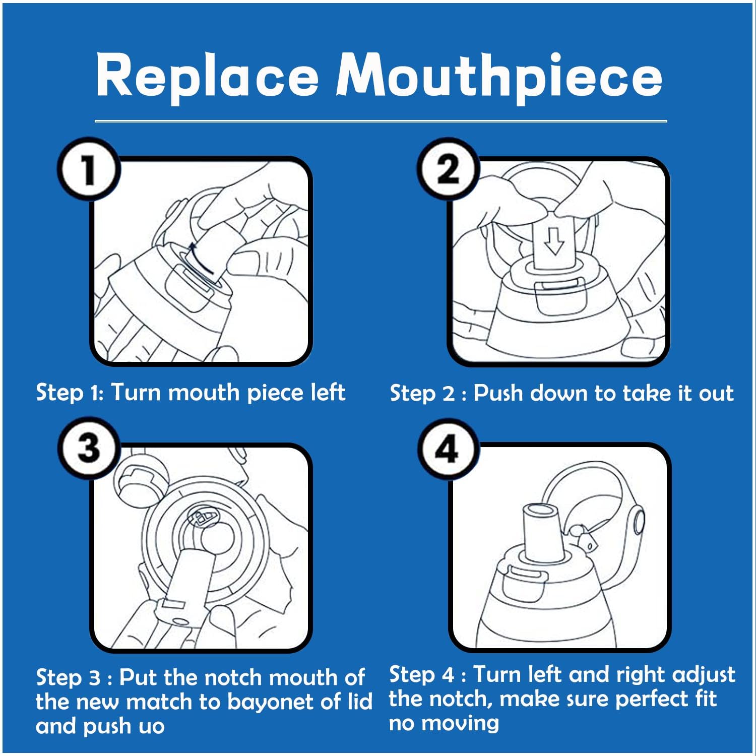 Easy Installation: The water bottle filter & mouthpiece replacement is designed to fit for brita filter water bottle perfectly . Three steps: Step 1: Flush it under tap water for about 20S;Step 2: Insert the filter in the straw;Step 3: push the mouthpiece,make sure to align the small square part up with the same on the cap,reattach with brita water bottle filter and you are good to go