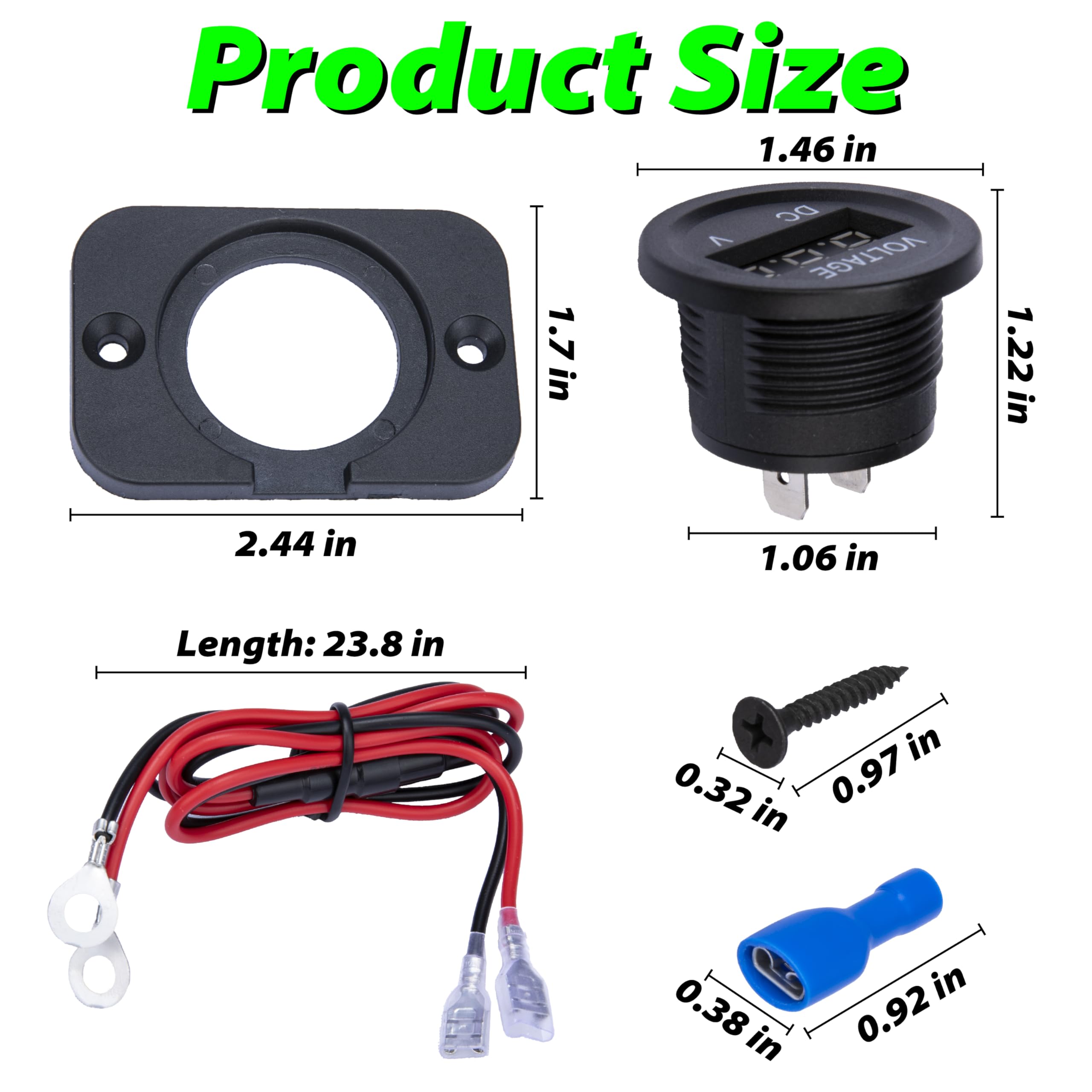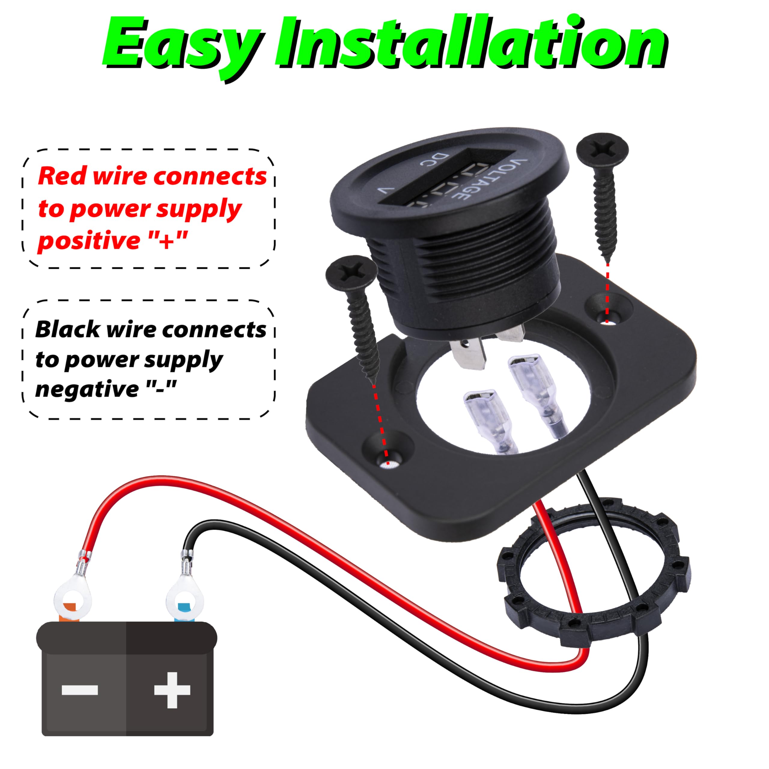 Easy Installation: Complete with 1 surface mounting plate, 1 round nut, 2 screws, 2 insulated terminals, and 1 23.8-inch connecting cable with a red wire for positive power and a black wire for negative power for quick wiring, this car voltage meter ensures easy installation