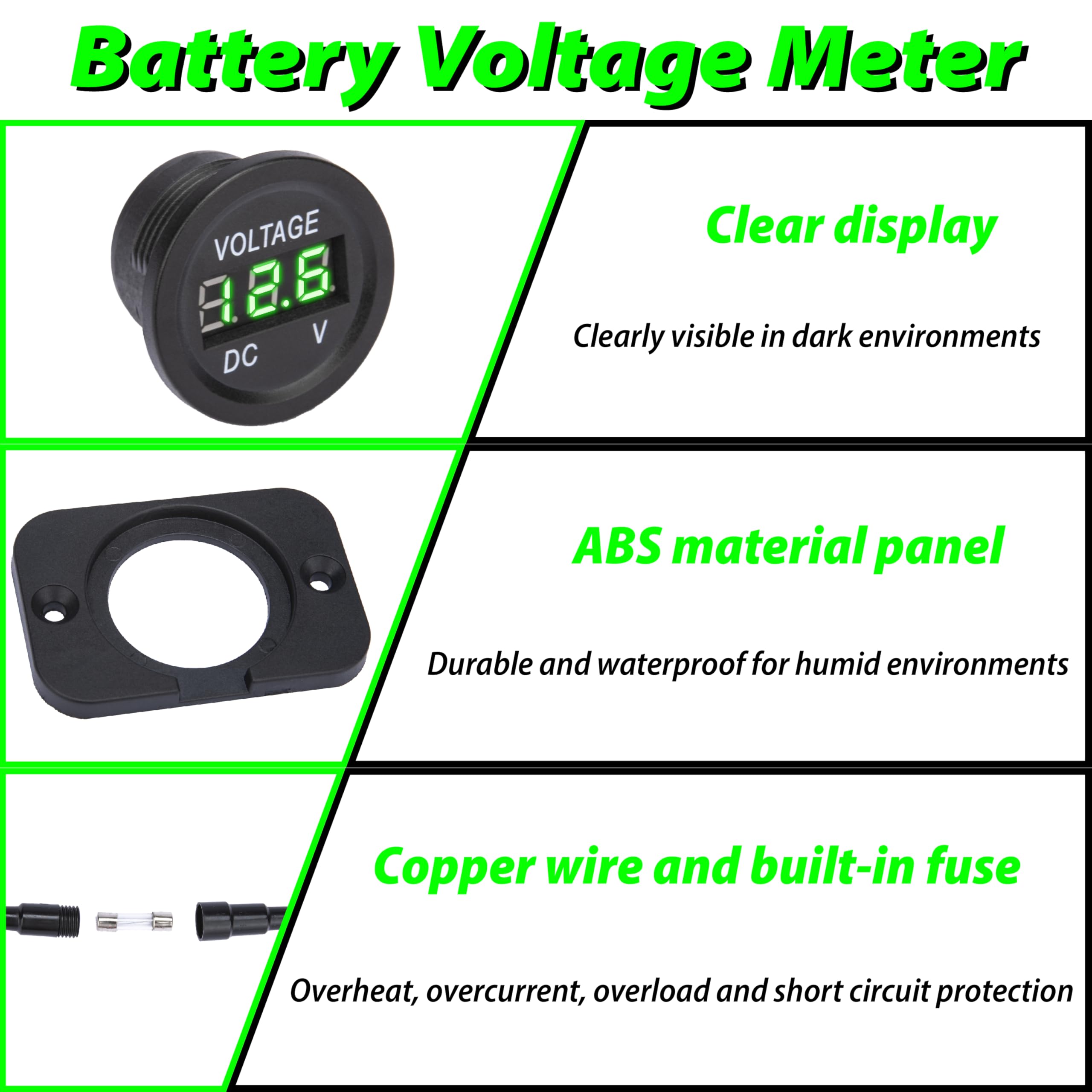 Safe and Reliable: Made of high quality ABS material, durable and waterproof, this battery voltage meter is suitable for wet environments. Copper wiring and a built-in fuse provide overheat, overcurrent, overvoltage, overload, and short circuit protection to ensure safe use