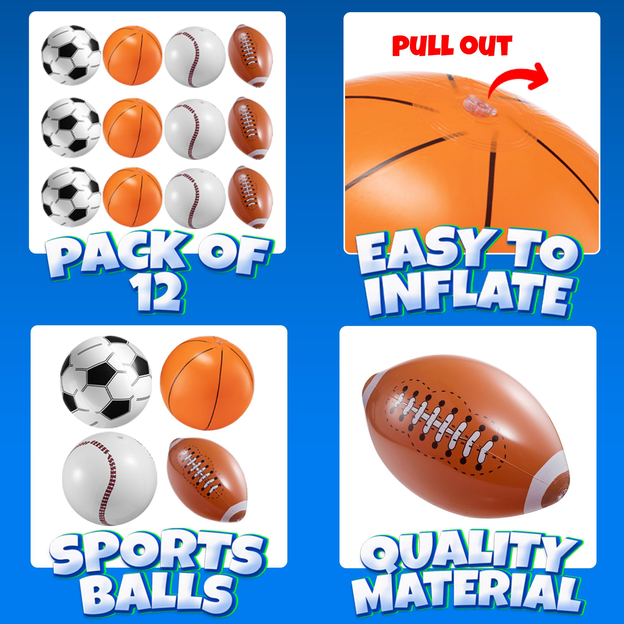 PACK OF 12 - 16" INFLATABLE SPORTS THEMED BEACH BALLS: Score Big Fun with Our Inflatable Sports Beach Balls! Each order includes a total of 12 inflatable beach balls featuring 3 of each sport: basketball, baseball, football, and soccer. These fun and durable sports-themed balls are perfect for pool toys, beach activities, or party decorations.