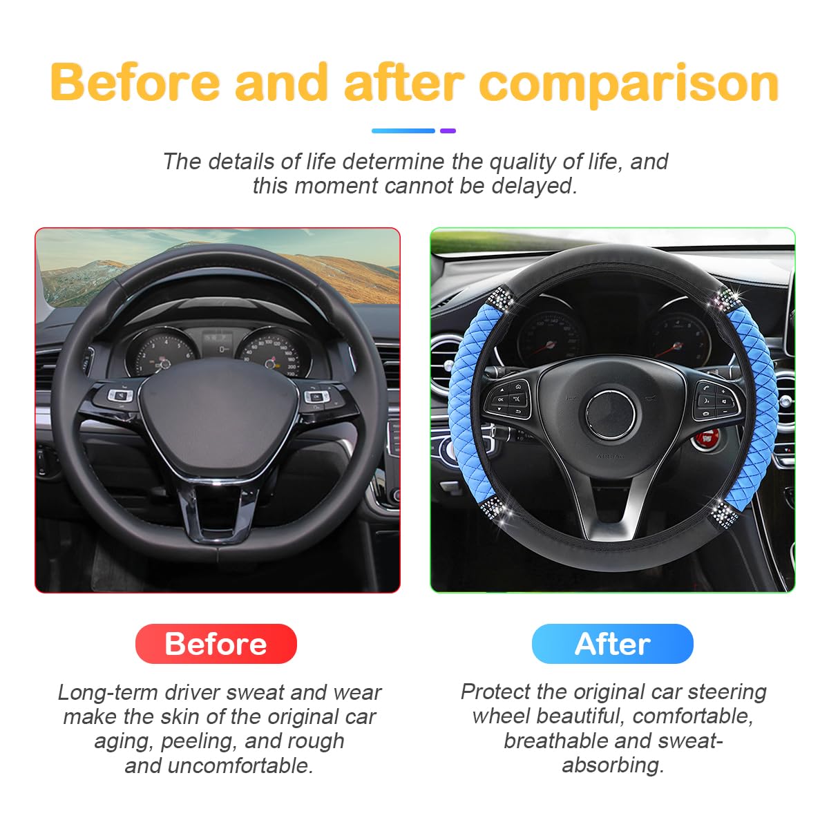 【Elastic Soft Leather】: Bling steering wheel cover is made of delicate and soft microfiber PU leather, breathable and non-slip. It is comfortable and the steering wheel does not get too hot. It's so soft and comfy feel under your hands and fingers when driving. Every drive is a pleasure with this steering wheel cover.