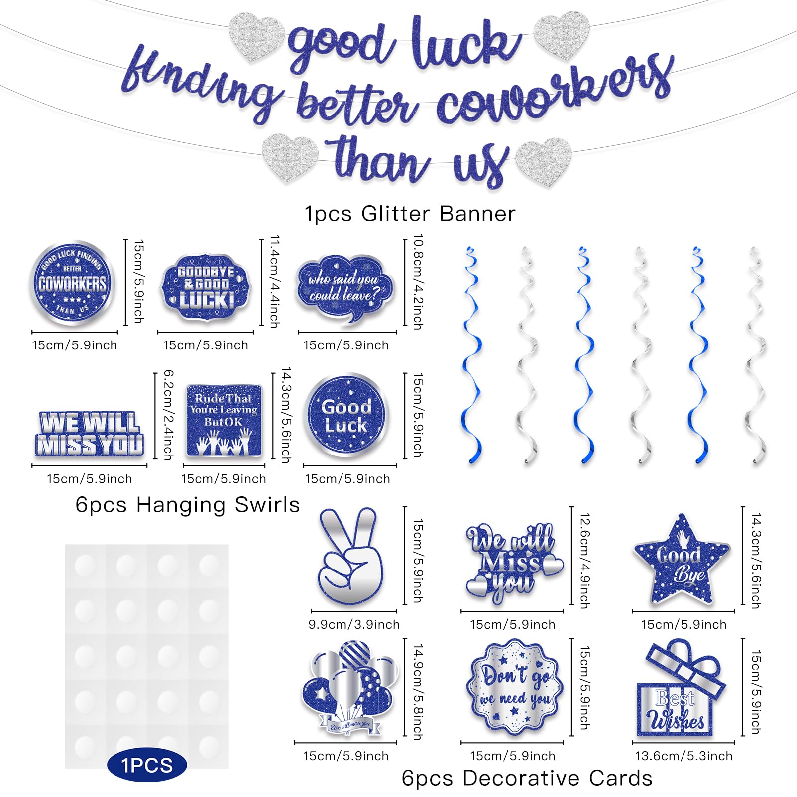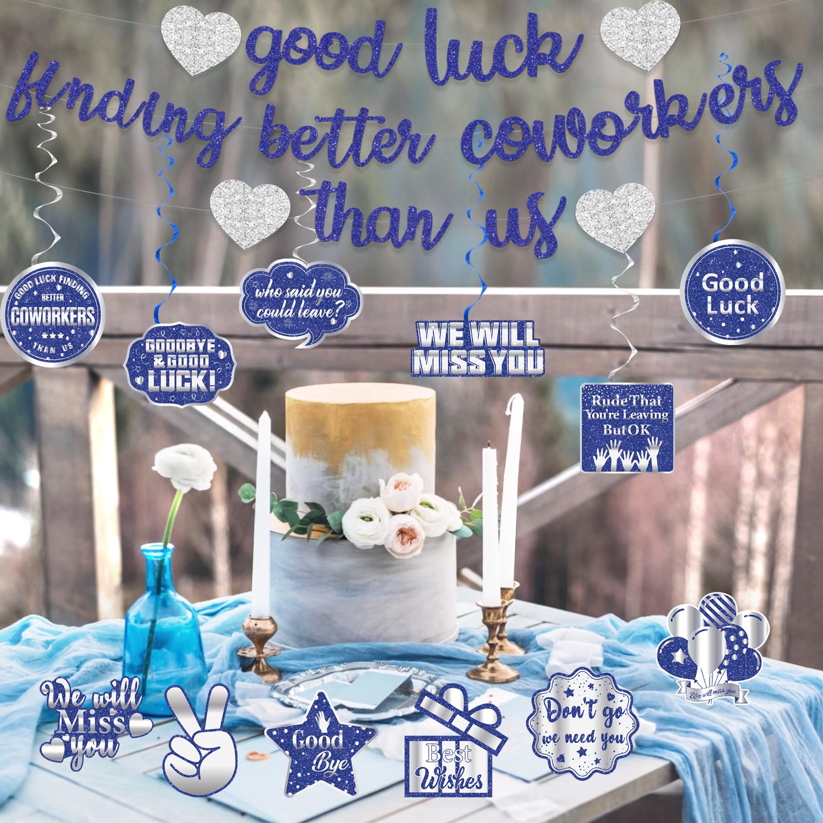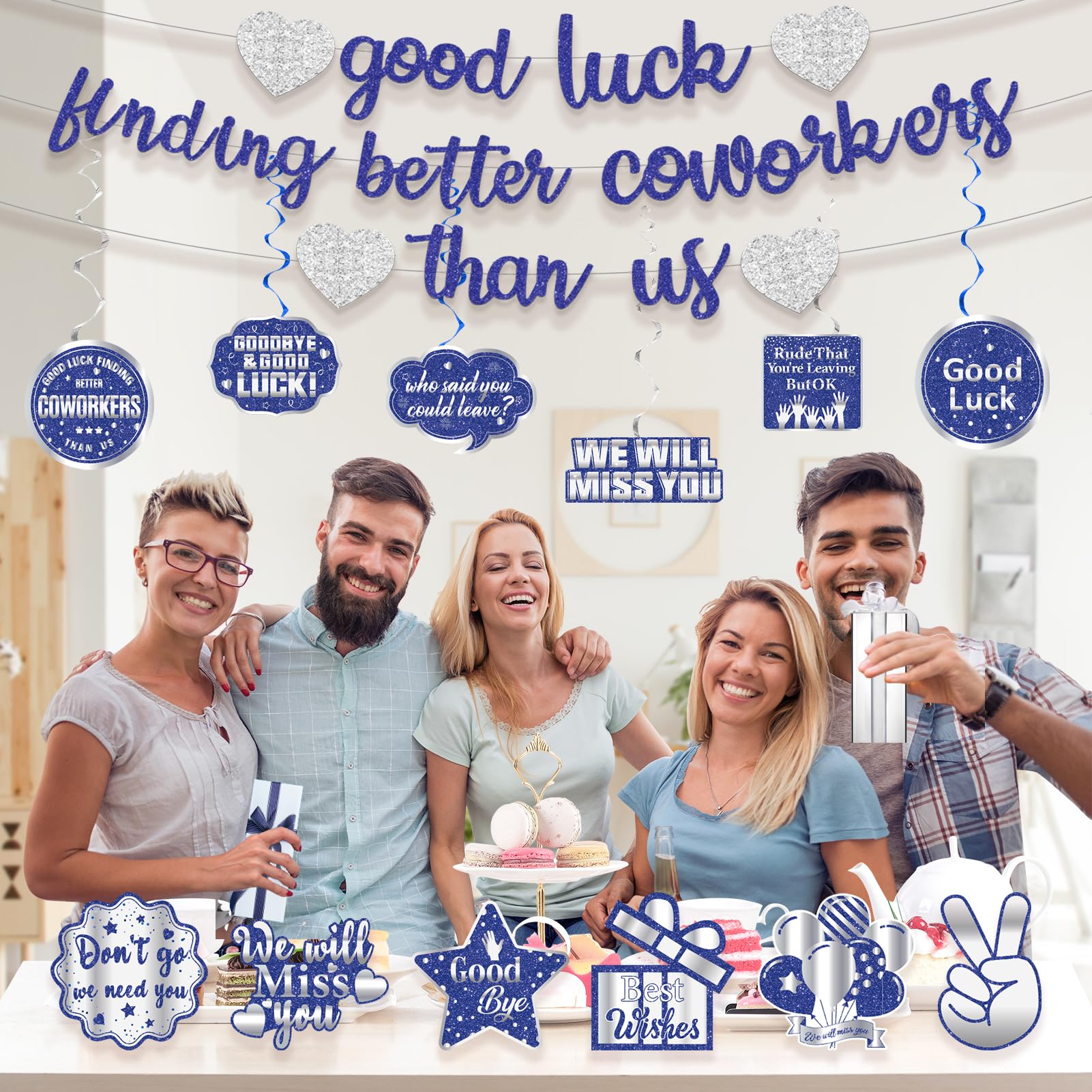 Package Includes: 1 × Pre-strung blue silver glitter good luck finding better coworkers than us banner, 6 x hanging swirls, 6 x decorative cards, Perfect for going away party decorations