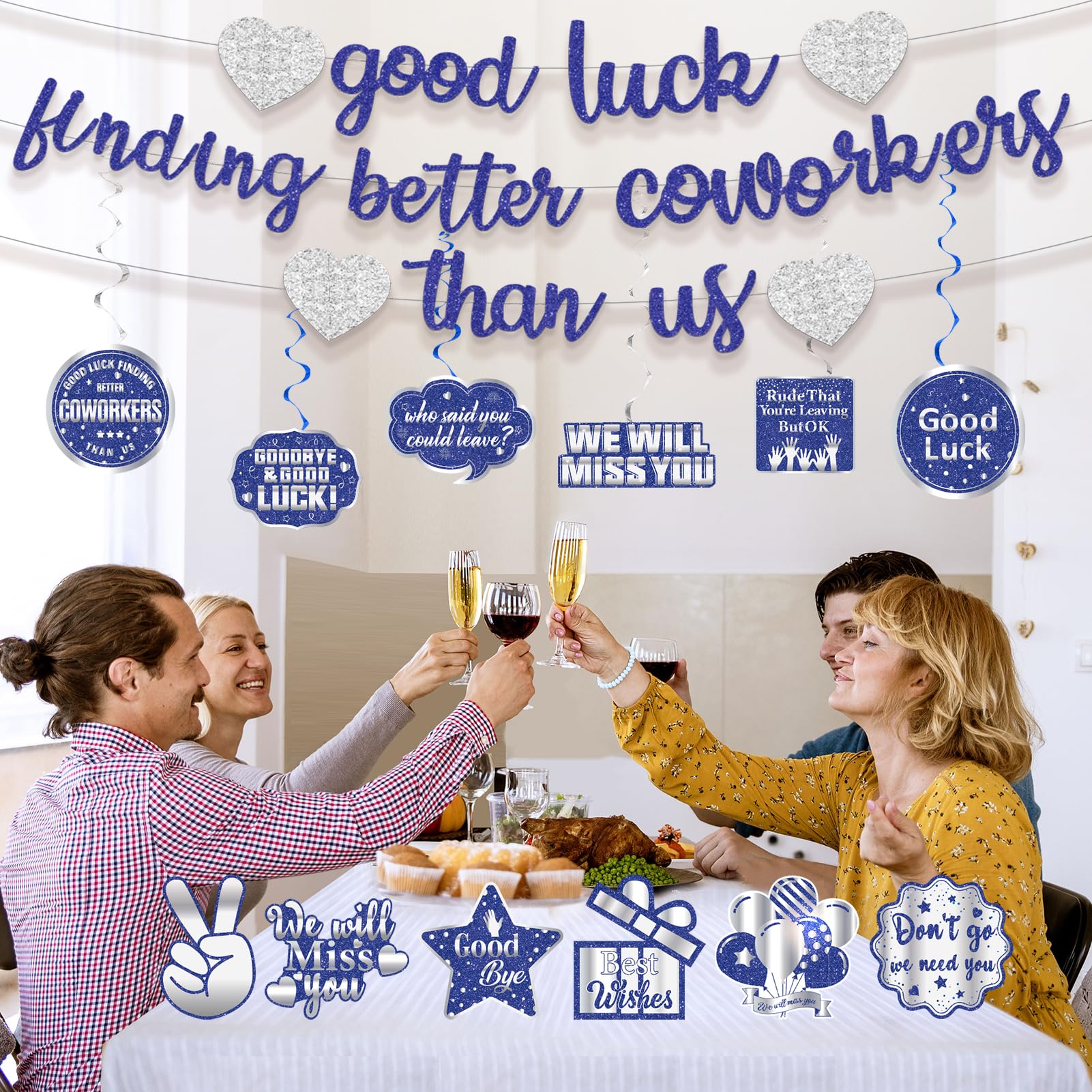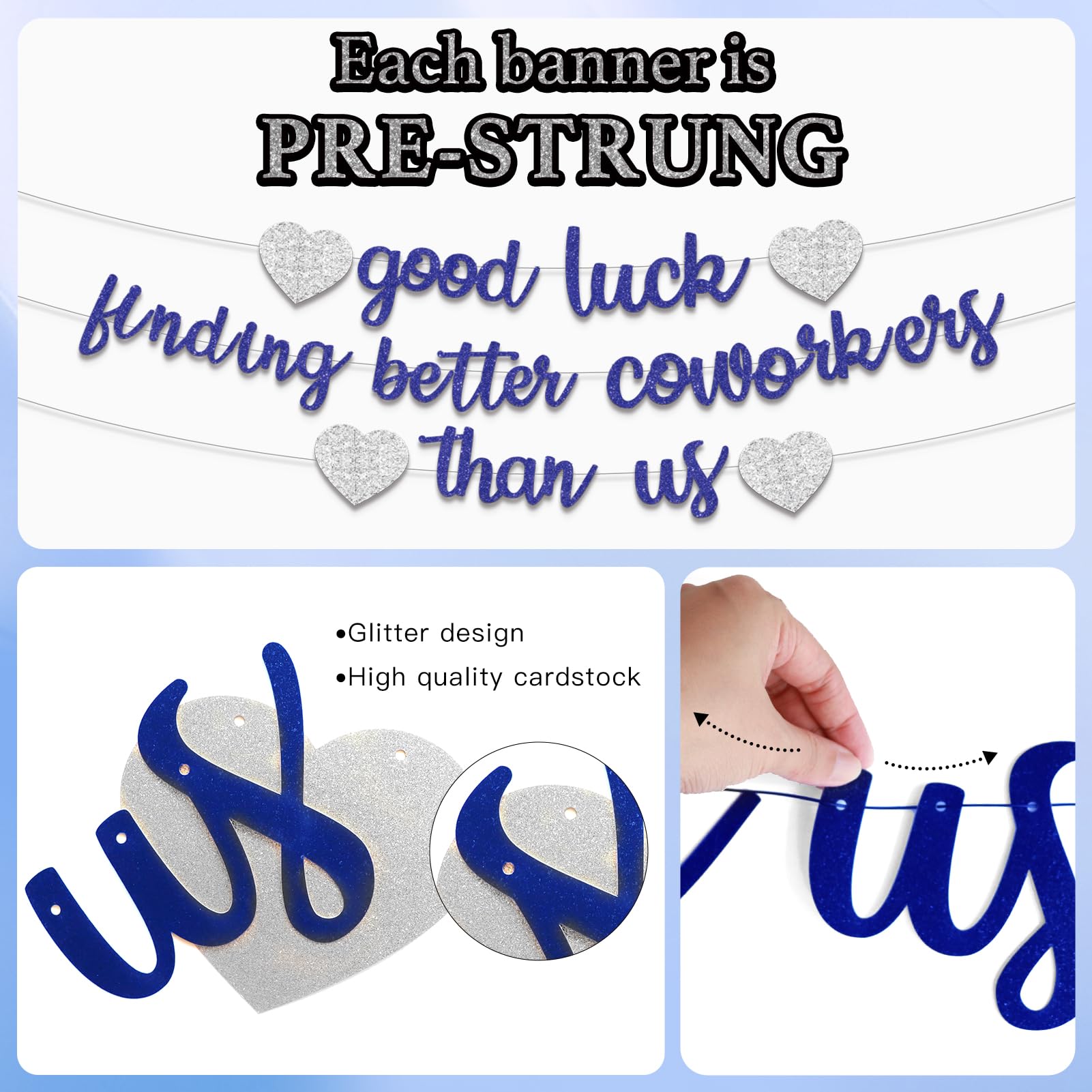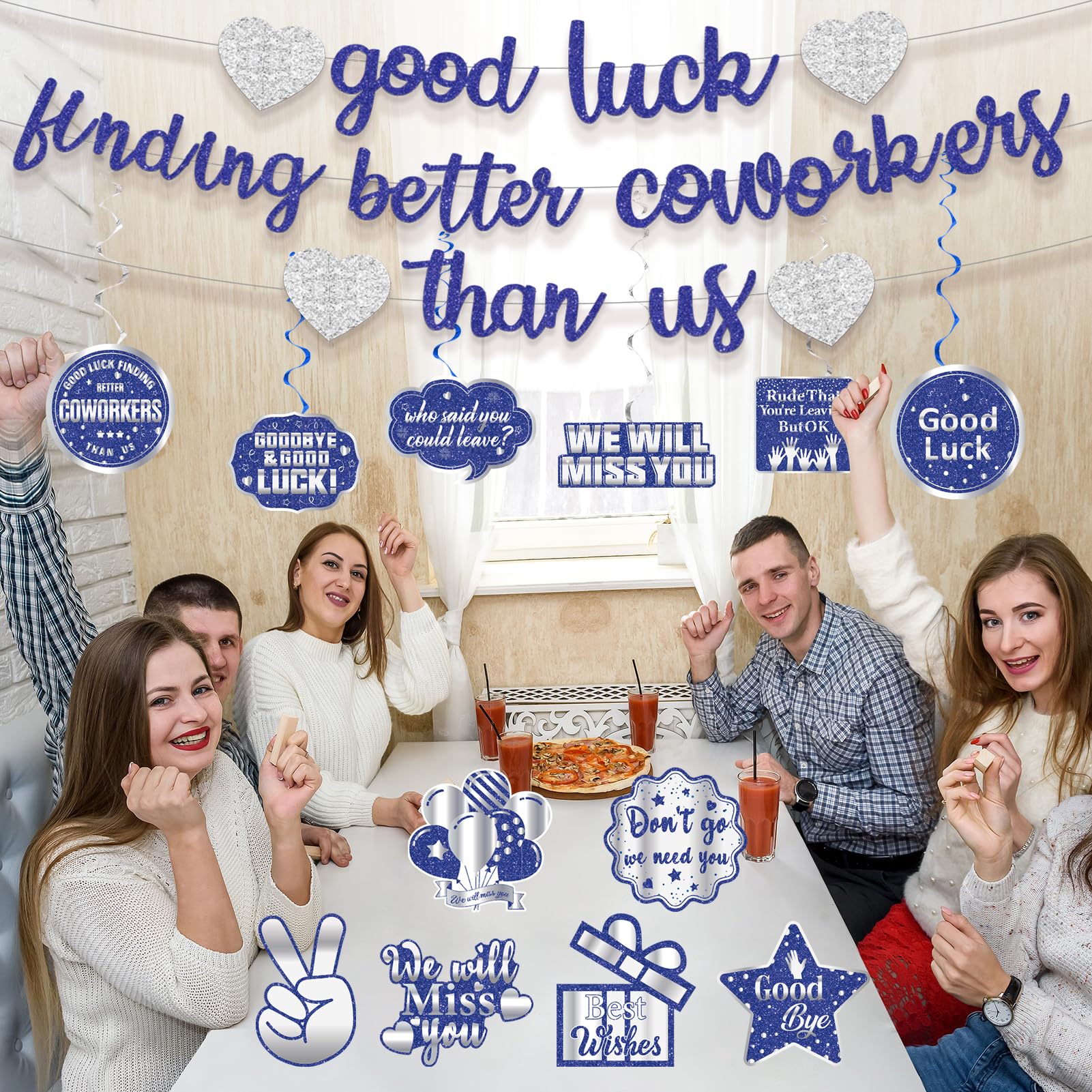 Package Includes: 1 × Pre-strung blue silver glitter good luck finding better coworkers than us banner, 6 x hanging swirls, 6 x decorative cards, Perfect for going away party decorations