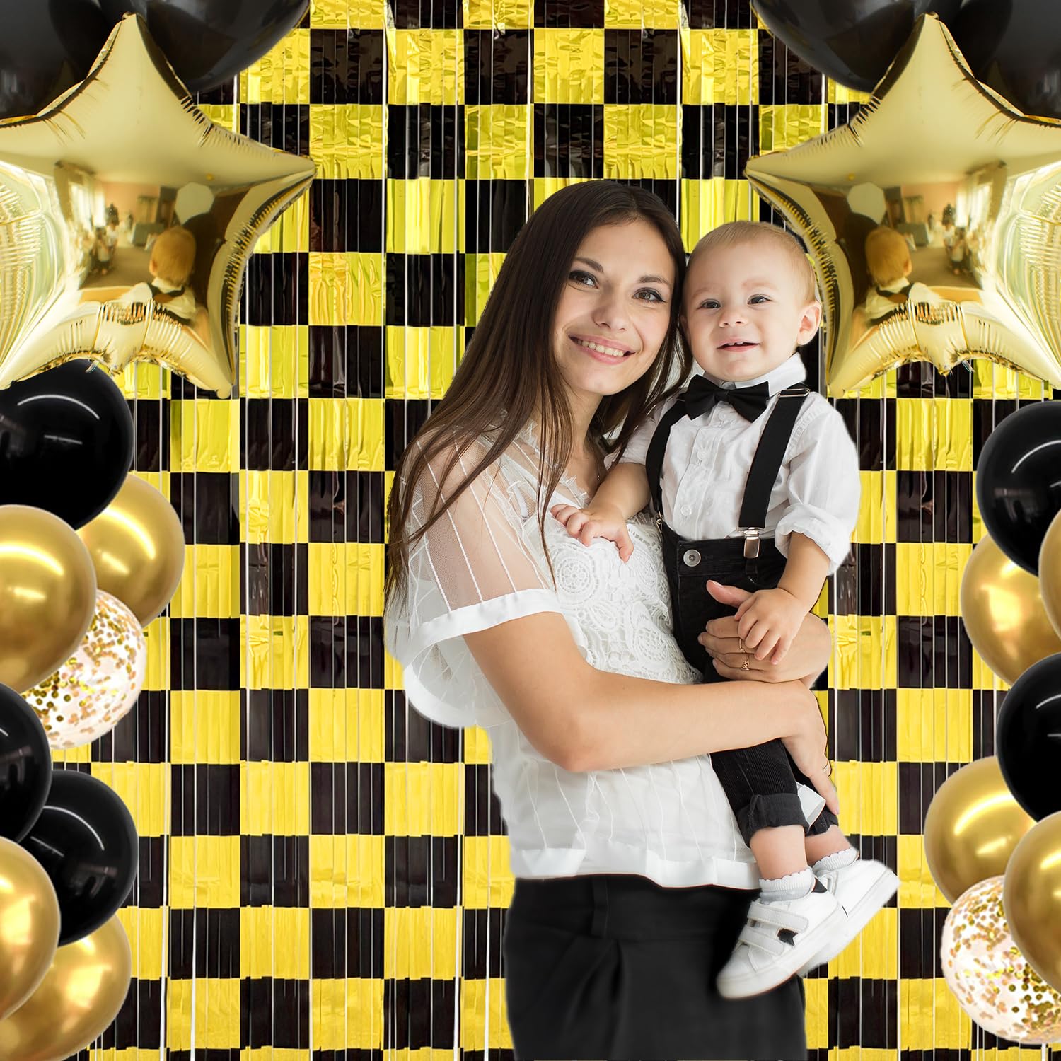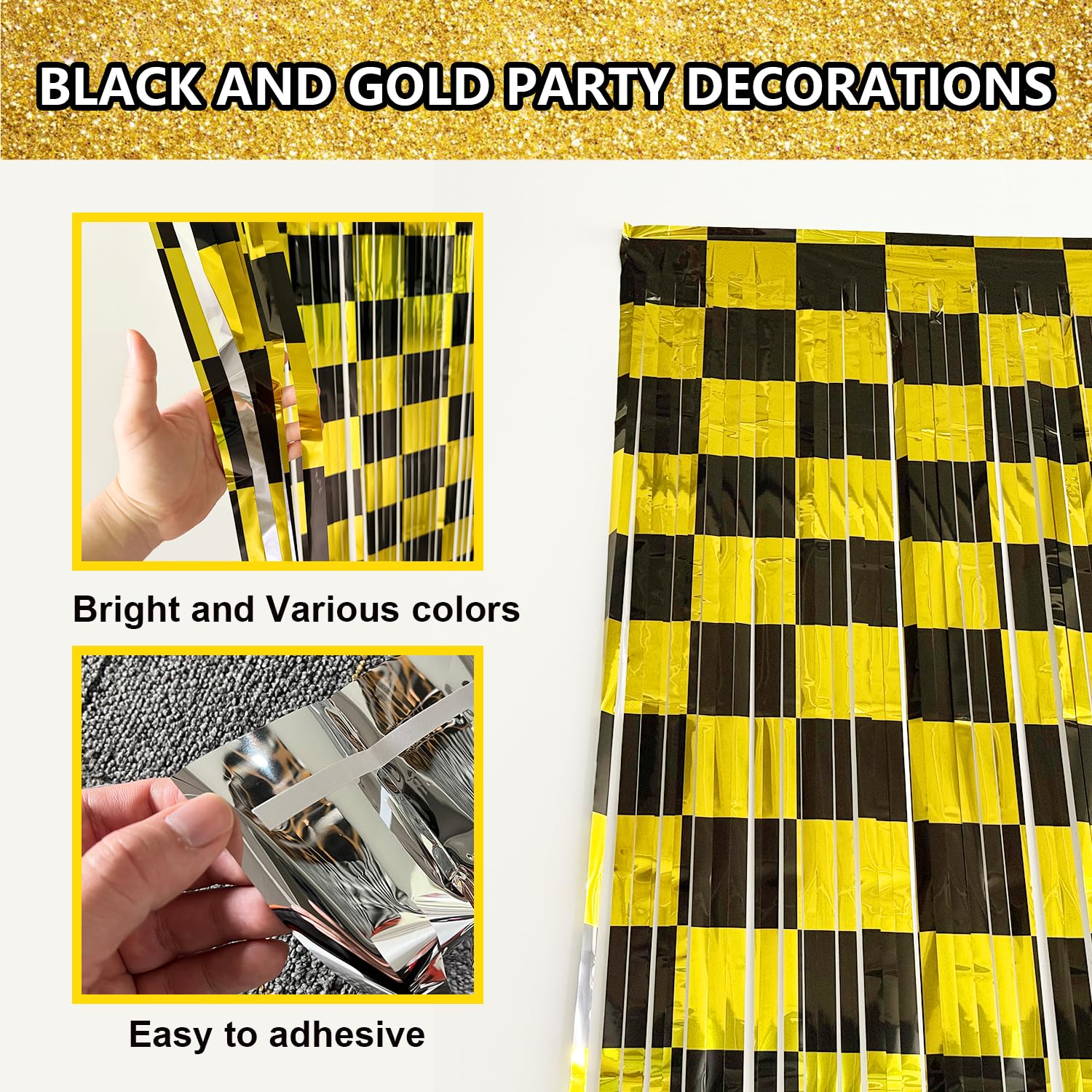 Package Includes - You’ll receive 2 pcs black gold foil fringe curtains, each measuring 3.28 x 6.56 ft, perfect for covering walls, doorways, dessert tables, or creating an eye-catching photo backdrop.