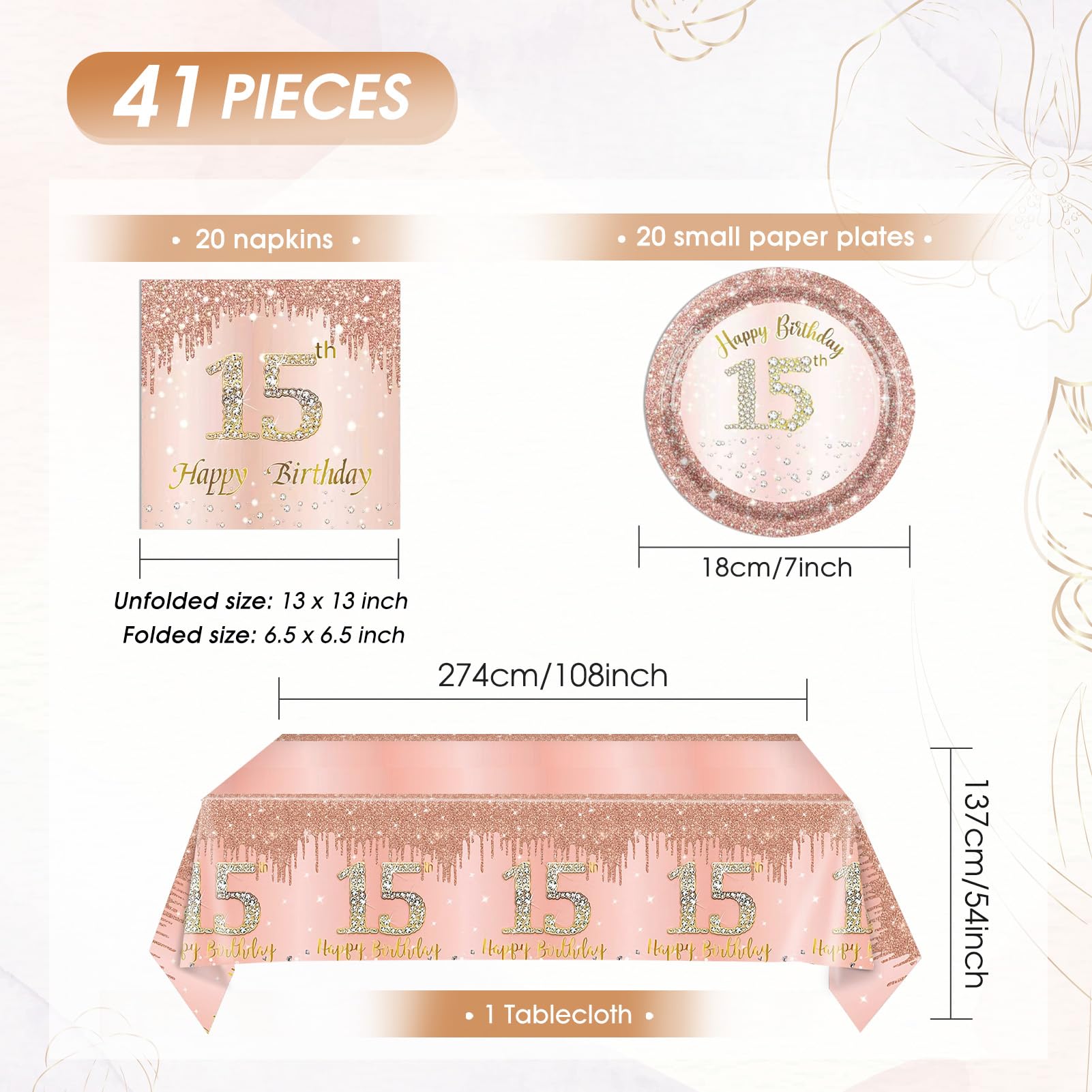 41PCS 15 birthday decorations for girls : You'll get 20 pieces dessert plates of 7in, 20 pieces of 15th birthday napkins 6.5in, and 1 pieces of rose gold 15th birthday tablecloth for each set that can serve 20 guests. This gorgeous rose gold happy 15th birthday gifts for girls will definitely grab the attention of your guests, makes a special and memorable party that neither you nor your guests will never forget.