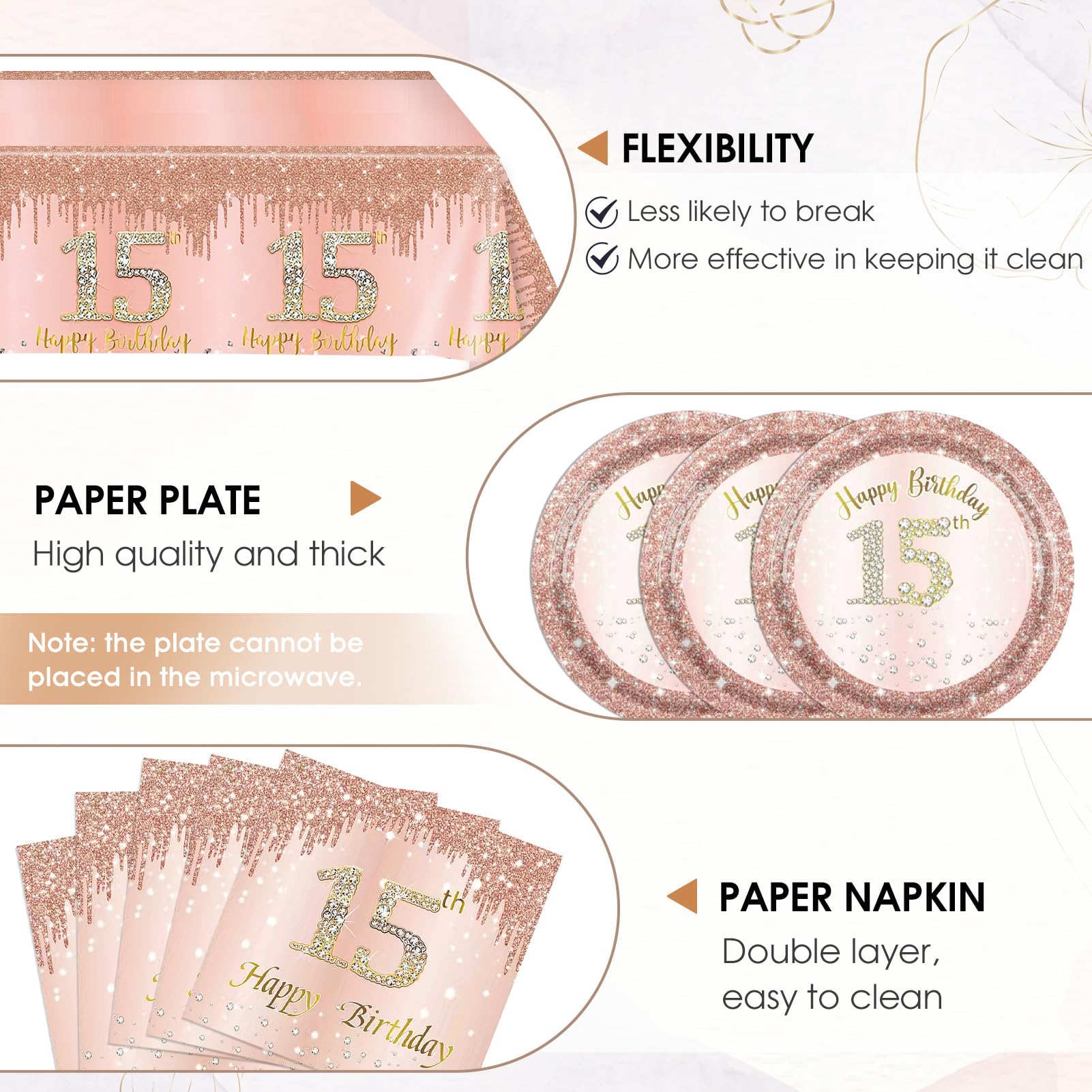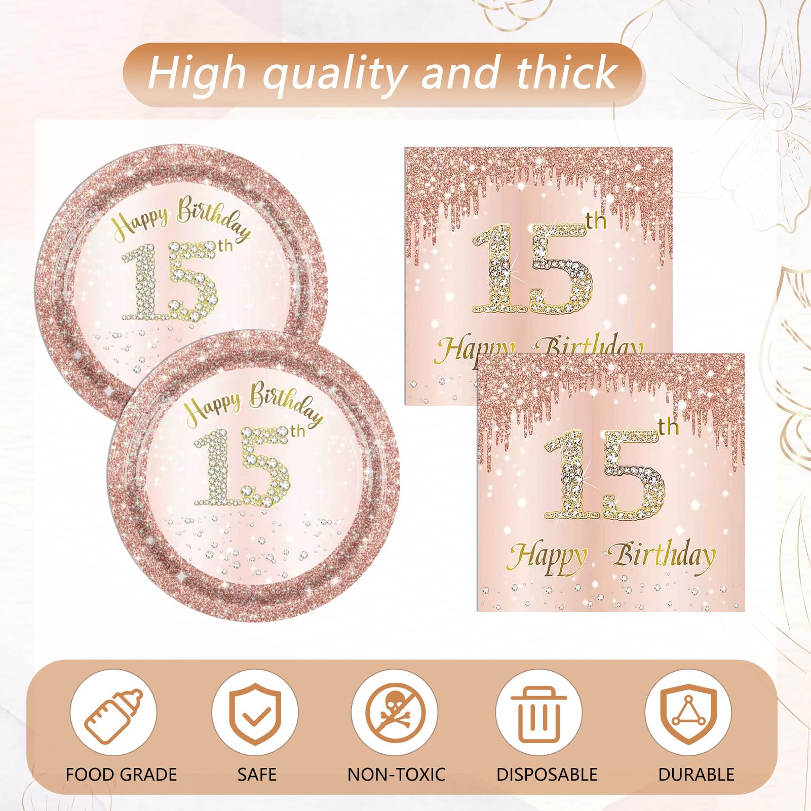 Premium Material: All of our pink rose gold plates and napkins are made of quality paper, safe, no smell, heat-resistant, and durable. The stylish pattern and color are well-printed and fade-resistant to provide you with a party that is full of a happy 15th birthday atmosphere. Bright glow for creating romantic atmosphere and adding much fun in your 15th birthday party.