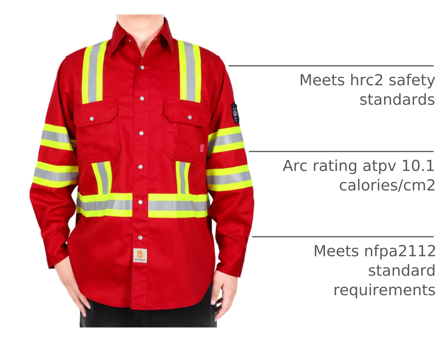 ENSURE SAFETY AT WORK :This garments meets or exceeds the standards for HRC2,Arc Rating Atpv 10.1 Calories/cm2 and meets the requirements of NFPA2112 Standard on flame resistant garments for protection of industrial personnel against flash fire,2012 edition.Also NFPA70E ASTM F1506 and NFPA2112 CAT2 Classified by UL!
