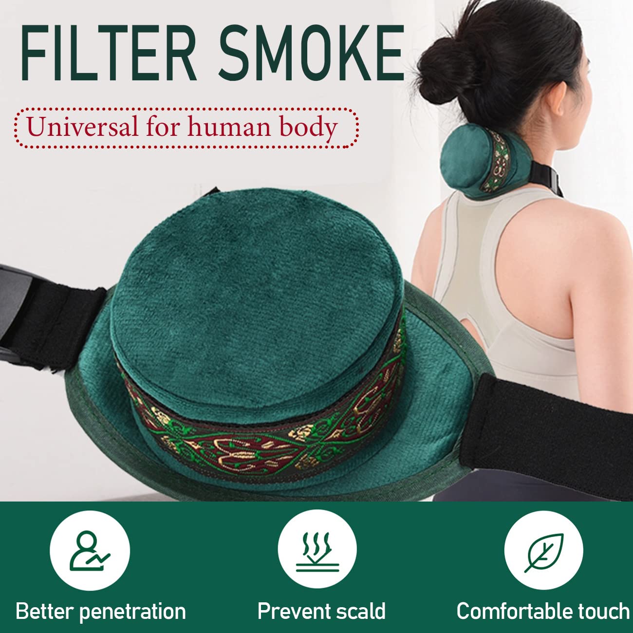 【Portable Design】Package includes a pure copper moxa burner and a high quality breathable velvet smoke filter bag. Compact size, adjustable velcro and smoke free filter for moxibustion treatment during meditation, sleep and rest. Great for you to enjoy moxibustion at home and help relieve arthritis, knee, neck and shoulder pain