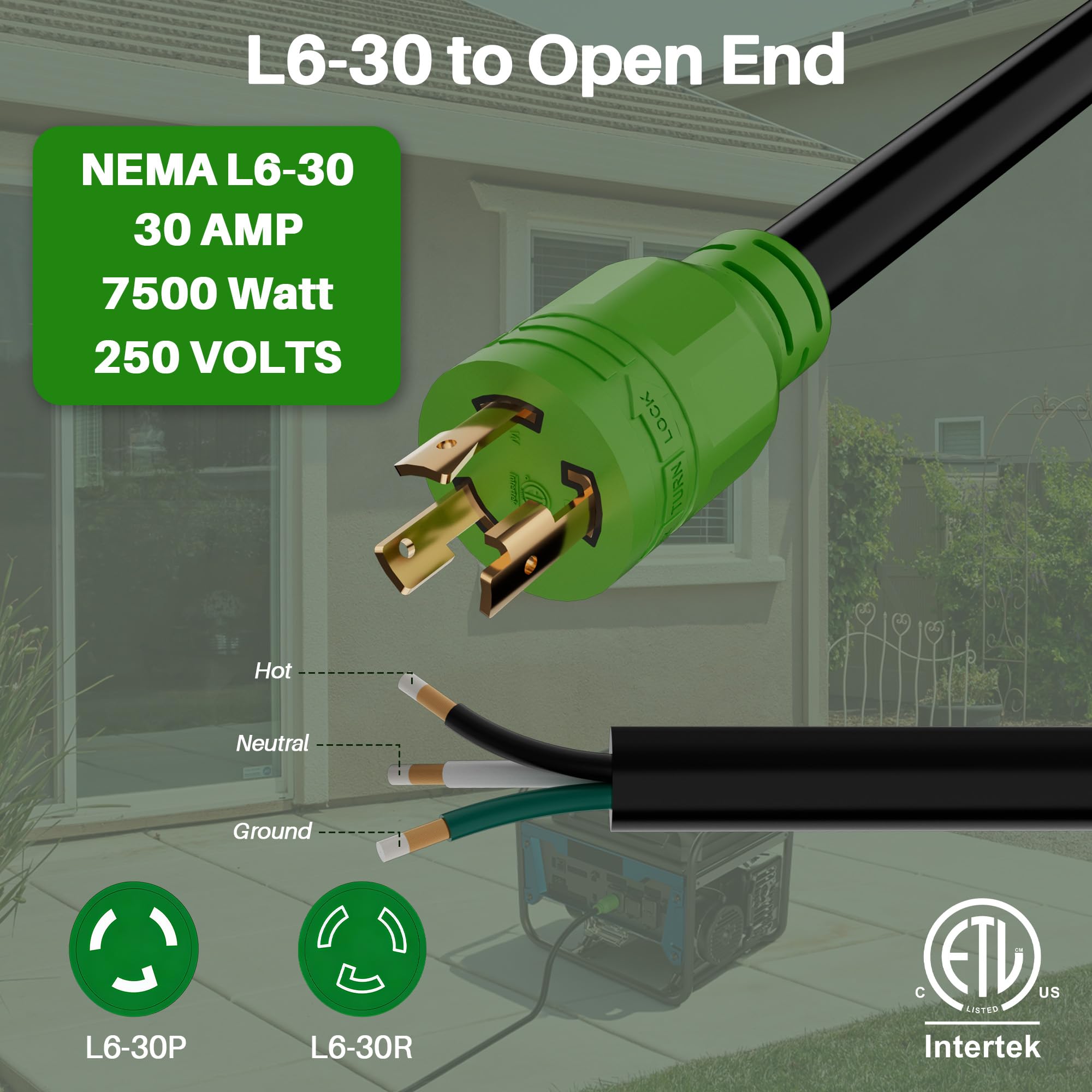 【Heavy-Duty L6-30P to Bare Wire】: Durable SJTW power cord with moisture-resistant and high-temperature insulation jacket, suitable for indoor/outdoor use. It provides stable 30 AMP current at 250V and supports up to 7500 watts of power. Meet emergency electrical needs during cradle mounts, portable AC units, air compressors, electric vehicle charging, emergency electrical, and other power connection purposes.