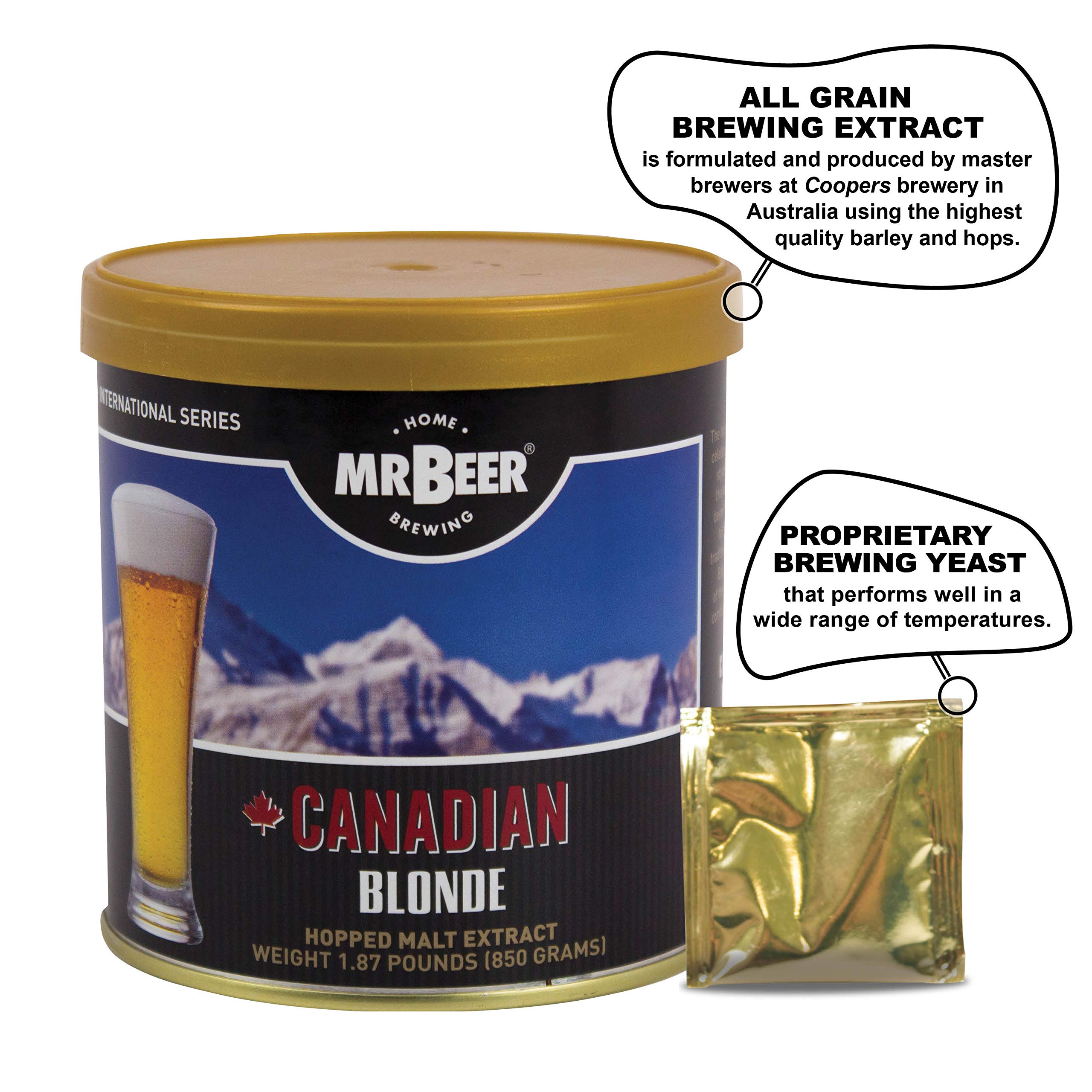 Mr. Beer Canadian Blonde Refill produces a beer that is a lightly colored, a clean, fresh palate, well balanced with subtle hop notes and a crisp finish. This is a classic Easy drinking Canadian Style beer.