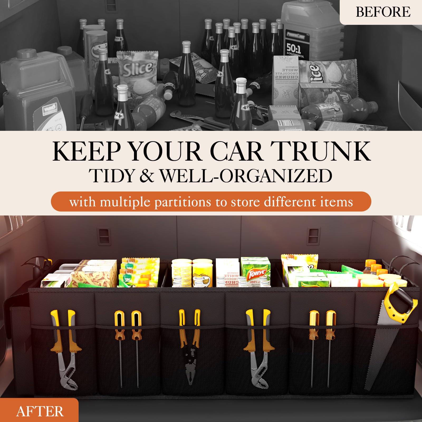 SPACIOUS STORAGE: With 3 large compartments and 6 extra mesh pockets, this car trunk organizer provides ample space to neatly store groceries, tools, sports equipment, and more. Keep your car trunk clutter-free and organized on every trip.