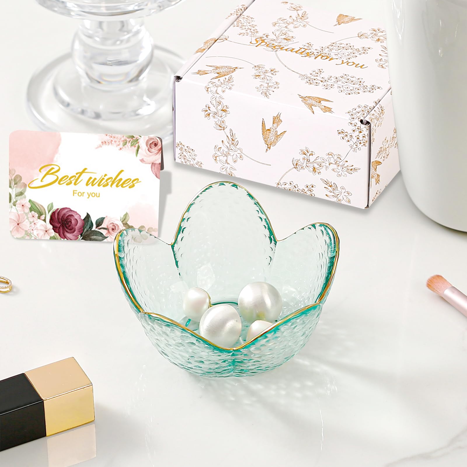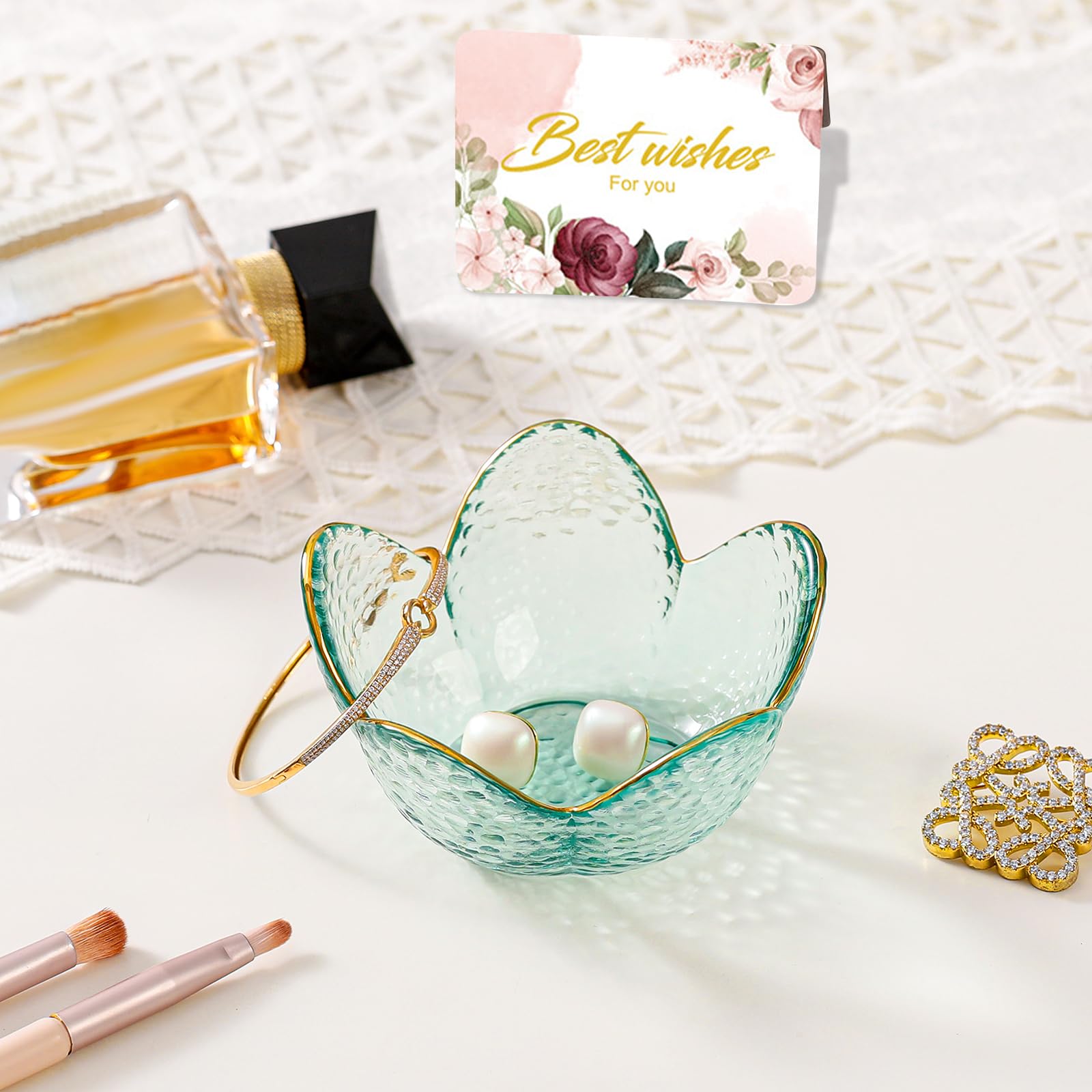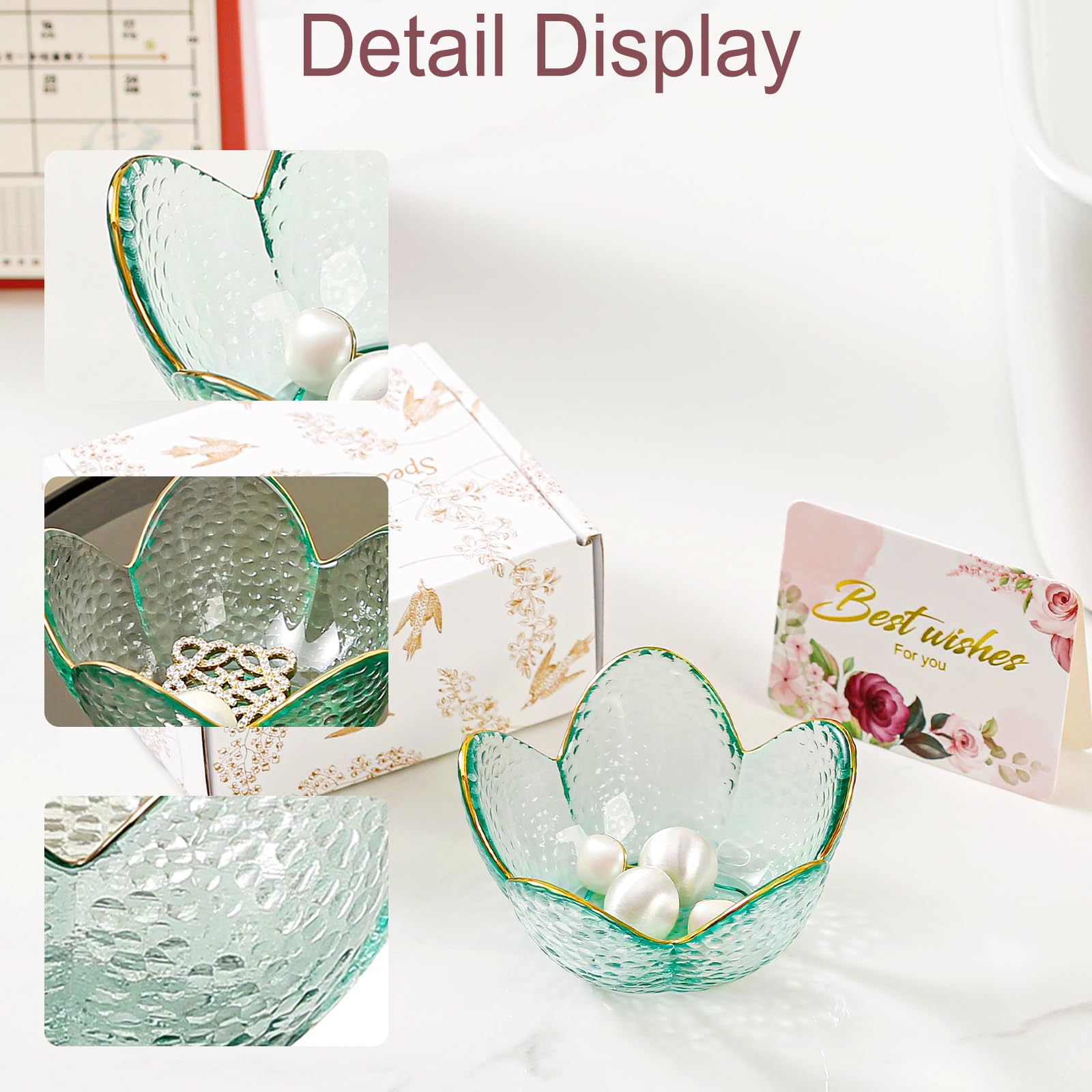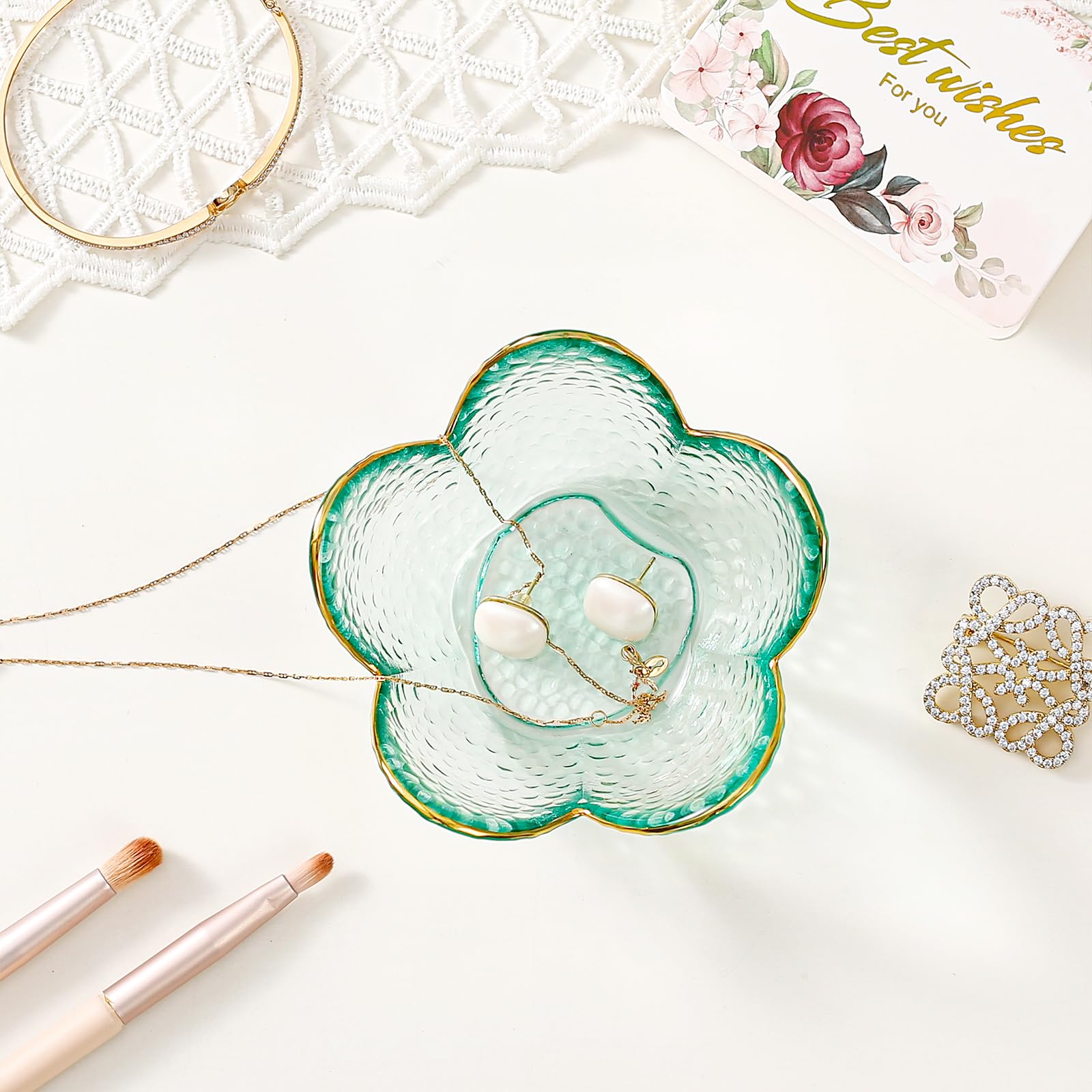 Room Decor Aesthetic Trinket Dish: This small folwer ring dish holder features a beautiful flower design to neatly organize your rings, earrings, necklaces, keys and other jewelry in style on a dresser, desk, bedside, nightstand, sink or vanity countertop. Small ring tray has a cute flower shape designed with gilded edges, crystal ring holder adds a touch of aesthetics to the room decoration.