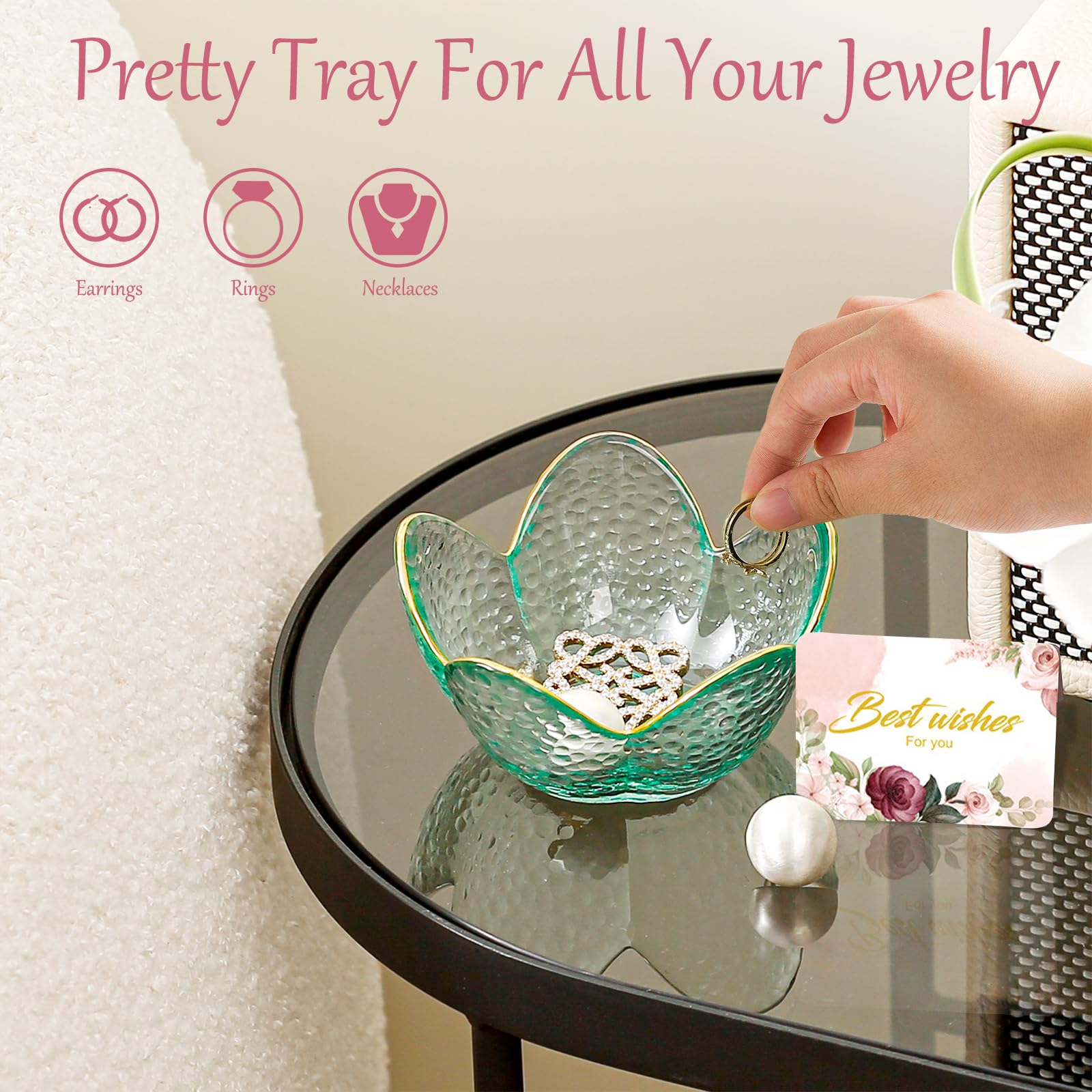 House Warming Gifts New Home: Small ring plate has open clear design allows you to easily add or remove items and help you quickly find the ornaments you need, also wipe clean the small ring dish with a dry cloth or rinse directly with water if needed to keep the jewerly dish looking its best. you can use this small flower jewlery tray storange your jewelry while you wash your hands, dishes, cook, do housework, shower or sleep.