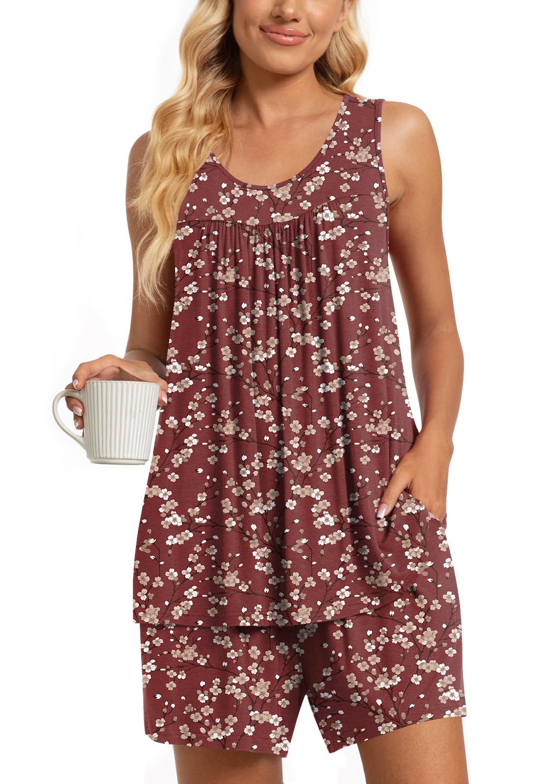 Fashion Simple Design: The ladies pajamas sets sleeveless tank tops with pleated, scoop neck design. Womens pajamas set tops perfect length covers what you need it to like your tummy. The bottoms are very roomy and fit nice with an elastic waistband adapting to different body shapes for all-night comfort. Pajamas bottoms have nice deep hidden pockets to hold cell phone or small things