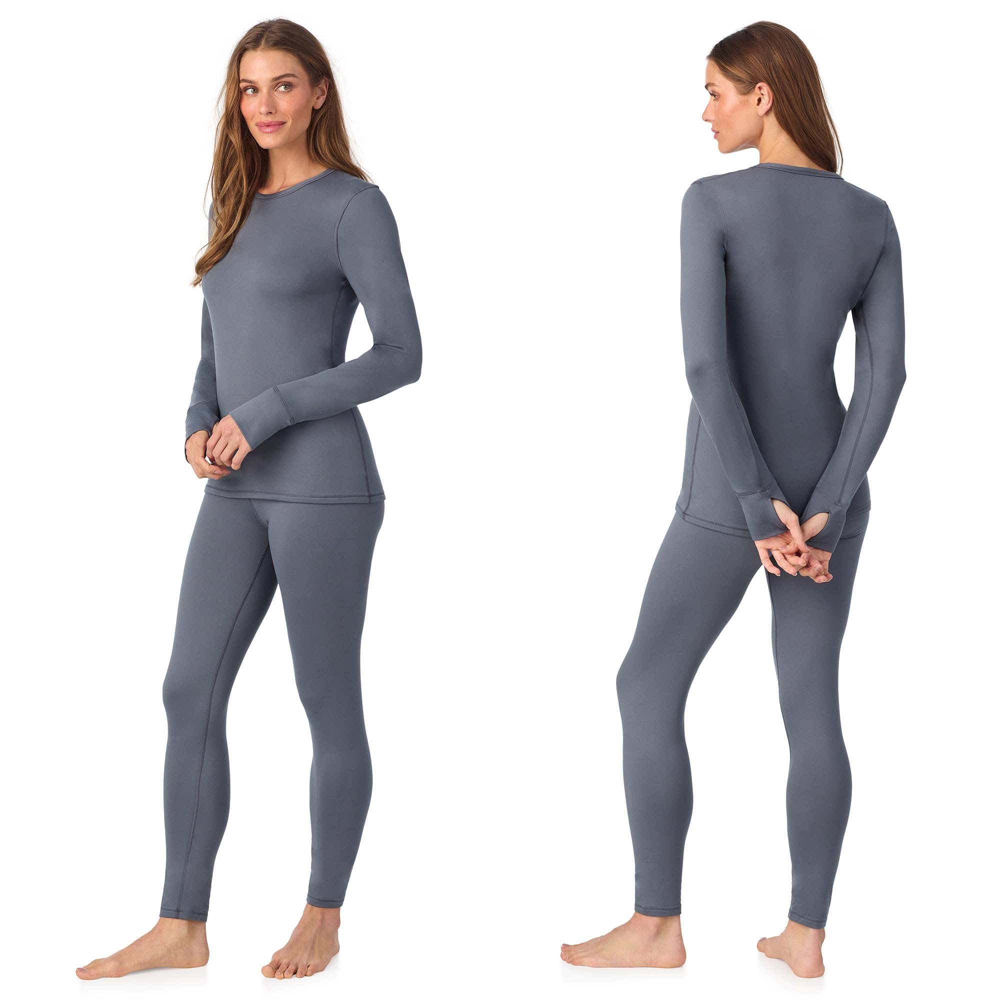 WARMTH IN MOTION: Designed to keep up with you on the go, this womens thermal shirt and leggings set features stretchy, flexible fabric for easy movement, a modern-rise waistband for a flattering fit, and functional thumbholes to lock in warmth. It’s tag-free for irritation-free wear and offers 50+ SPF UV protection - smart details for cold days with clear skies.