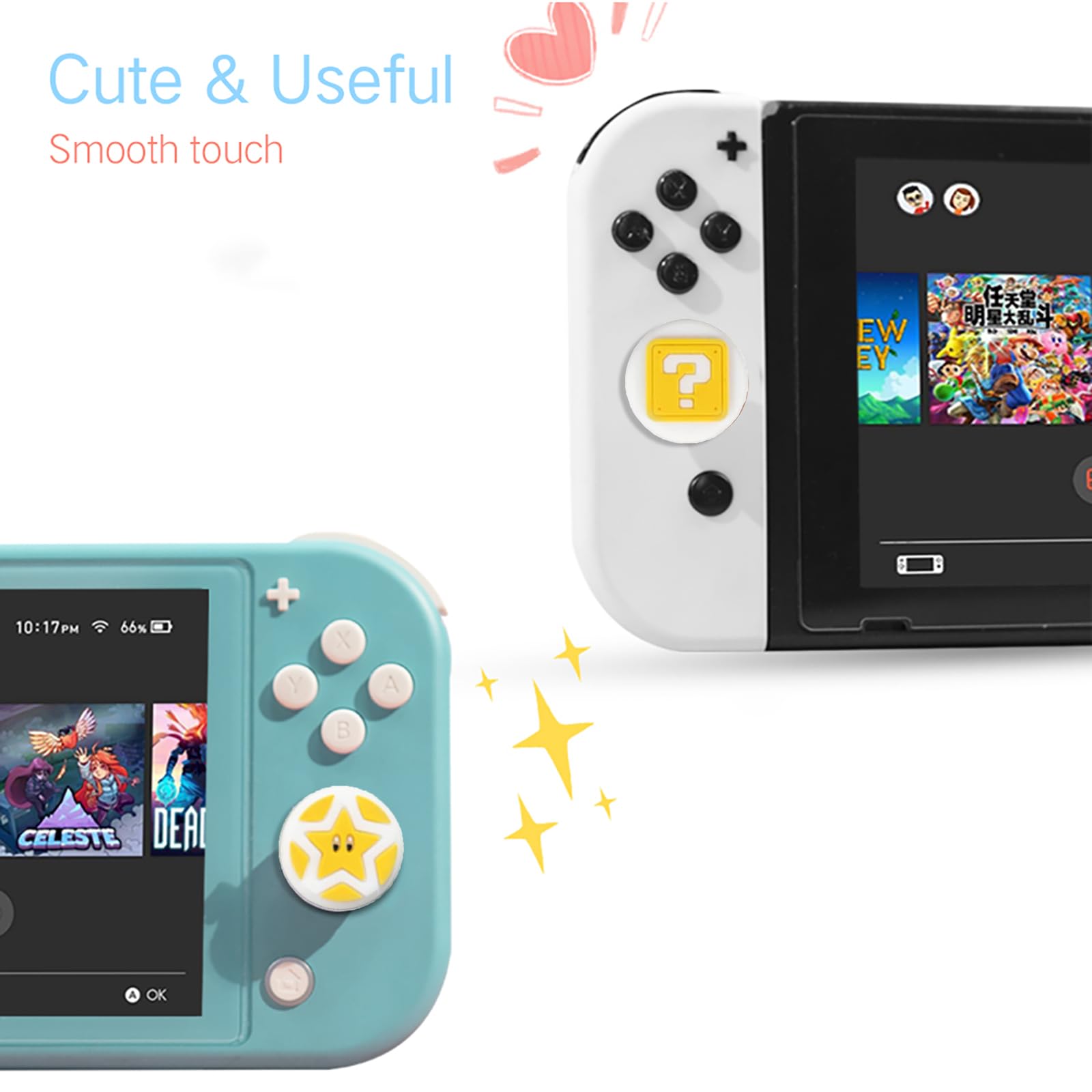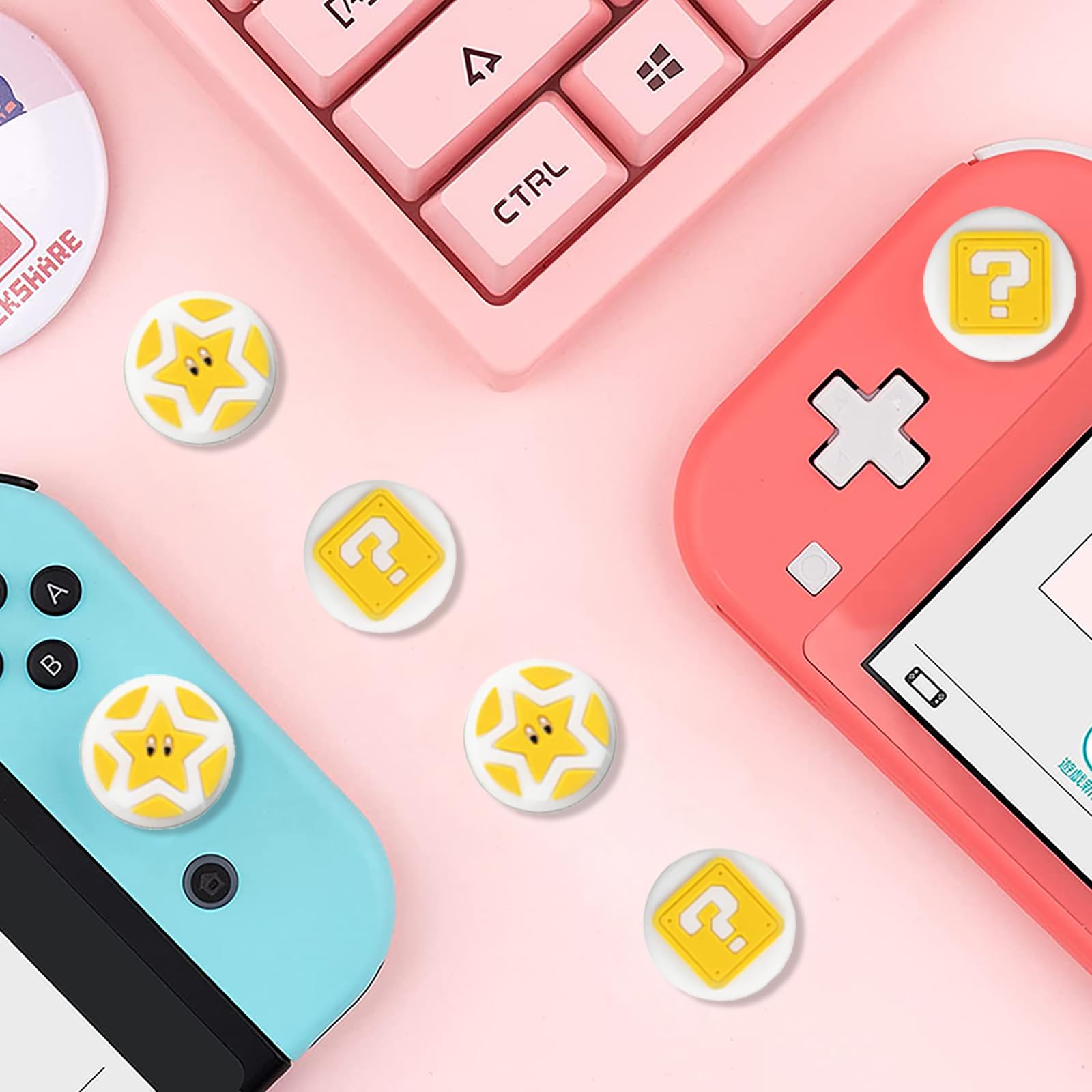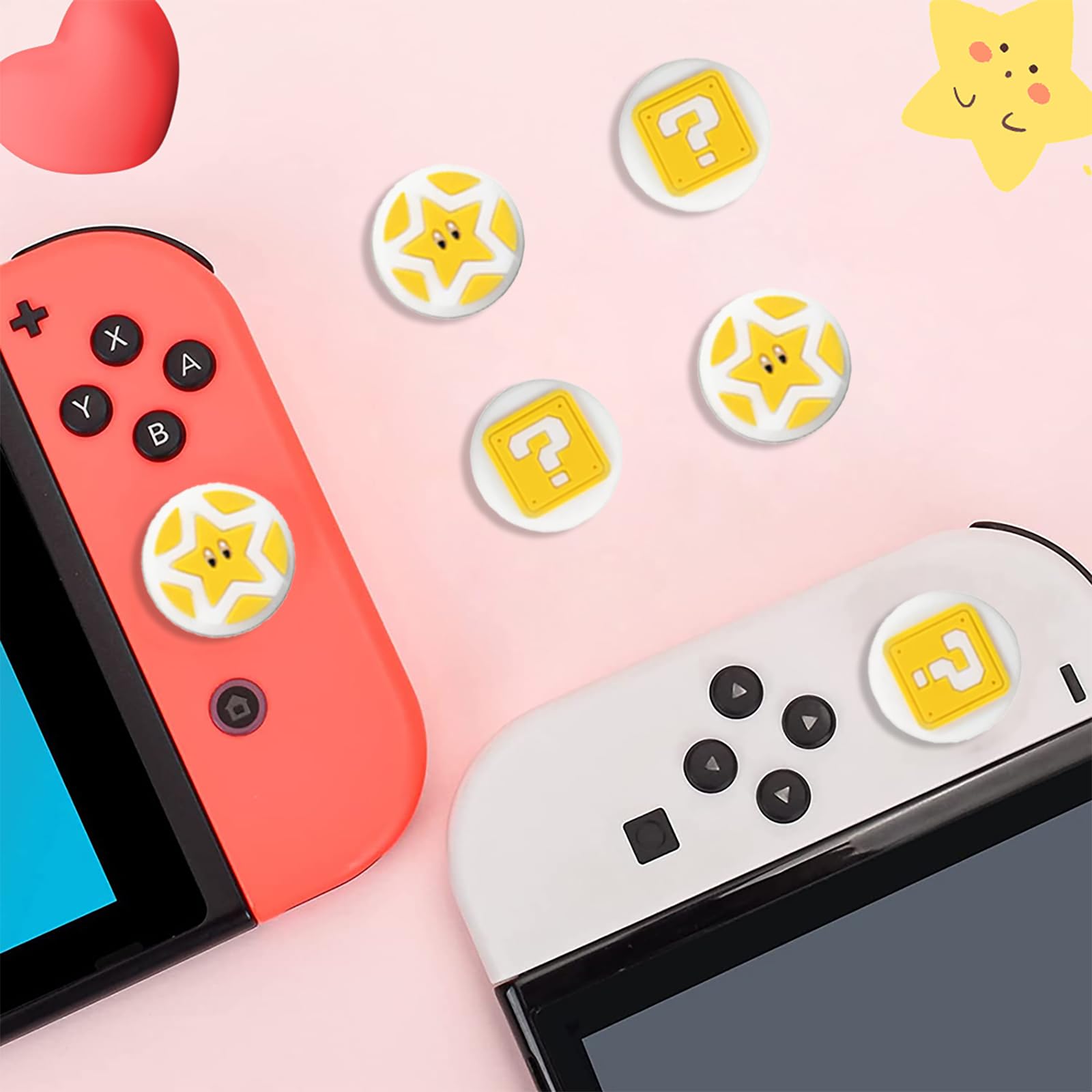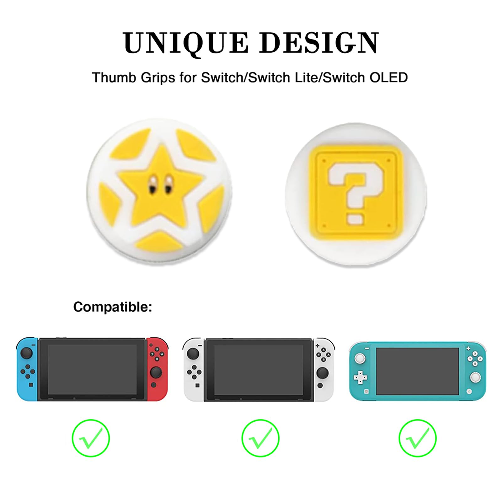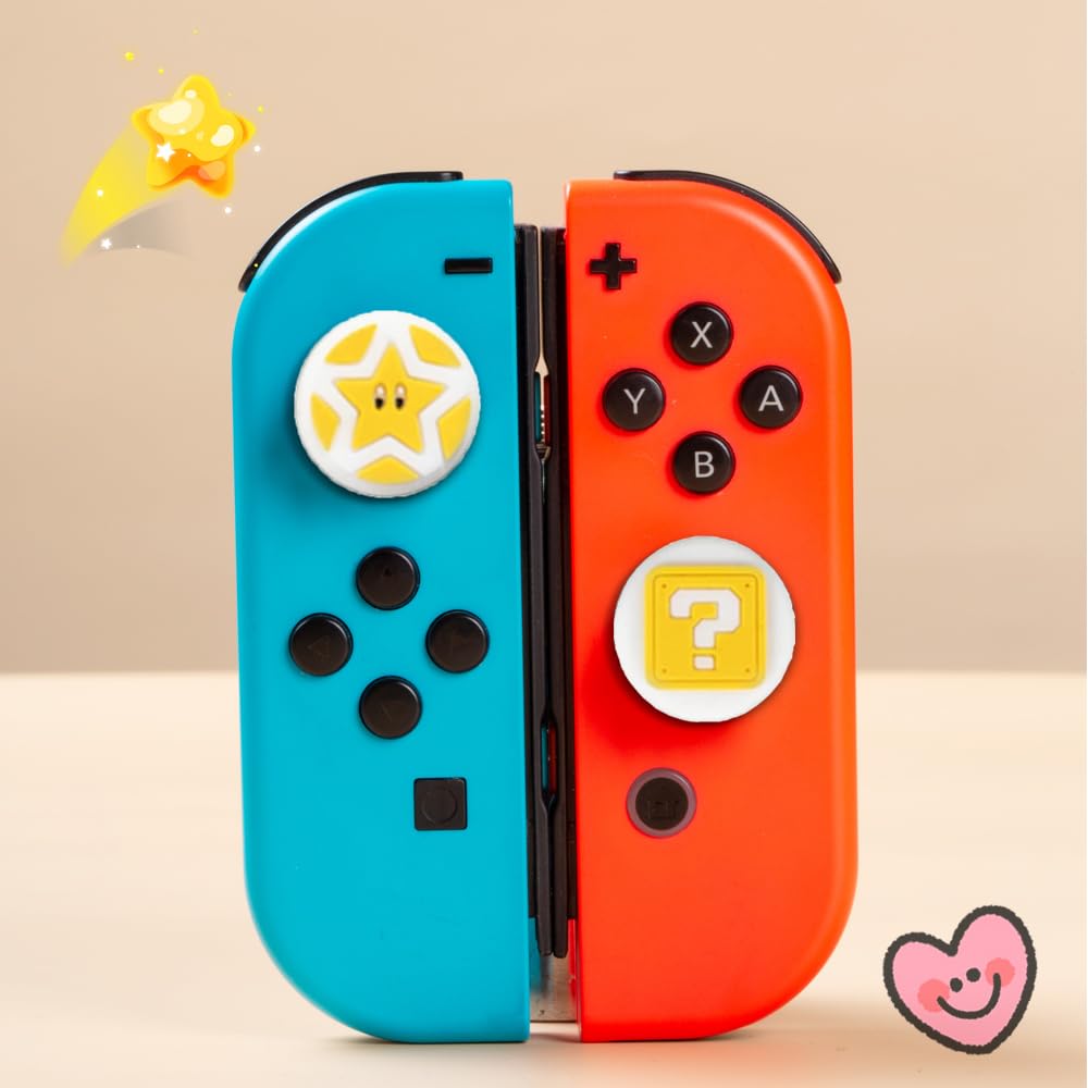 PERFECTSIGHT Cute Thumb Grip Caps 4PCS Compatible with Nintendo Switch & Switch Lite,Soft Silicone Cover for Joycon Controller (The Question Block) Features: Cute lovely design, eye-catching decoration-- Cute tree leaf design makes your Switch & Switch Lite more eye-catching. Perfect non-slip design -- Increase the friction between finger and controller. Prevent your fingers from slipping and provide more accuracy and sensitivity. Easy Installation -- Just turn the grips inside-out and pop over the sticks. Specification: Material: Silicone Compatible models: Switch & Switch Lite Package include: 4* Cute Thumb Grips Caps