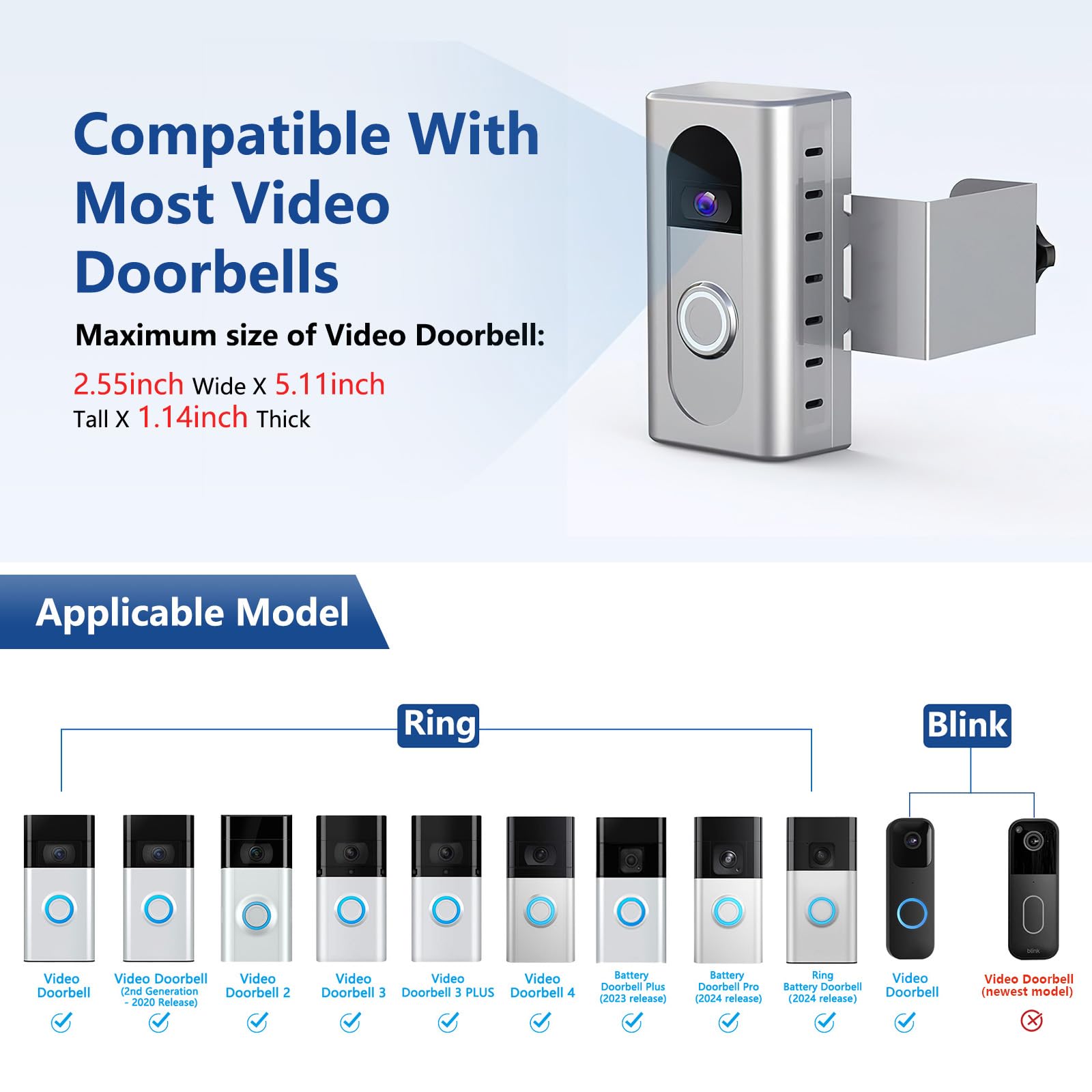 Compatible Doorbells: KIMILAR Anti-Theft Video Doorbell Mount suitable for RlNG Video Doorbell (1-4 generation) and RlNG Video Doorbell (2nd Generation - 2020 Release) and RlNG Battery Doorbell Plus (2023 Release) and BIink Video Doorbell. The size of the doorbell that can be placed inside is not more than 2.55inches Wide x 5.11inches High x 1.14inches depth. (Doorbell is Not Included in Package)