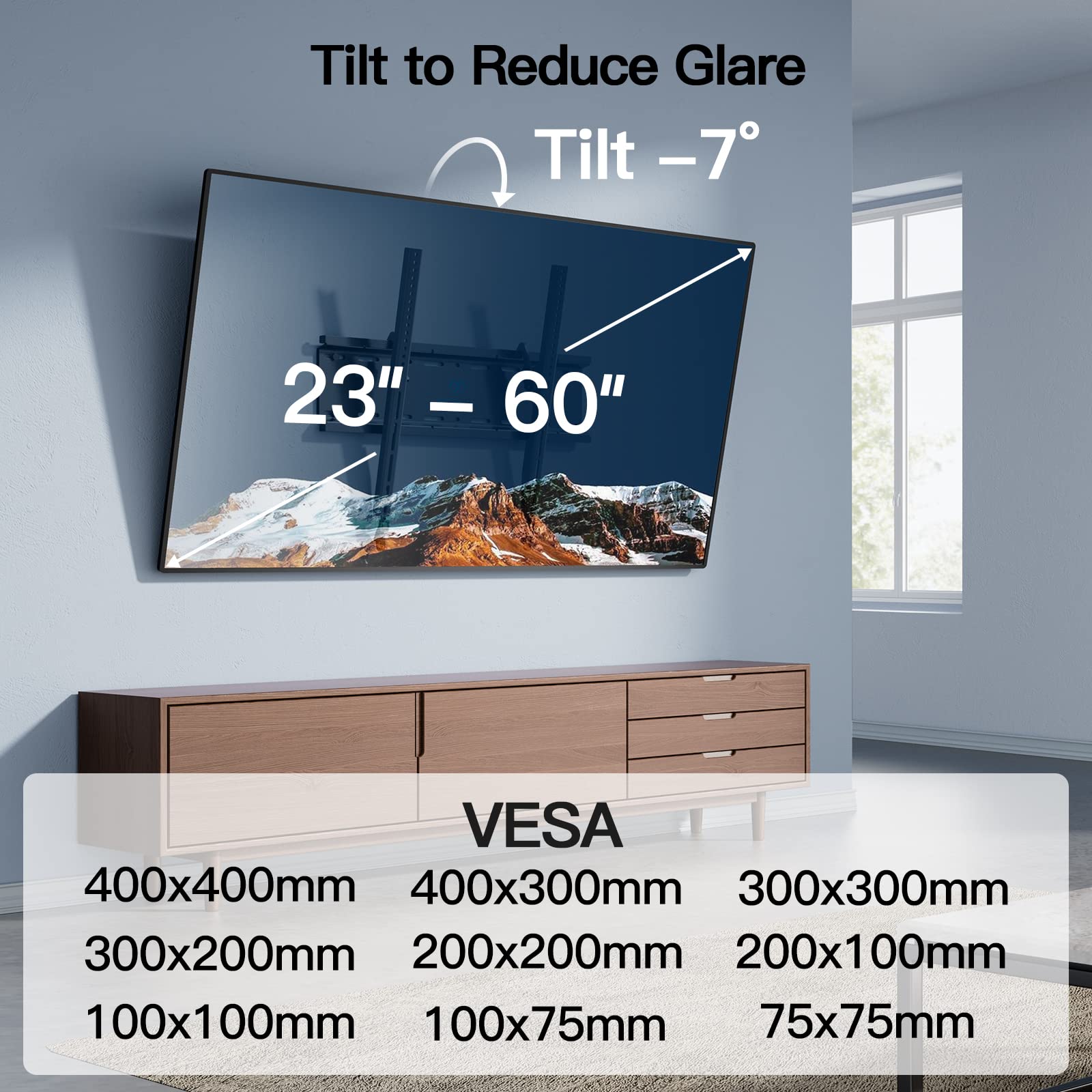 ENHANCED VIEWING: Tilt your screen down by 7° to enjoy an optimal viewing angle while avoiding glare from light sources. This tilting wall mount feature enhances comfort for the best line of sight, making it easier to watch entertainment without straining your neck or eyes.