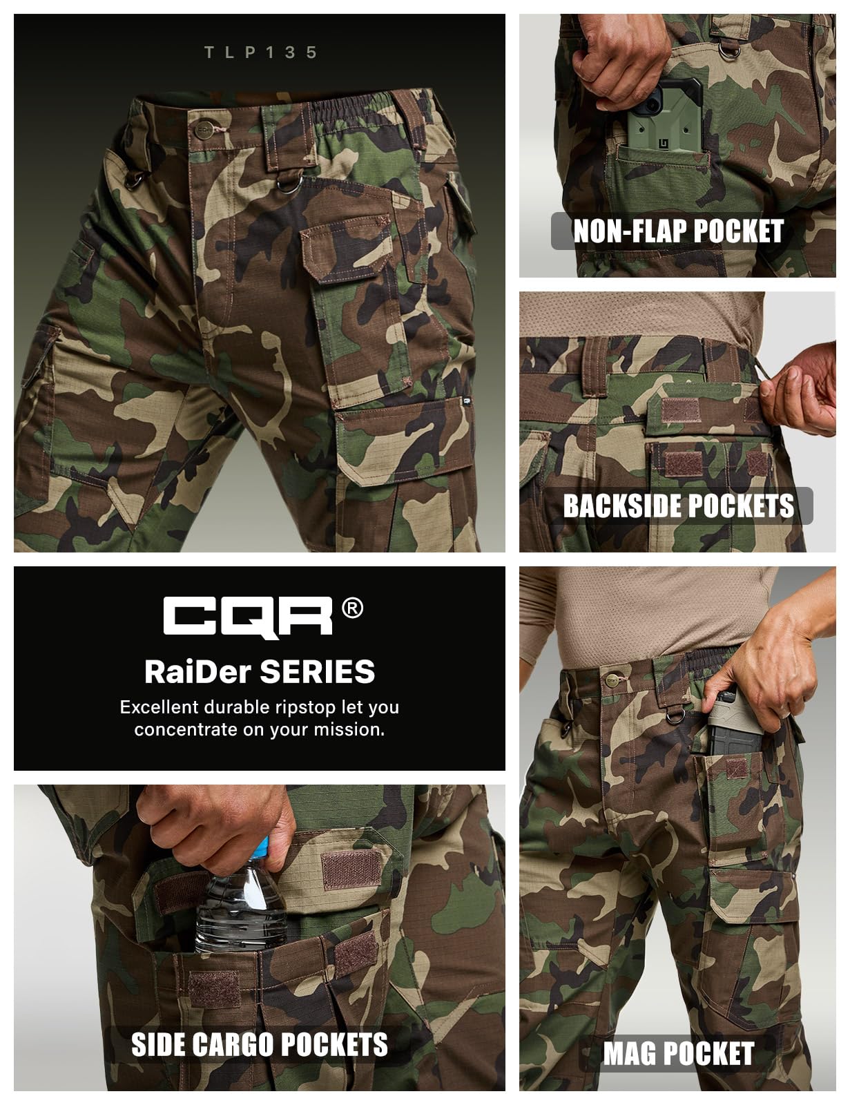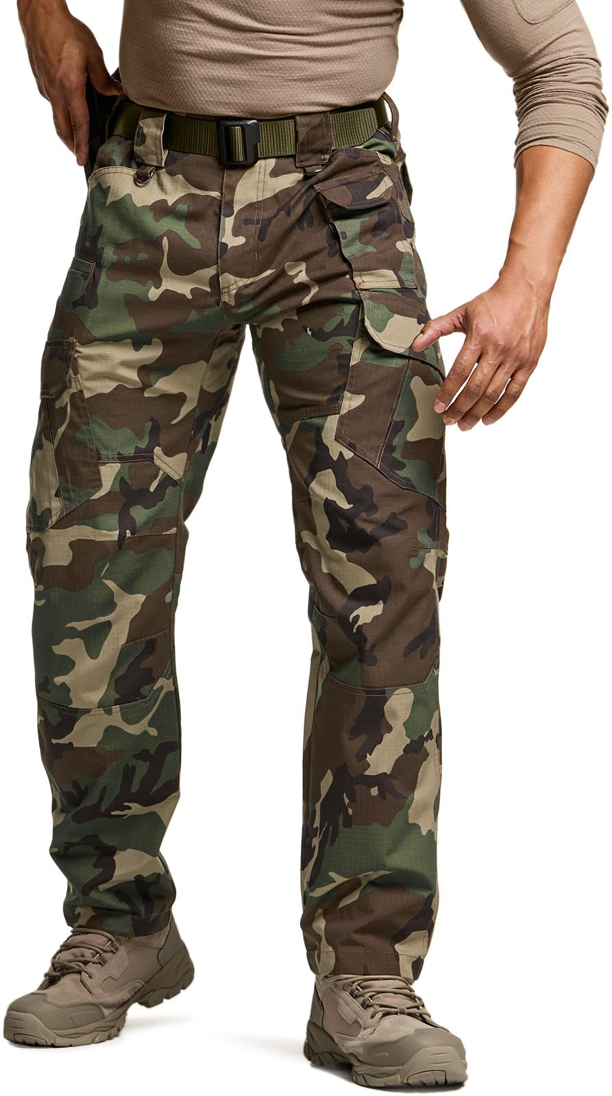 Description CQR Men's Tactical Pants Series Suitable for tactical, combat, military training, fishing, climbing, hiking, motorcycling, and outdoor activities *** Exclusive Tactical Belt is NOT included *** Materials Mix of Polyester & Cotton (Ripstop Fabric) is breathable, wrinkle-free, comfortable Duratex Ripstop Fabric Ripstop fabric has excellent durability and has water-resistant and stain-resistant Elastic Waistband Side waistband is to make a secure fit and support the active movement Tactical Layout Multi-purpose cargo pockets allow carrying various tools and equipment without having to hold them in your hands Button and Zipper Closure High-strength and high-density the Metal Alloy Button and Zipper along with a durable mounted stopper