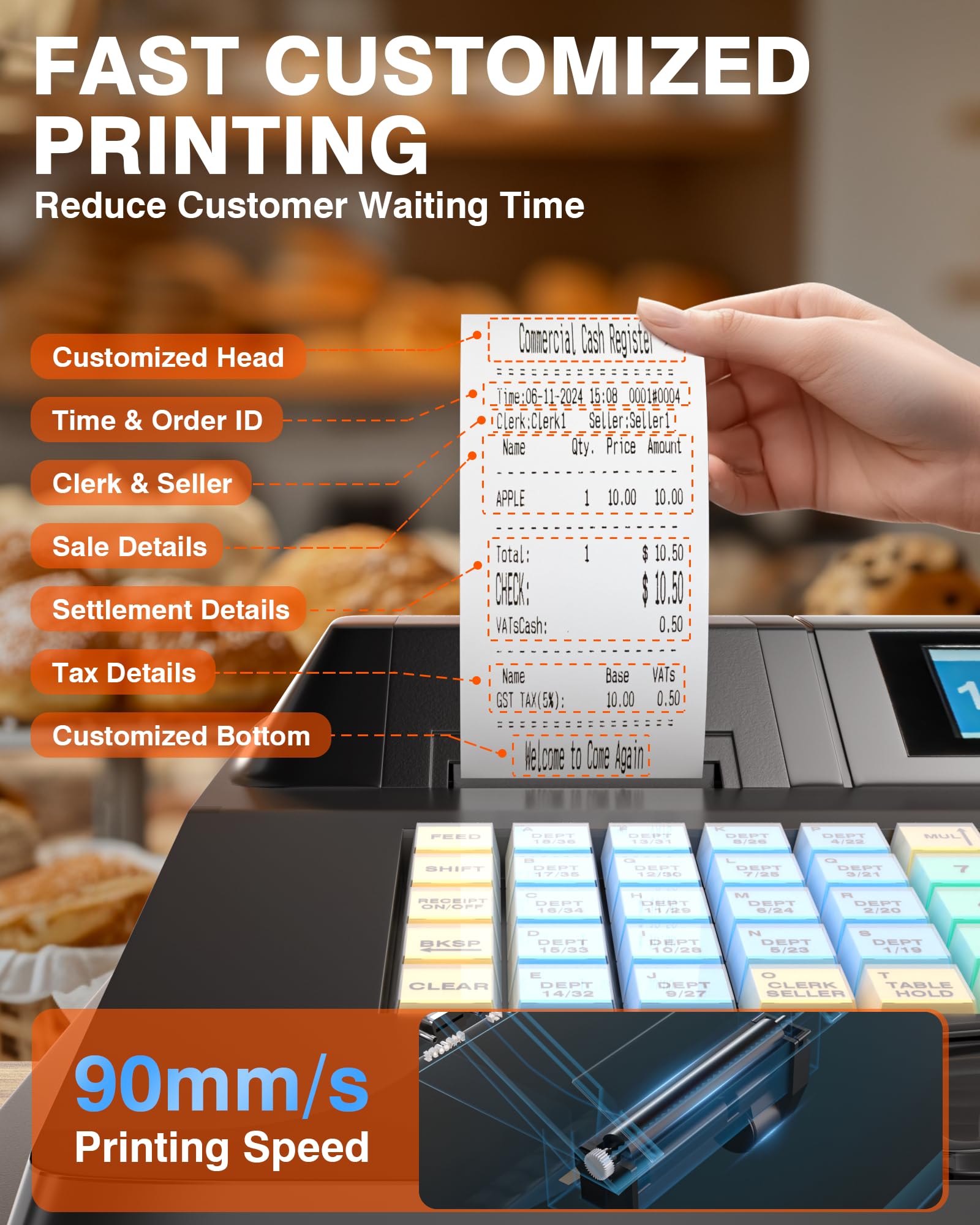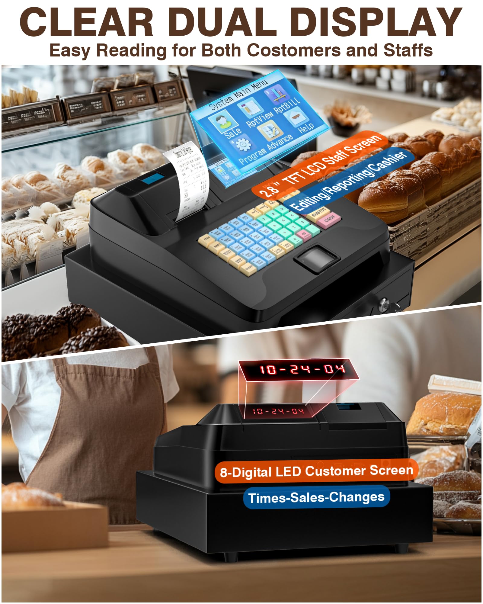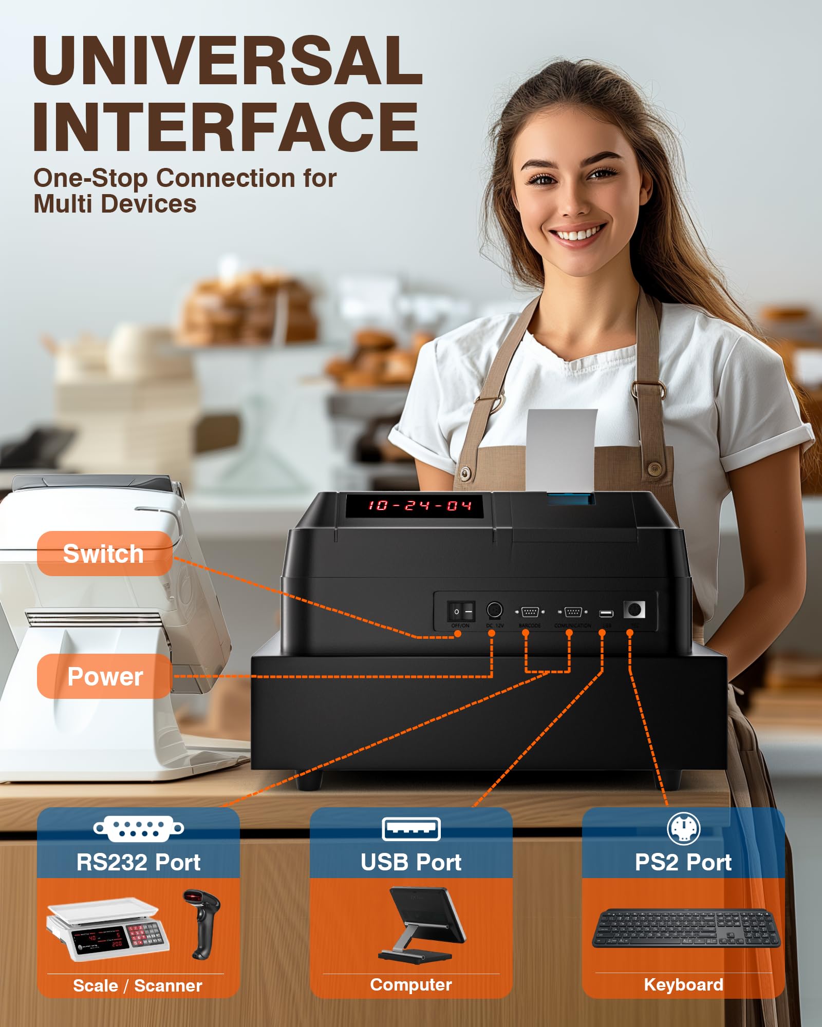 MULTIFUNCTIONAL ALL-IN-ONE DESIGN The PYY cash register integrates a receipt printer, dual screens, and a cash drawer, saving you time and cost. The built-in thermal printer has a print speed of up to 90mm/s, reducing customer wait times. It features a 2.8-inch TFT LCD for the cashier and an 8-digit LED display for customers. The integrated cash drawer pops open during transactions.