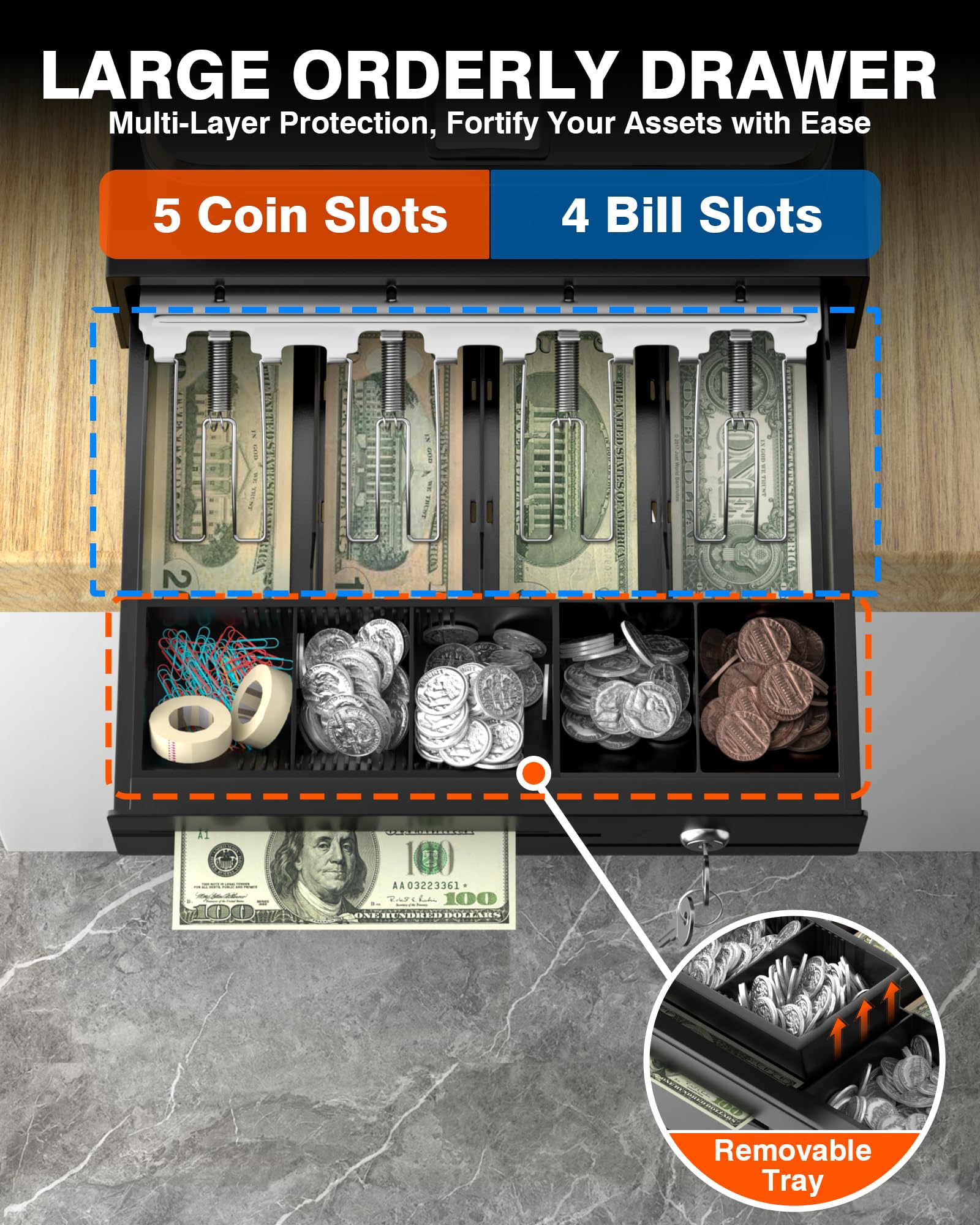 SECURE DESIGN Supports up to 50 cashiers with individual passwords and comes with 6 cash drawer keys for dual security. The cash drawer has 4 bill slots and 5 coin slots, keeping everything organized. The ABS material casing is waterproof and oil-resistant, suitable for a variety of environments. Dimensions: 33.5*38*20.9cm/15"*13.2"*8.2"; Power: 36W; Voltage: AC 100-240V/50-60Hz. DC 12V/3A.