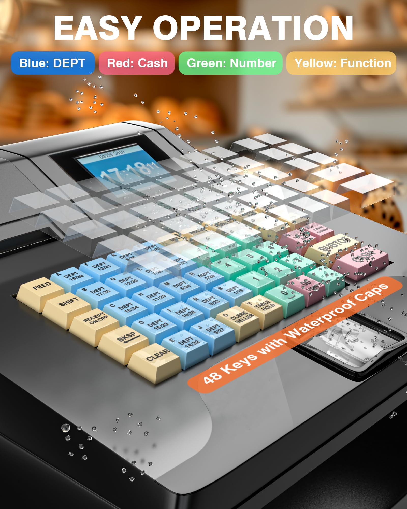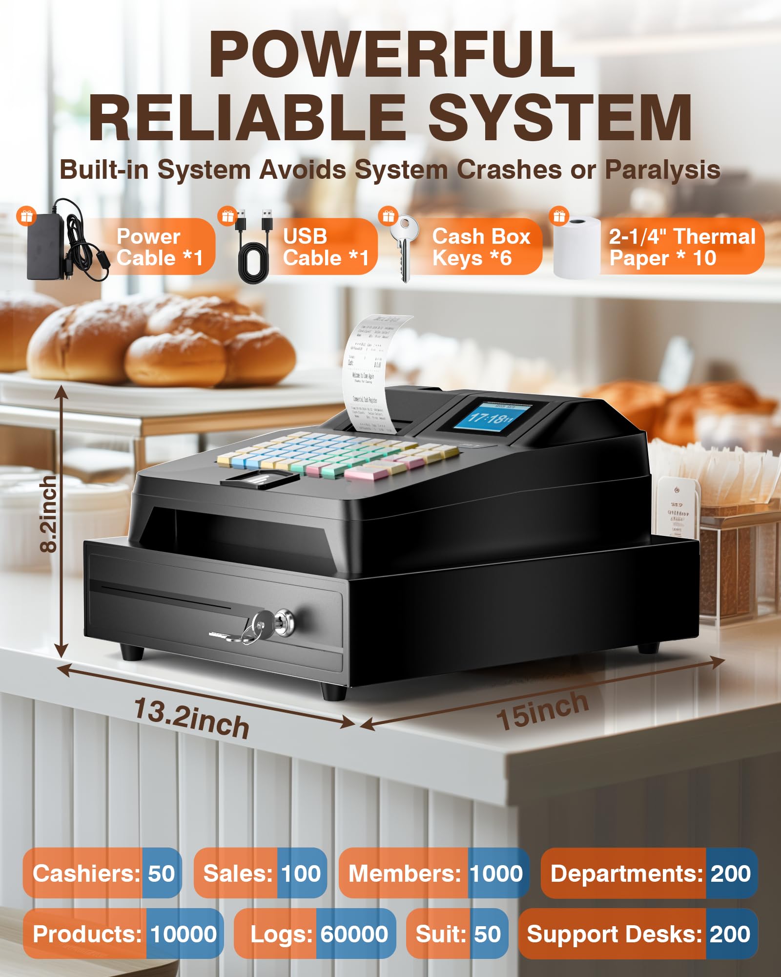 WORRY-FREE SERVICE The PYY cash register has passed both RoHS and FCC certifications. Package includes the cash register, 10 rolls of 2 1/4" thermal paper, USB cable, power cord, 6 cash drawer keys and user manual. Ideal for small supermarkets, convenience stores, and restaurants. We offer a one-year coverage and professional one-on-one technical support. Please reach out to us if you encounter any issues.