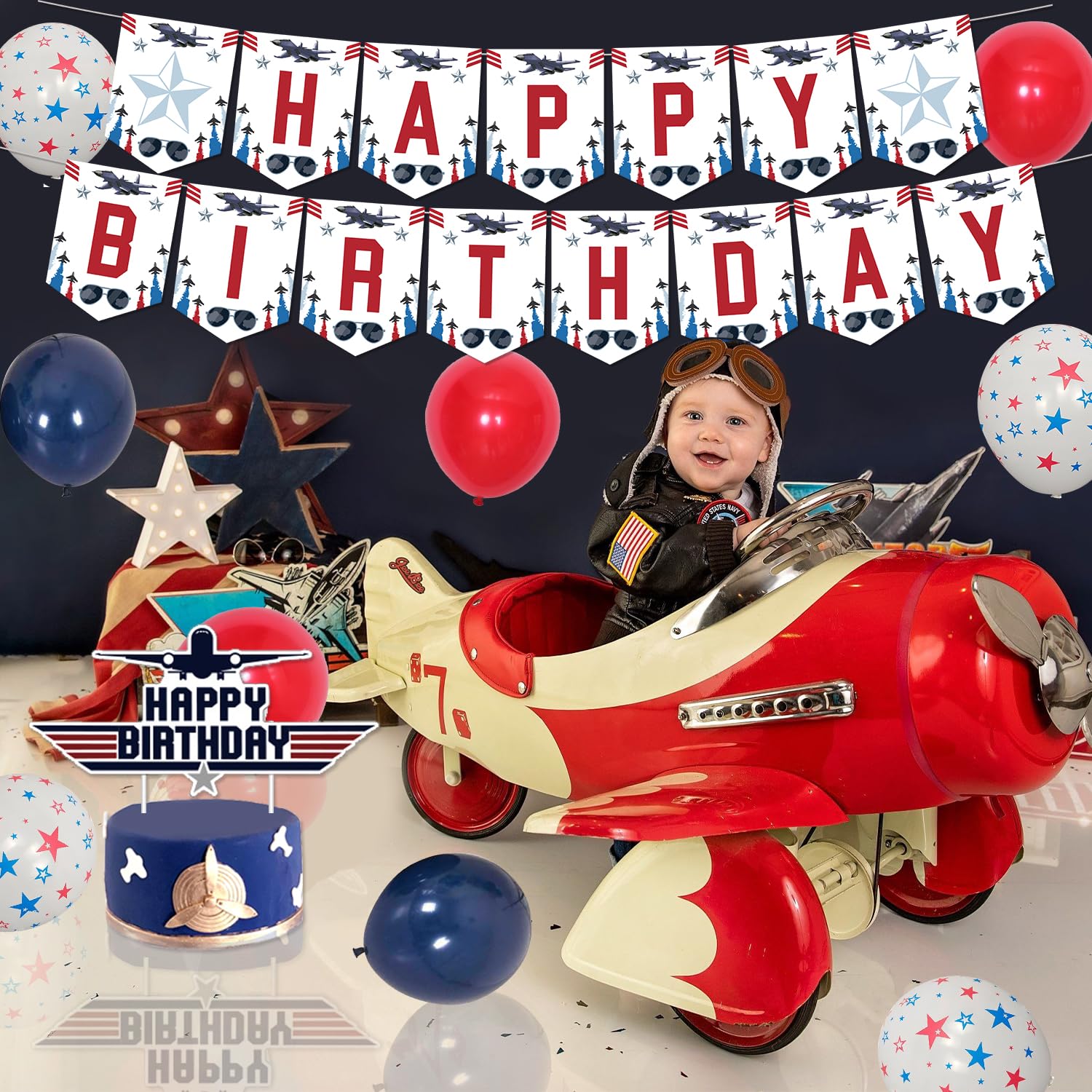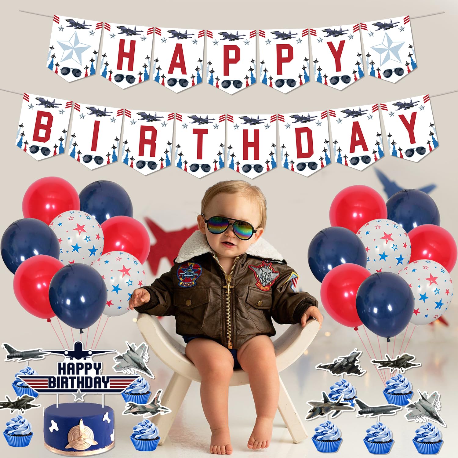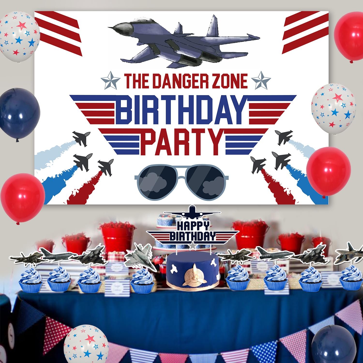 FIGHTER JET BIRTHDAY SET: This set includes 52 pieces, including 1* HAPPY BIRTHDAY banner, 1* Fighter plane theme backdrop, 12* Fighter plane cake toppers, 1* Big cake topper and 18* Latex balloons(12inch). It also contains some accessories to help you better assemble this set.